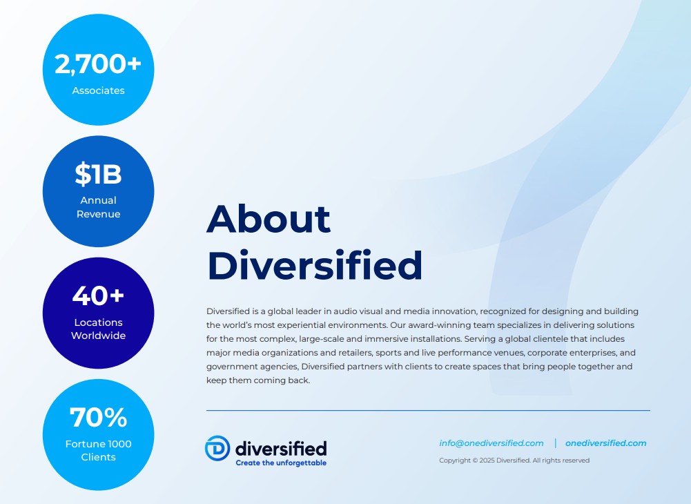 OneDiversified is a leading global technology solutions partner that designs, builds, integrates, and supports immersive audiovisual and digital experiences that elevate how people communicate, collaborate, learn and engage with spaces. We partner with architects, designers, general contractors & clients across corporate, education, healthcare, sports, entertainment, hospitality, and public sectors to create connected environments where technology enhances human interaction, productivity, and experience - from strategy and design through installation & lifecycle support.