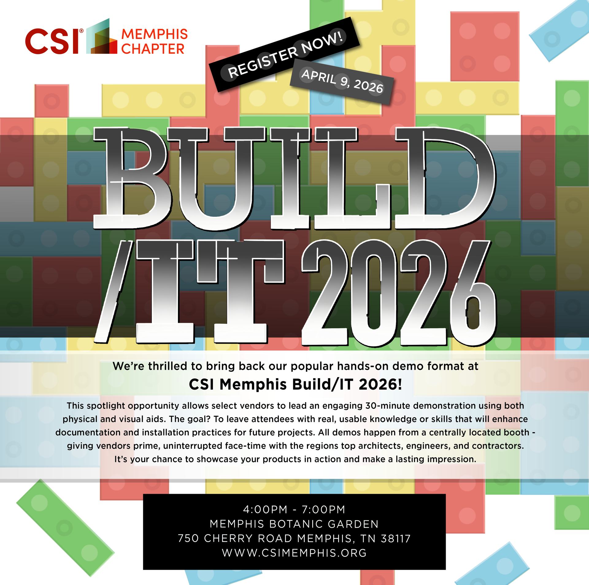 Come join CSI Memphis for our Annual Build-It Products Display show! The show will be held at the Memphis Botanic Gardens again this year on April 9th, 2026, and we are looking forward to hosting a great turn out. Don’t miss the latest and greatest offered for designers and builders of all ranges. Be sure and register or sign up for a booth / demo slot today.