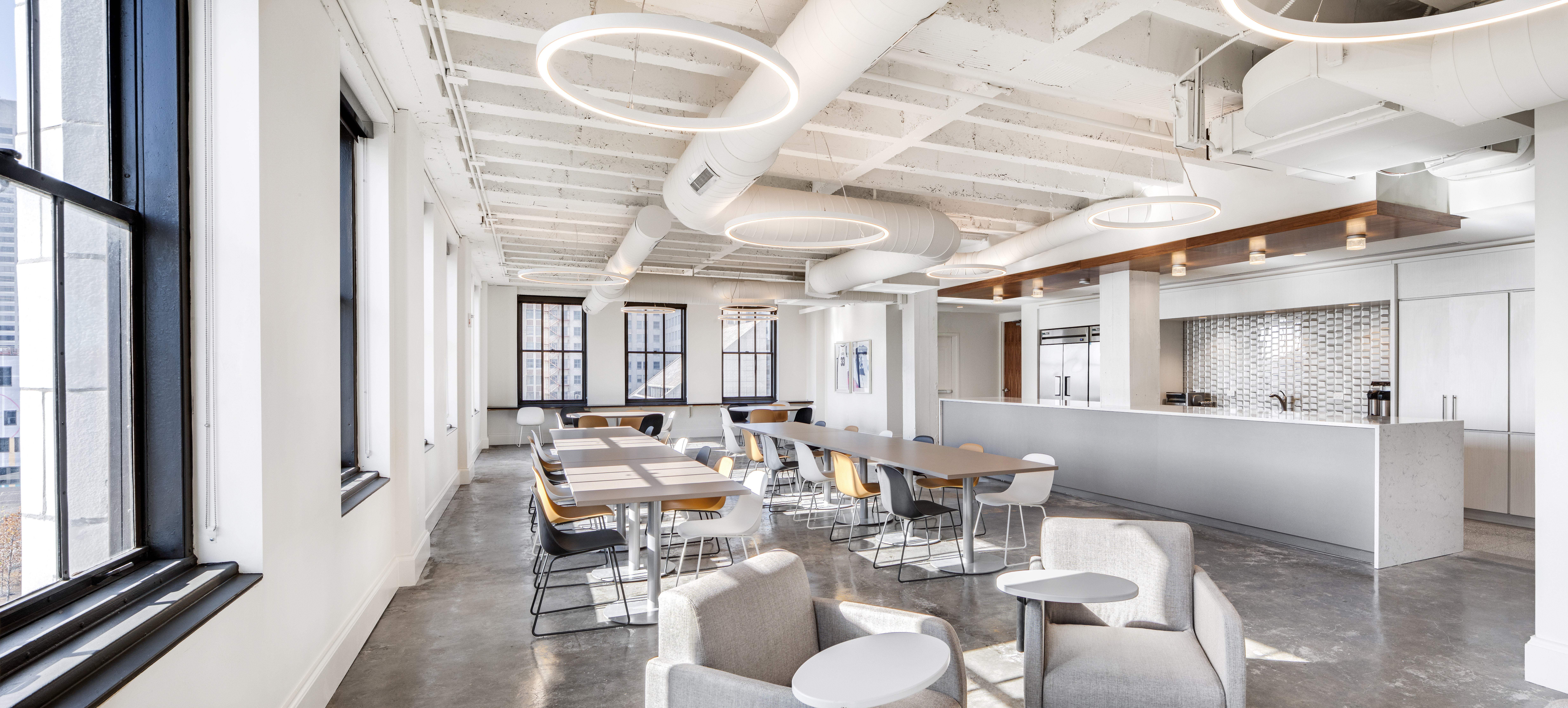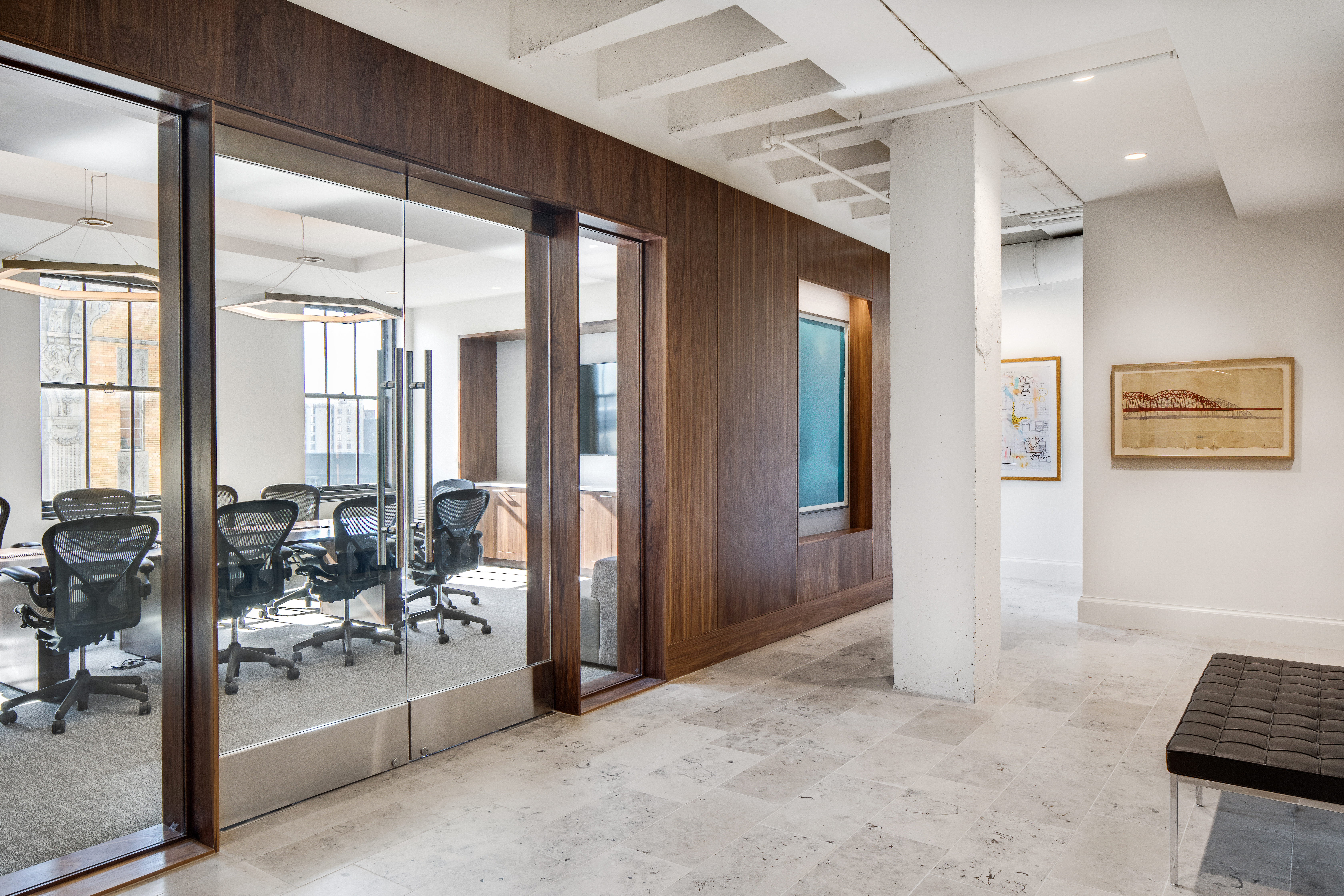 8 - Office space grouped to the exterior walls, as conceived in the original building plans, maximizes natural light and views across downtown. With simplified, elegant materials in-keeping with the 1920’s design era, the modern office is seamlessly inserted into this renovation. Photo by Chad Mellon