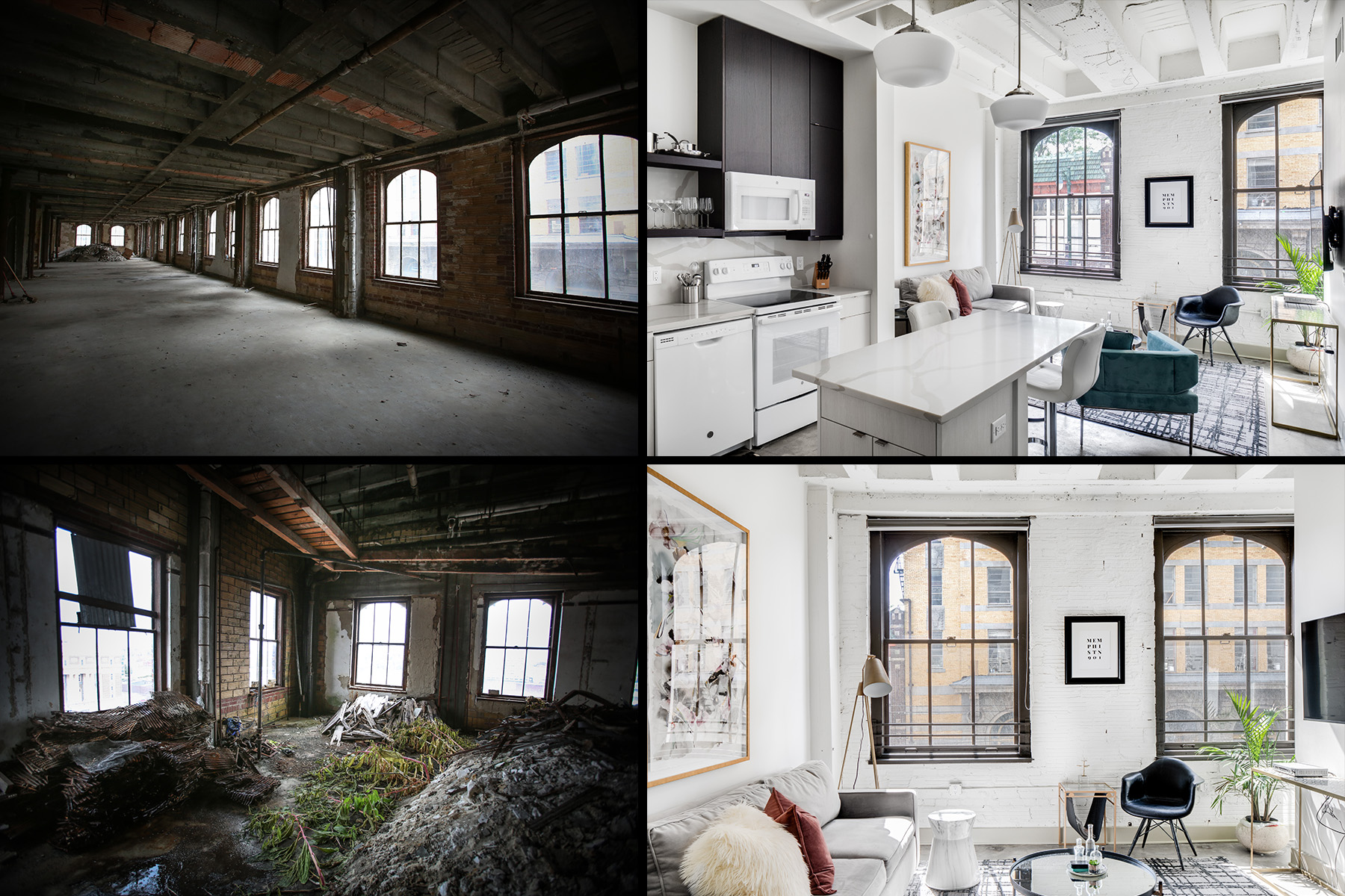 5 - Despite fire and neglect, the building’s basic plan remains intact. Offices and apartments grouped to the exterior walls with support spaces located within the central service core, resulting in tremendous natural light-filled spaces. Photos by Jamie Harmon (left) and Chad Mellon (right)