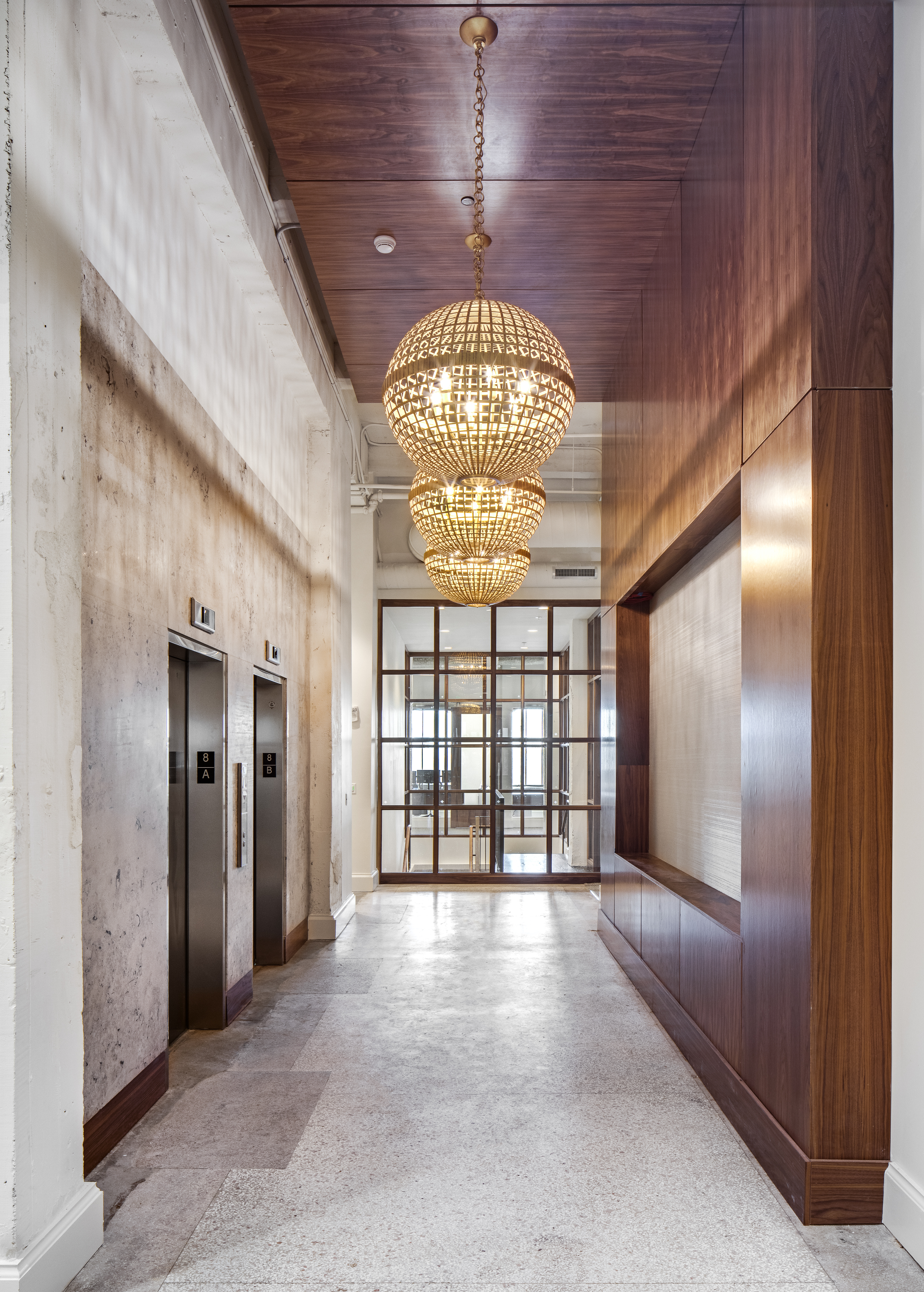 7 - Reinvigorated existing elevator lobbies draw inspiration from original 1920’s design era with restored terrazzo floors and limestone wall panels. Photo by Chad Mellon
