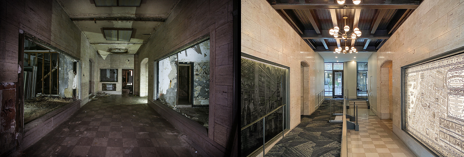 3 - Careful peeling away of periodic renovations reveal original ceiling detail. Custom light boxes inserted into the existing lobby retail windows, artully convey the life and prominence of the building during the 1920’s. A sloped walking surace was incorporated into the lobby design to maximize accessibility throughout the ground floor’s multiple level changes. Photos by Jamie Harmon (left) and Dalton Green (right)