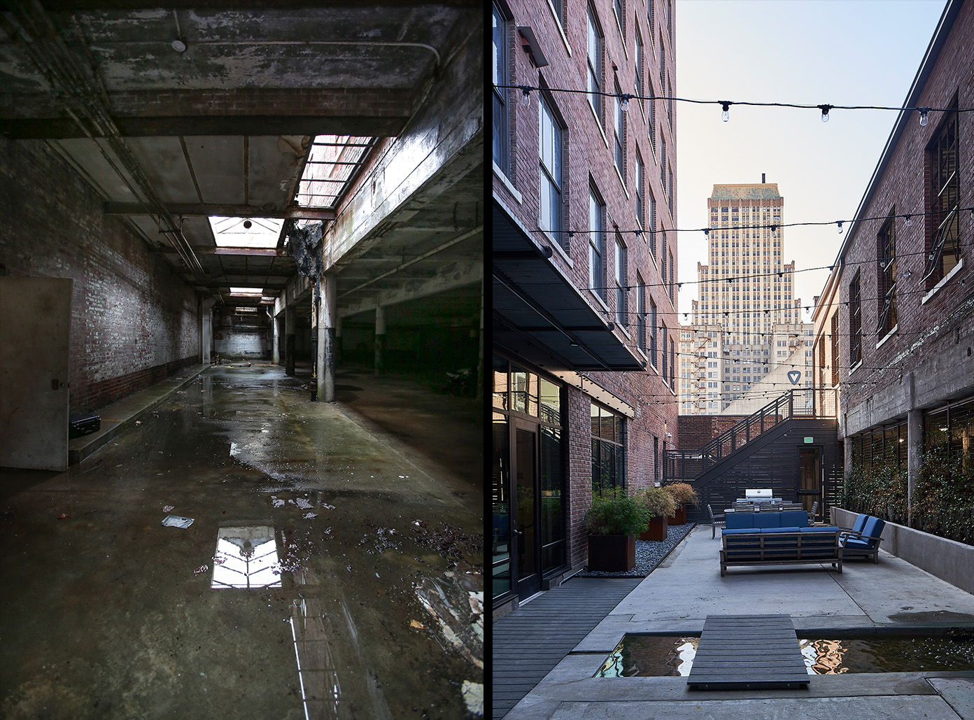 4 - Removal of narrow service alley to create charming courtyard between building and existing garage. Photos by Jamie Harmon (left) and Nicholas McGinn, Jr. (right)