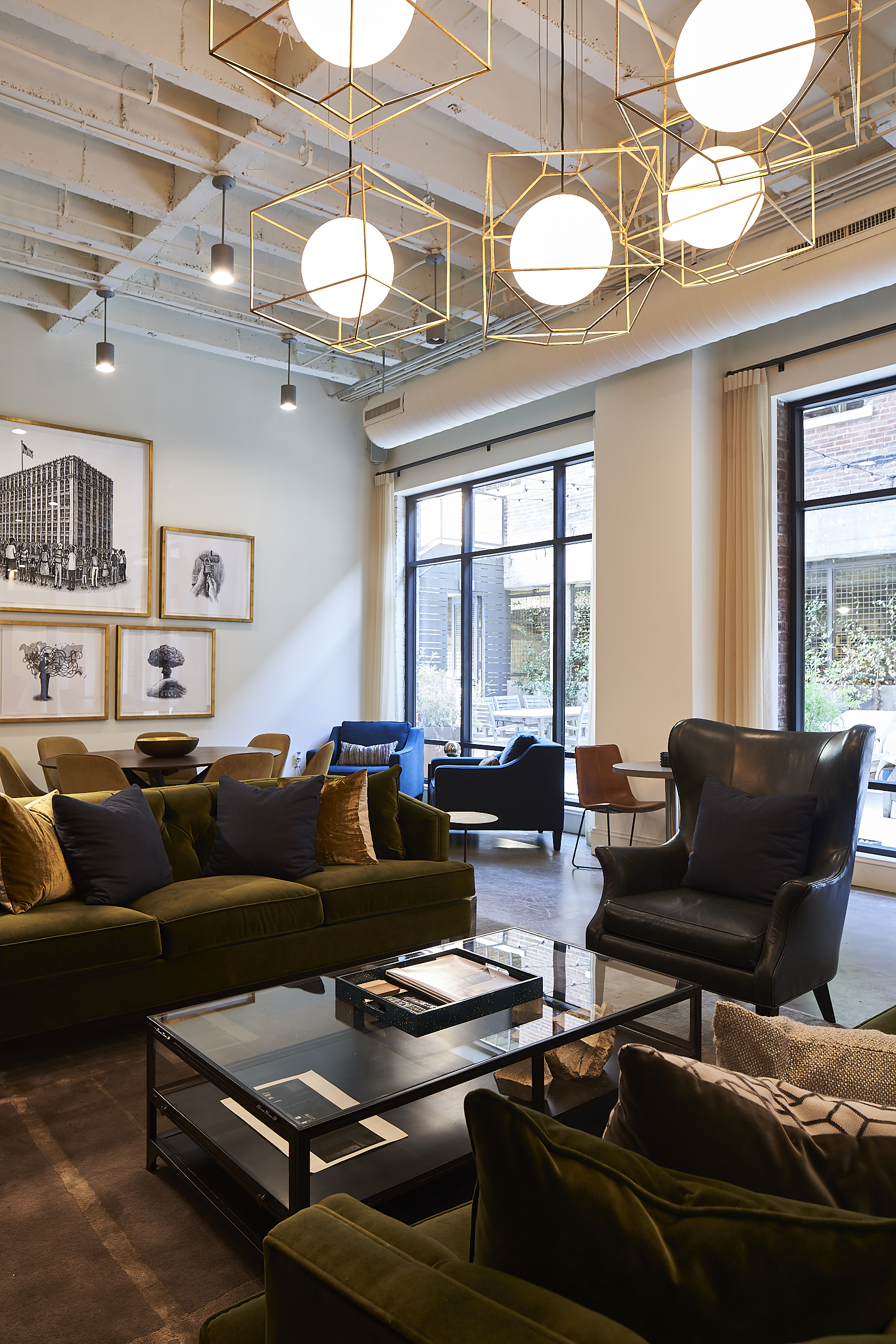 6 - Gathering lounge connects to internal courtyard to create communal spot for building residents, tenants, and neighbors. The design team’s careful organization of building infrastructure allows most of the concrete structure to be fully expressed and the exterior walls to be permeable. Photo by Nicholas McGinn, Jr.