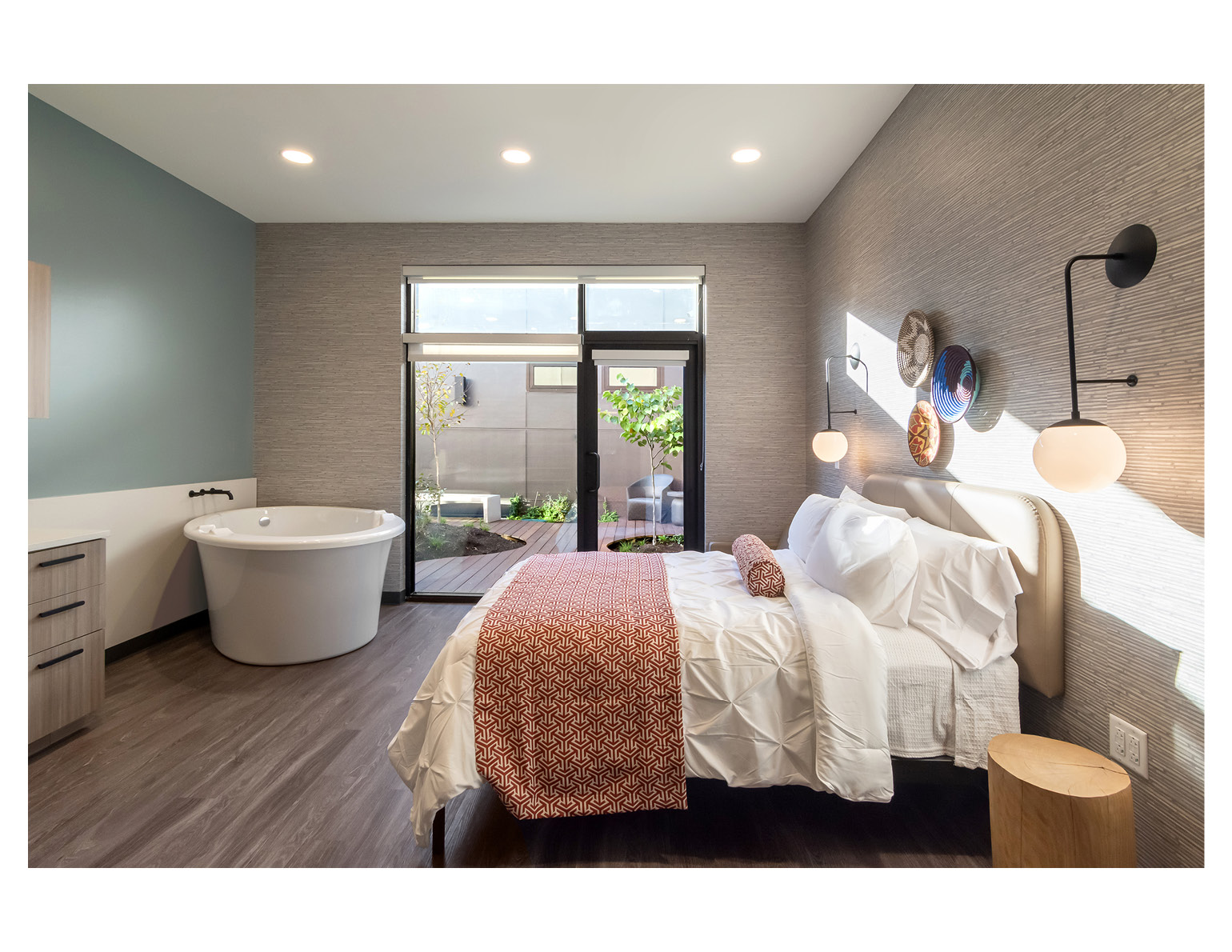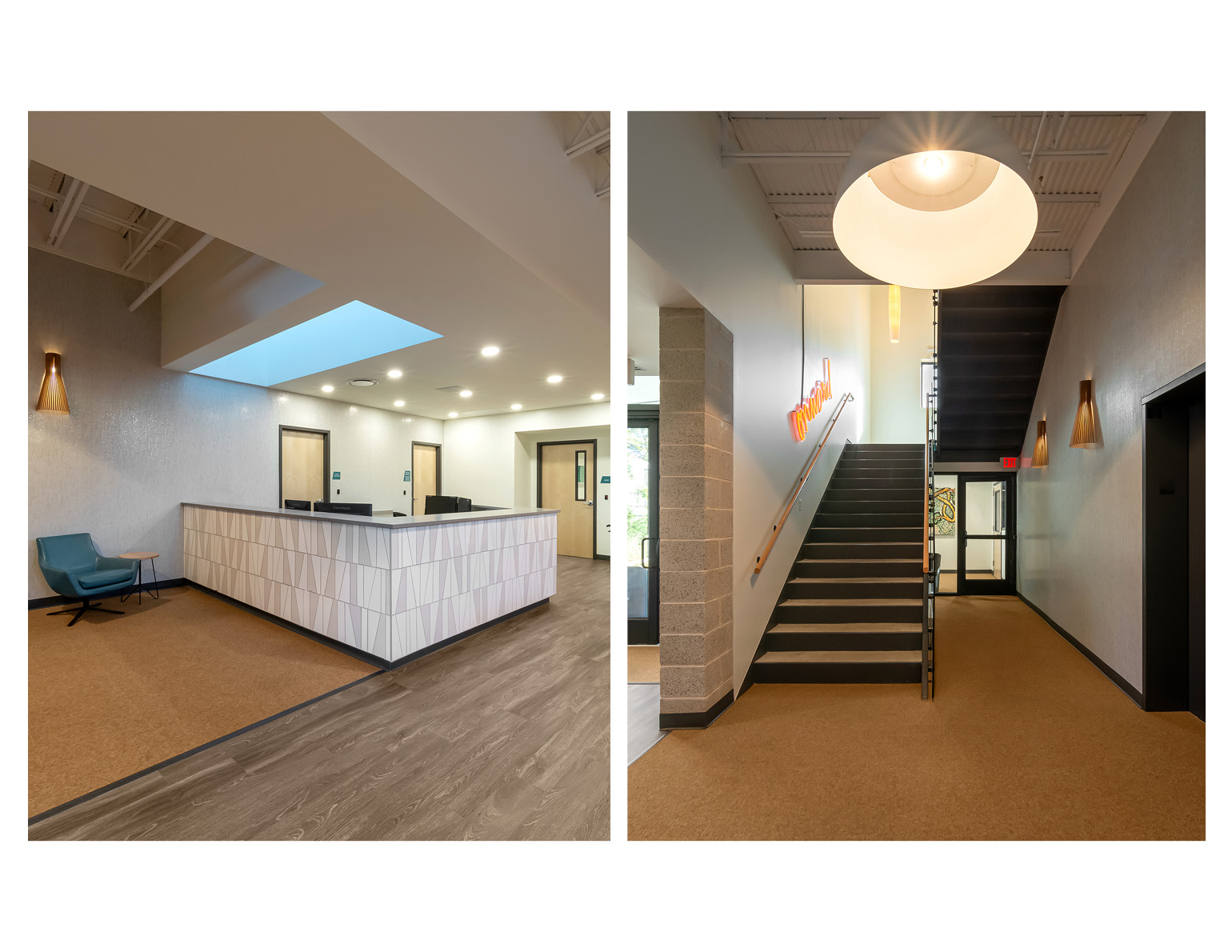 On the interior, efforts were made to welcome guests and patients with soft, thoughtful materials and textures, which when paired with ample daylight are more evocative of hospitality spaces than medical spaces. Guests are encouraged to use the stairs, the most prominent of which is easy to locate, well lit, and features artwork and an oversized landing.