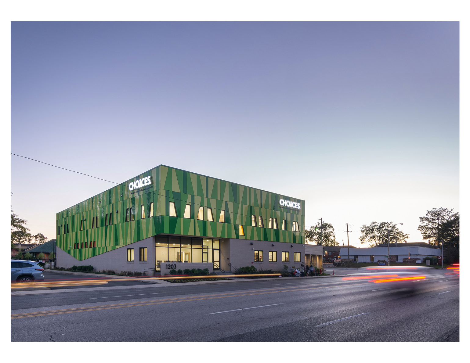 During the design process, the owner acquired a narrow parcel fronting on the adjacent Bellevue Blvd. This resulted in an L-shaped lot with two street frontages (notched at the intersection). Protestors historically chose the busier “front” of the building, prompting the design team to flip the entry/exit to Bellevue, thus allowing patients and staff much improved privacy and safety. The building responds in kind with its most generous entry on the “back” where a large porch welcomes patients. Large doors (similar to those used in automobile showrooms) can be opened on nice days or during special events.