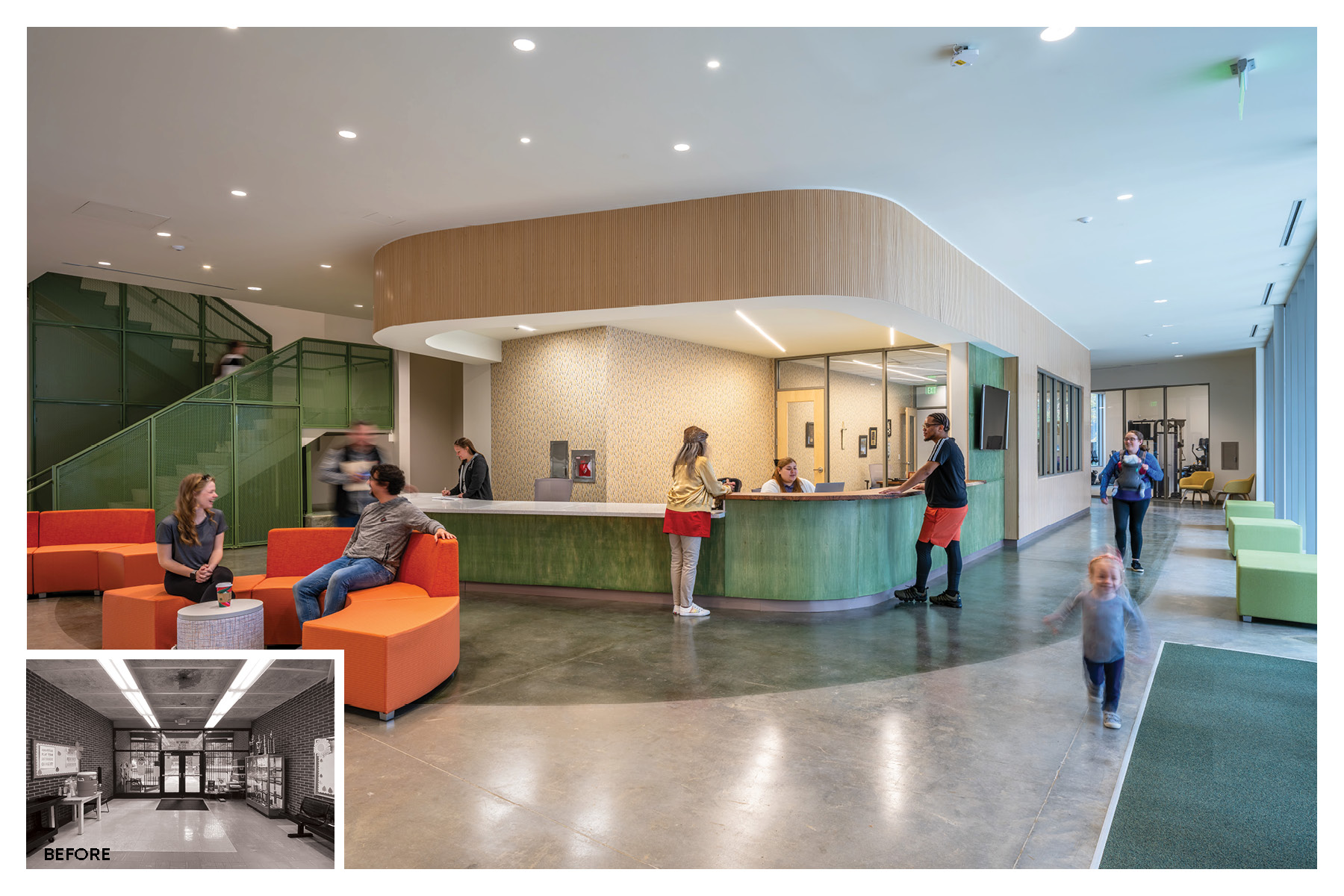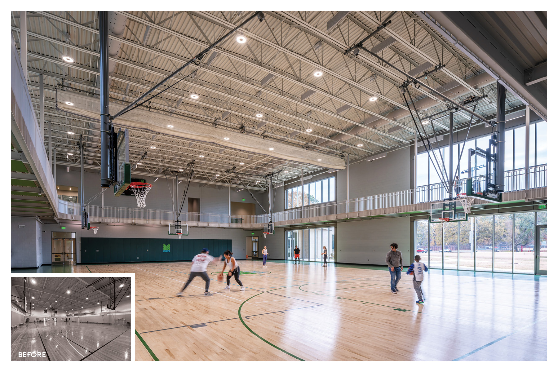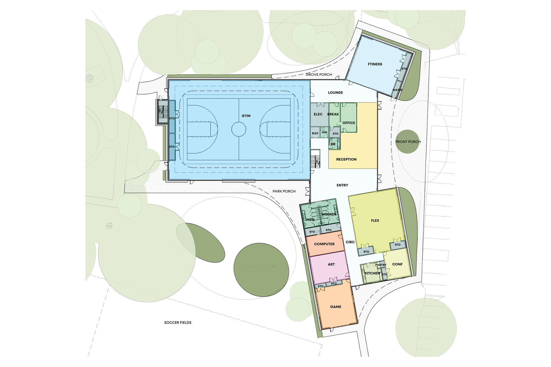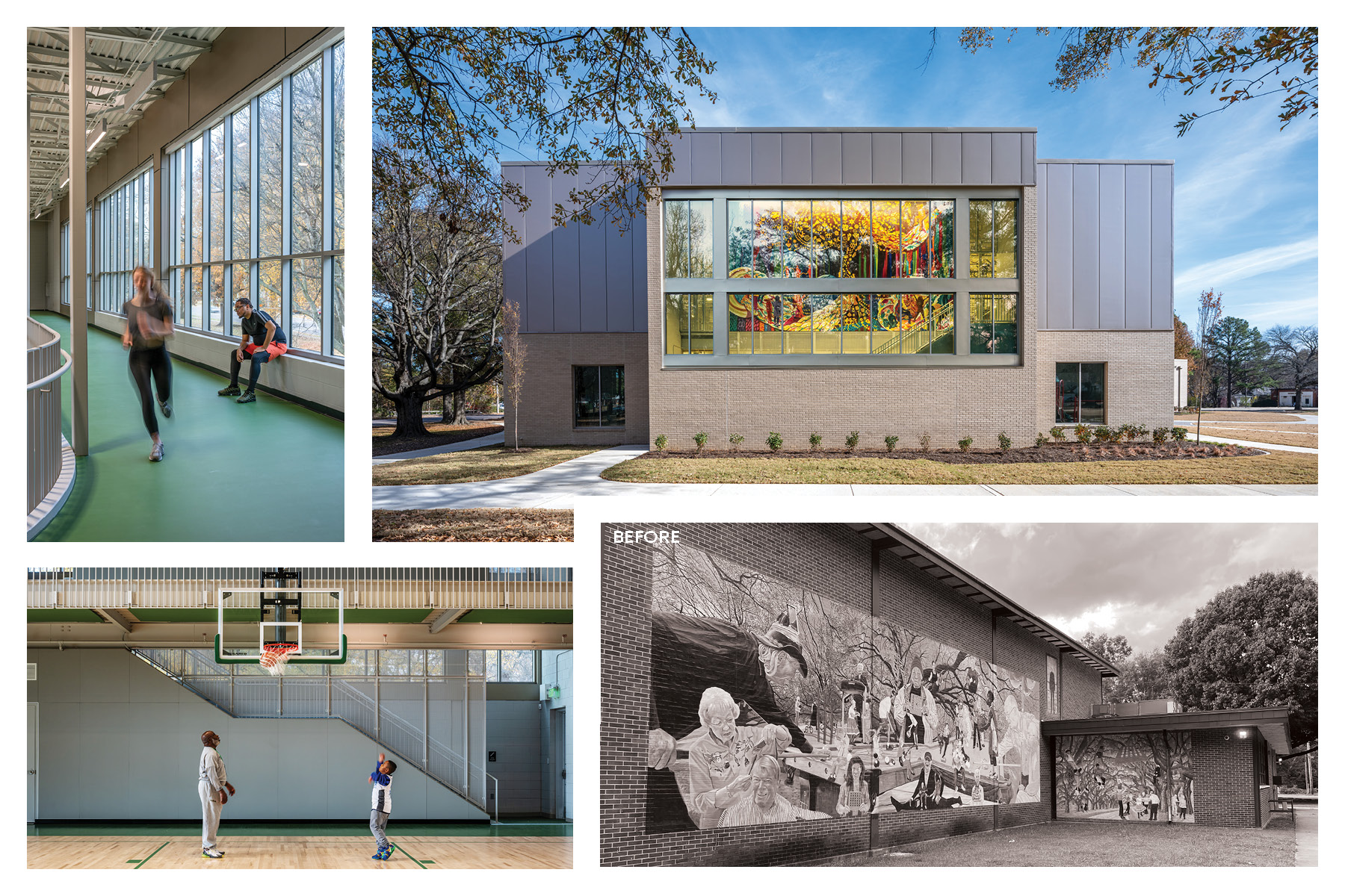 The New Community Center and corresponding soccer fields replace an uninviting existing fortress-like center that had fallen into disrepair, where those in the park didn’t venture inside. Multiple neighborhood meetings provided critical feedback for what the residents wanted in their community center: a place to gather and play, open, inviting, flexible spaces, the ability to influence programming, and an indoor walking track. Inspired by the trees on site, the building is set up with wings radiating from the central trunk for different uses: community, fitness, and play. The Community wing features multi-functional spaces; a space for meetings, events, and rumba lessons; a kitchen for event support and teaching local residents healthy meal planning; or a conference/ computer room, also providing a place for residents to meet with the police discretely. The fitness wing includes the fitness room and outdoor fitness porch and is closely linked to the Play wing, with a gymnasium and elevated walking track. The Play wing floods with daylight streaming in through large expanses of glass. The elevated walking track makes one feel like one is walking in the tree canopy enveloping the building. Over the years, the neighborhood’s demographics have changed; in response, all interior signage is in English, Spanish, and Arabic. This change is further celebrated in the permanent mural adorning the wall of the communicating stair and the temporary exhibits celebrating the neighborhood’s ethnicities. The new Center has energized this multicultural neighborhood, creating a renewed sense of pride for the residents, and has become a model for future City community centers.