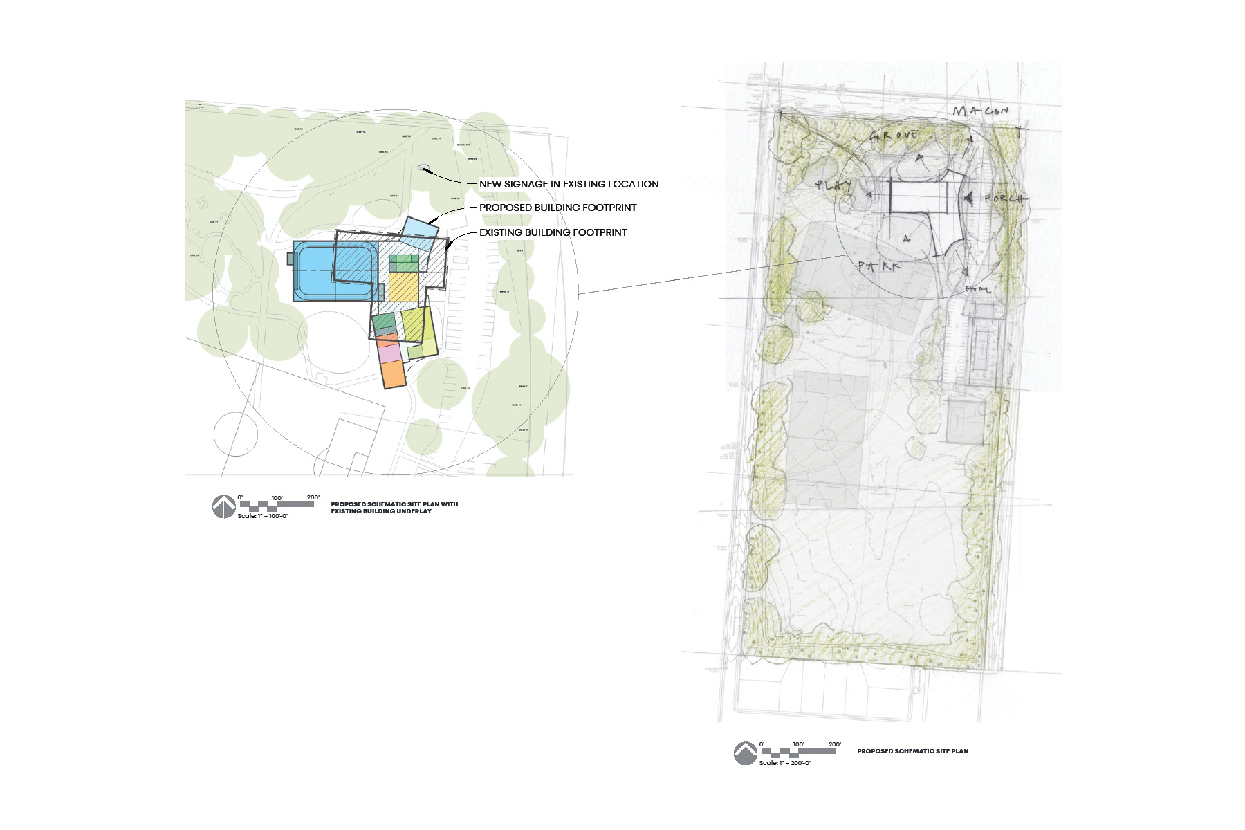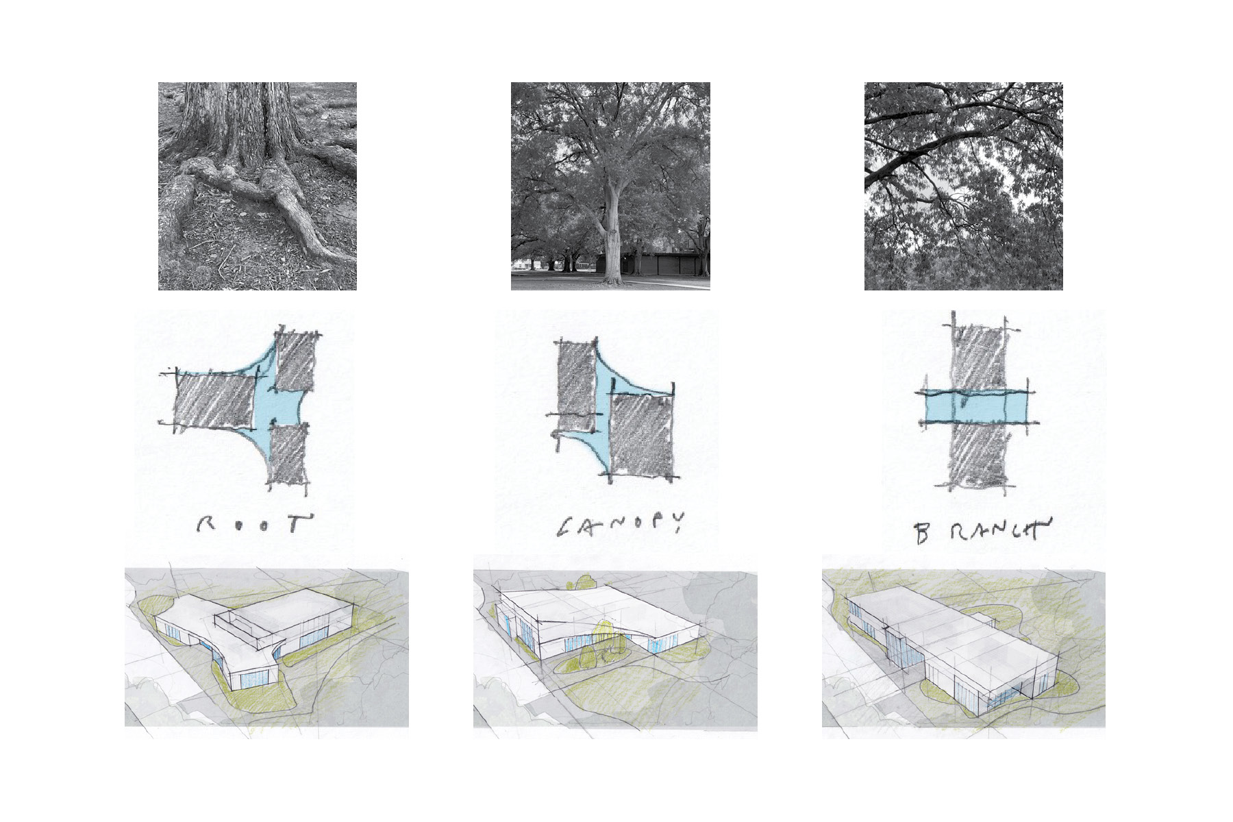 02- Three concepts were inspired by tree structure and form—Root, Branch, and Canopy. The selected Root Scheme compliments the natural form of the trees with a curved entry similar to the above-ground root structures, steady and strong, open as an embrace. Drawings by LRK