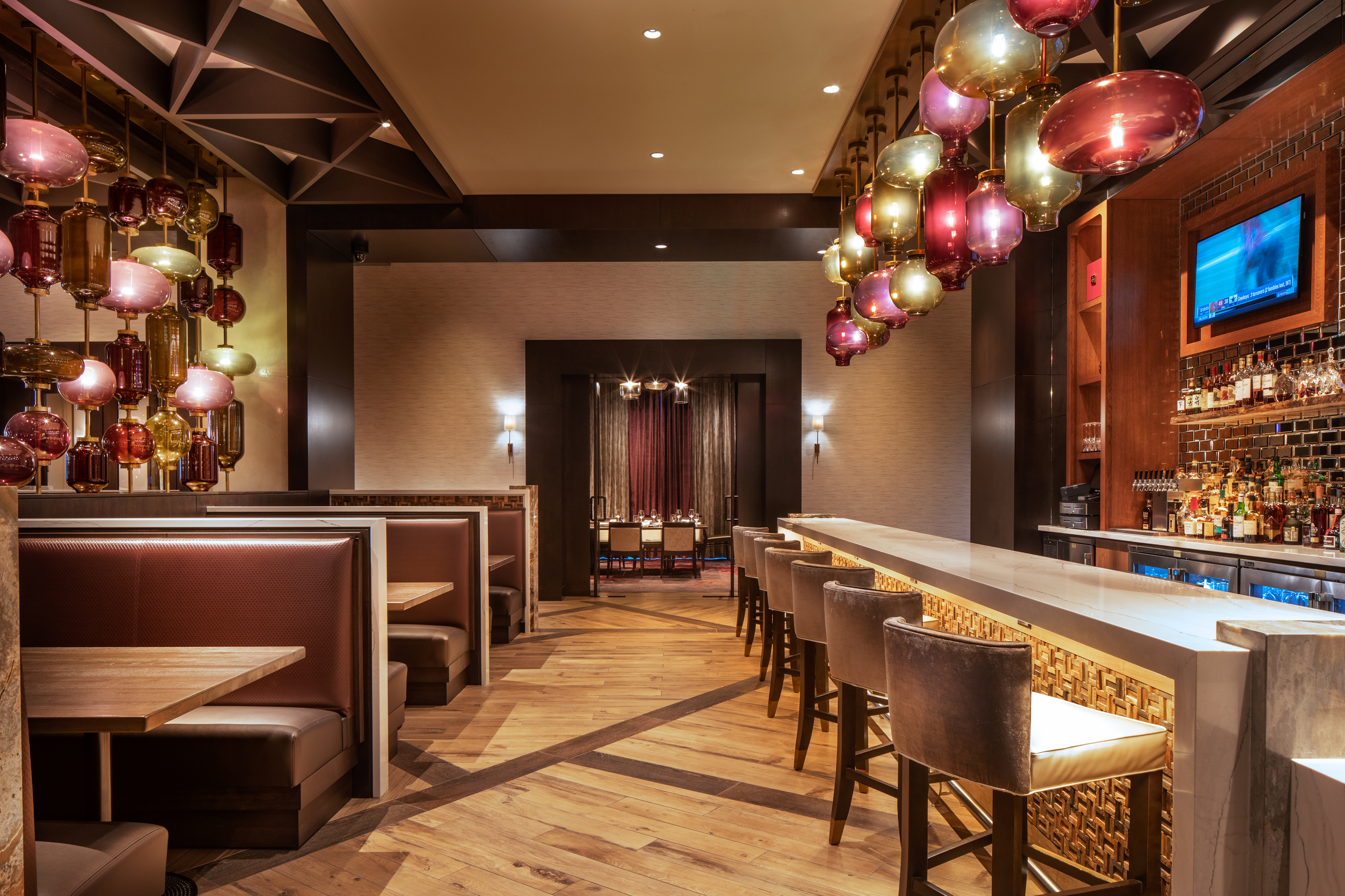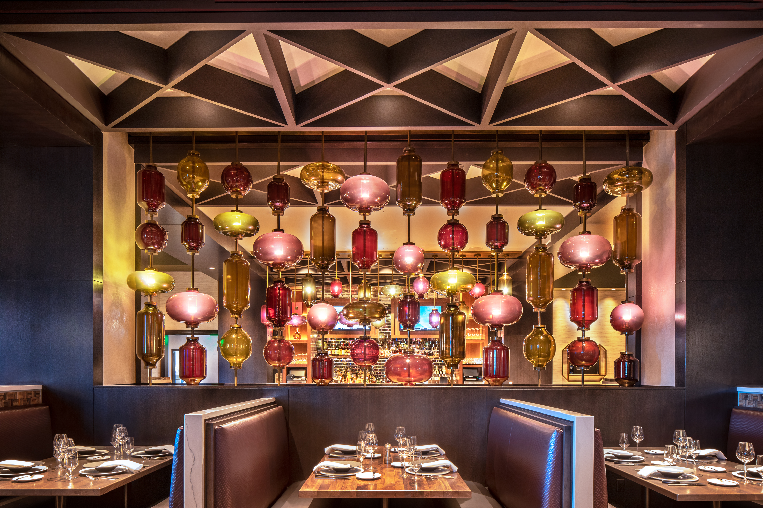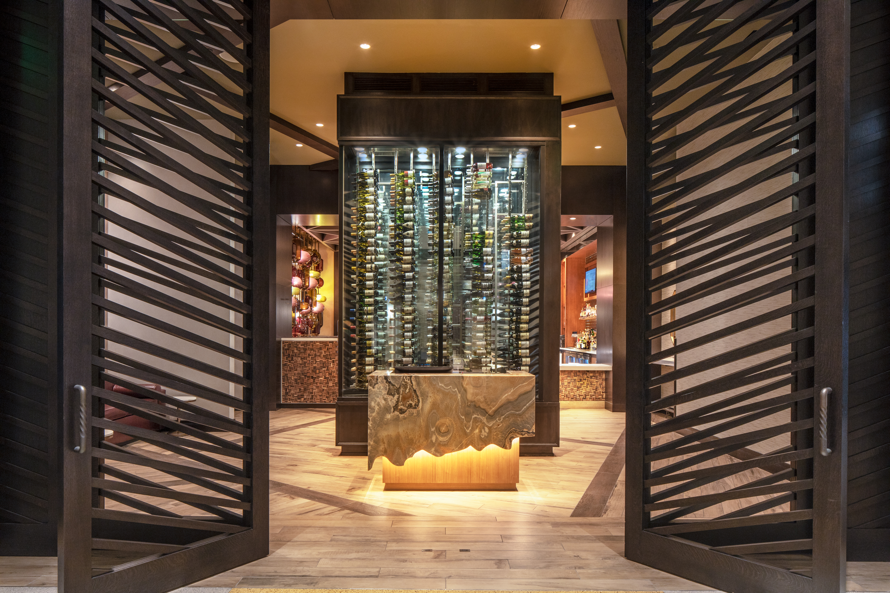 Highlighted by unique custom millwork entry doors, the steakhouse’s dramatic glass globe pendant light walls emulate the bounty of the valley’s wine country and cattle farms.