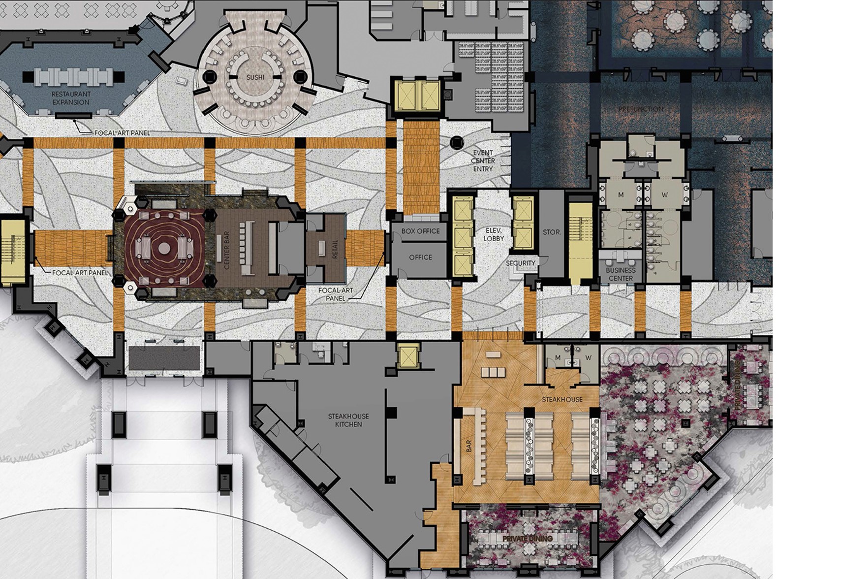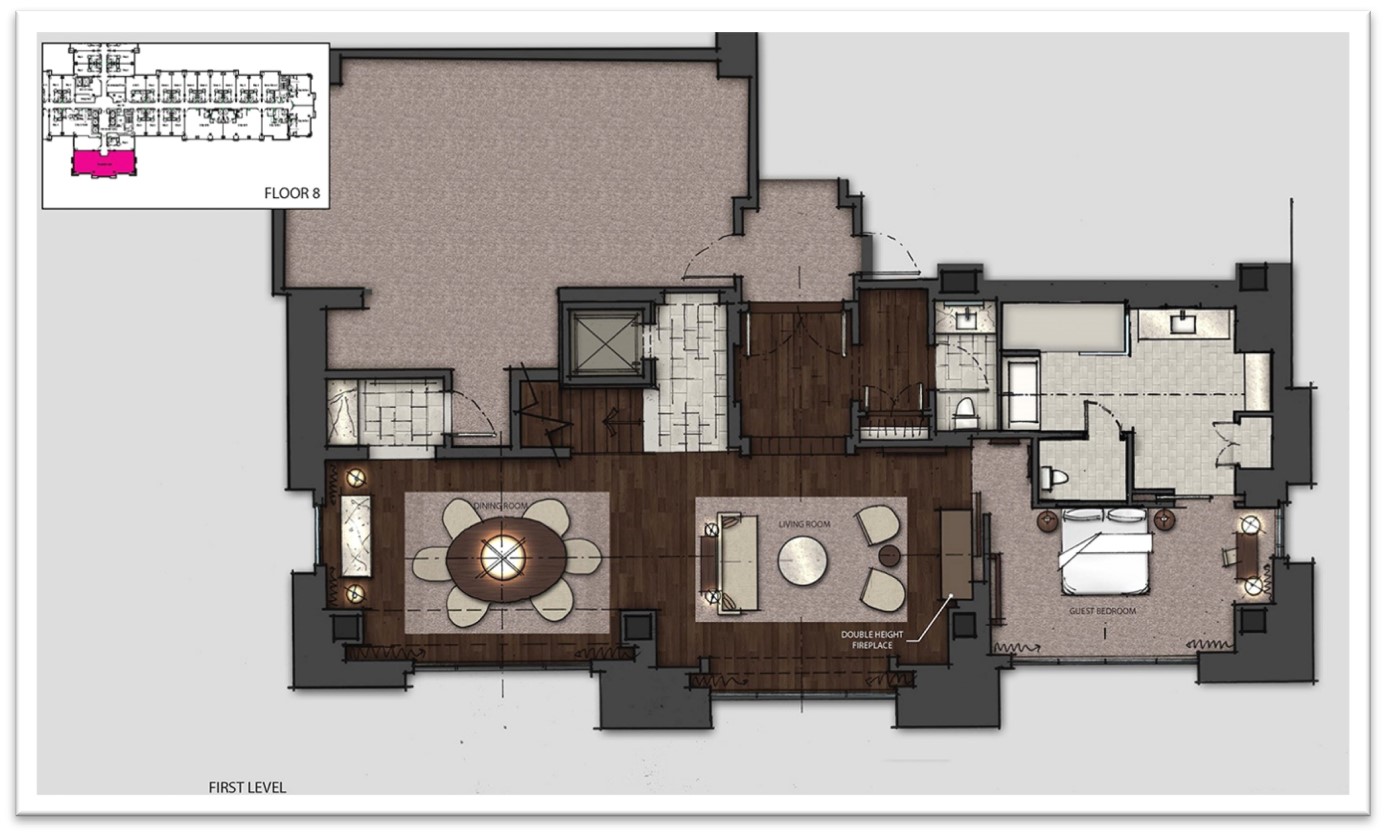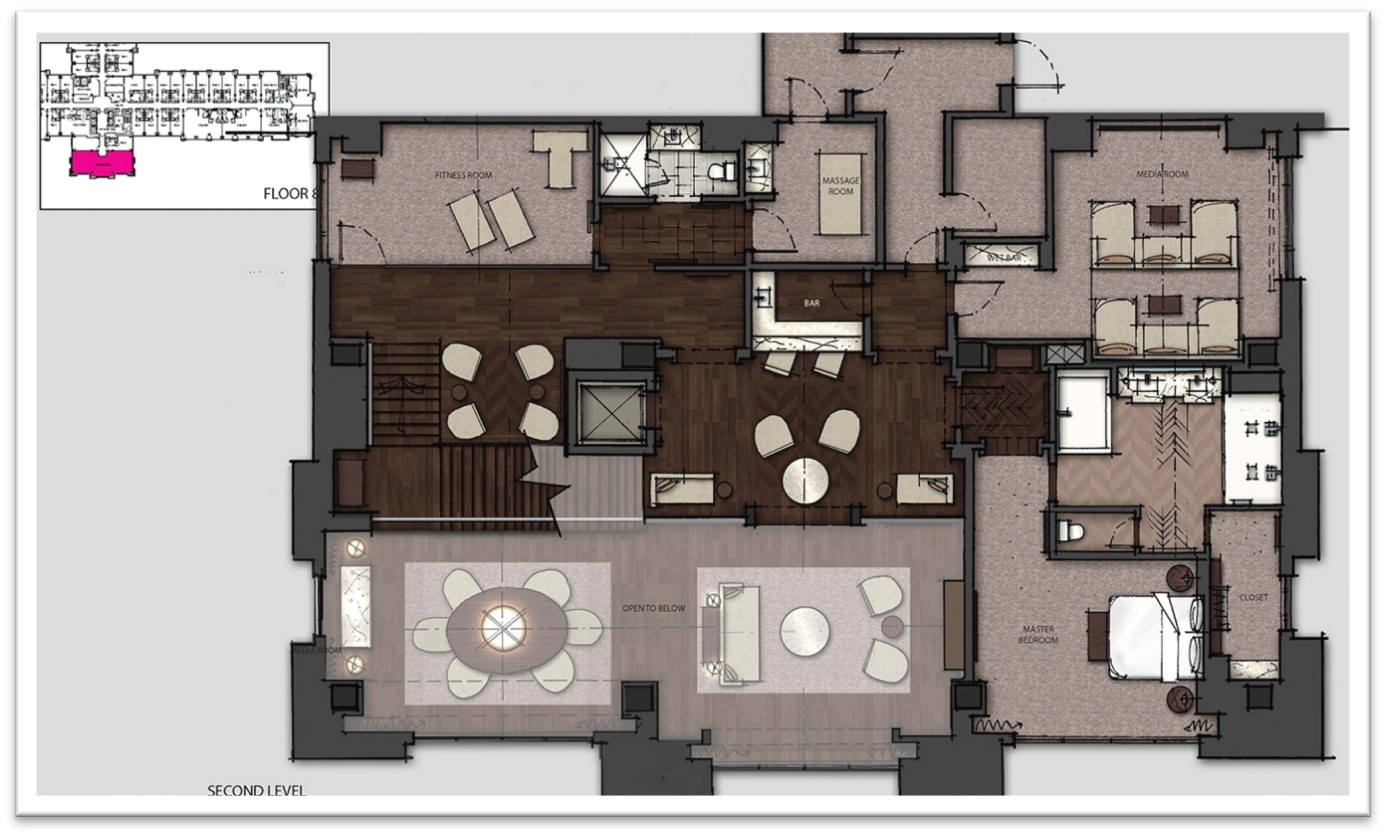 11. VIP Suite – Floor 1. An exciting new feature of the expansion program is a Las-Vegas inspired Presidential Suite only available to the resort’s top tier VIP guests. Set on the upper floors of the hotel, the spacious two-story suite boasts an elevator, a grand stair, master and guest bedrooms and corresponding en suite baths, a private media/theater room, private spa and private fitness room.