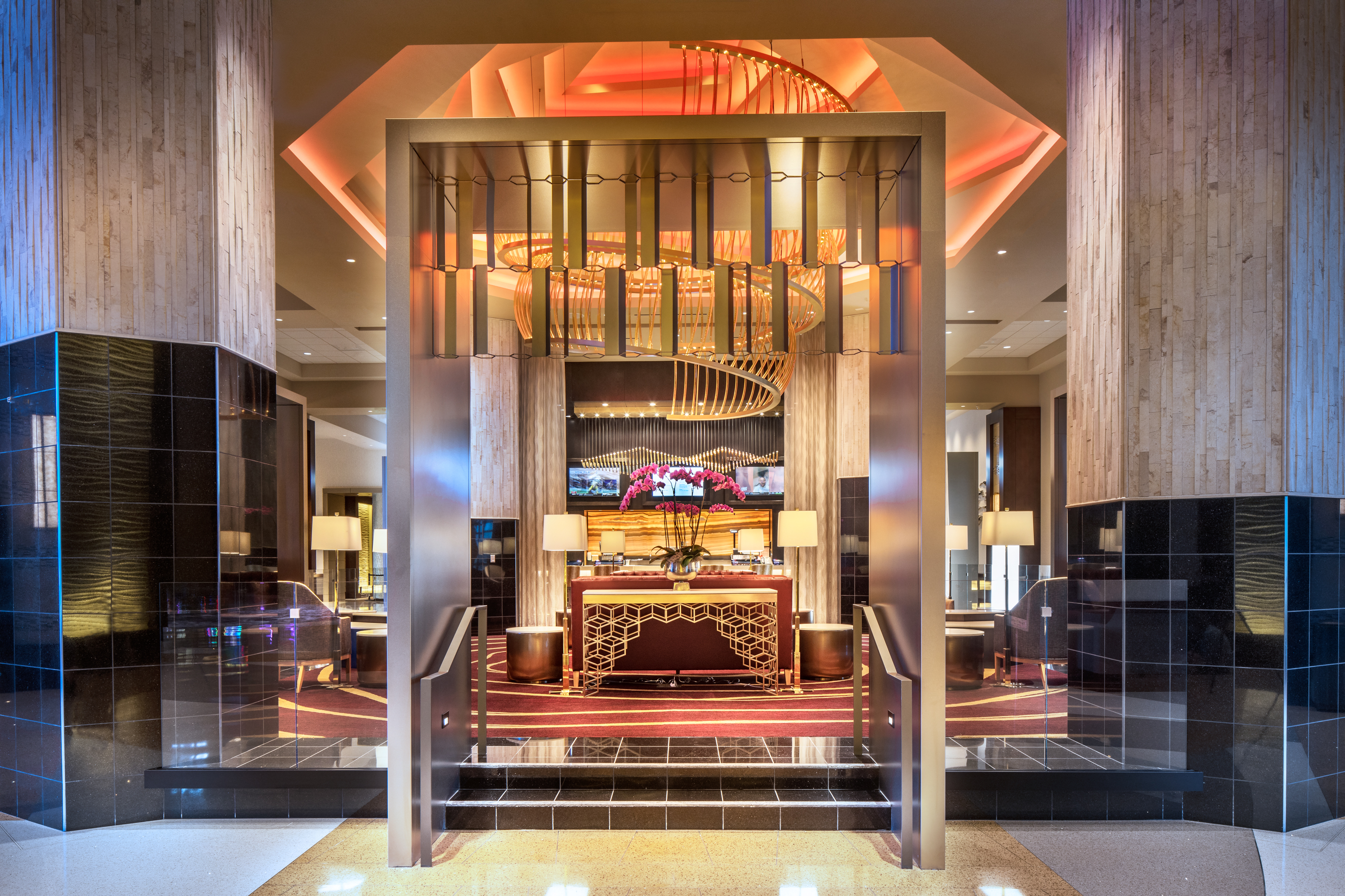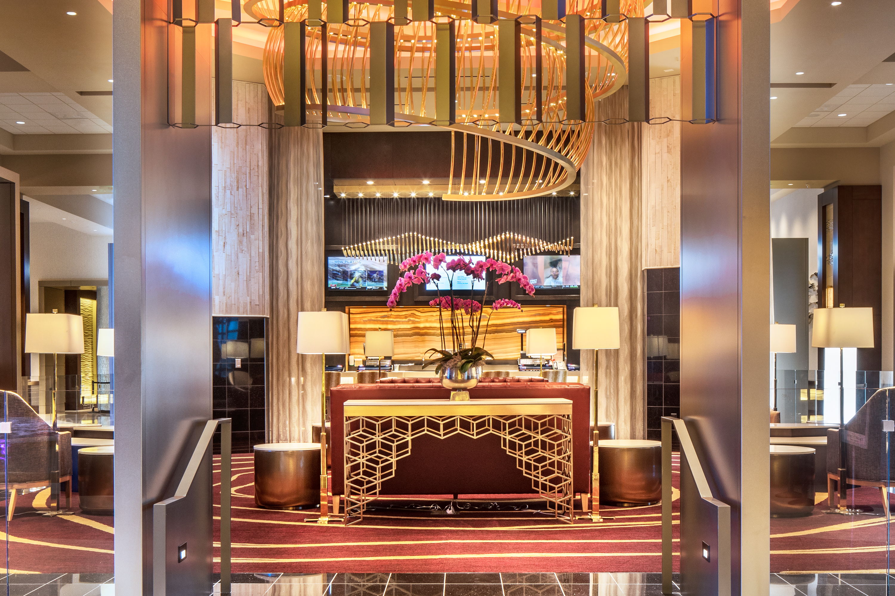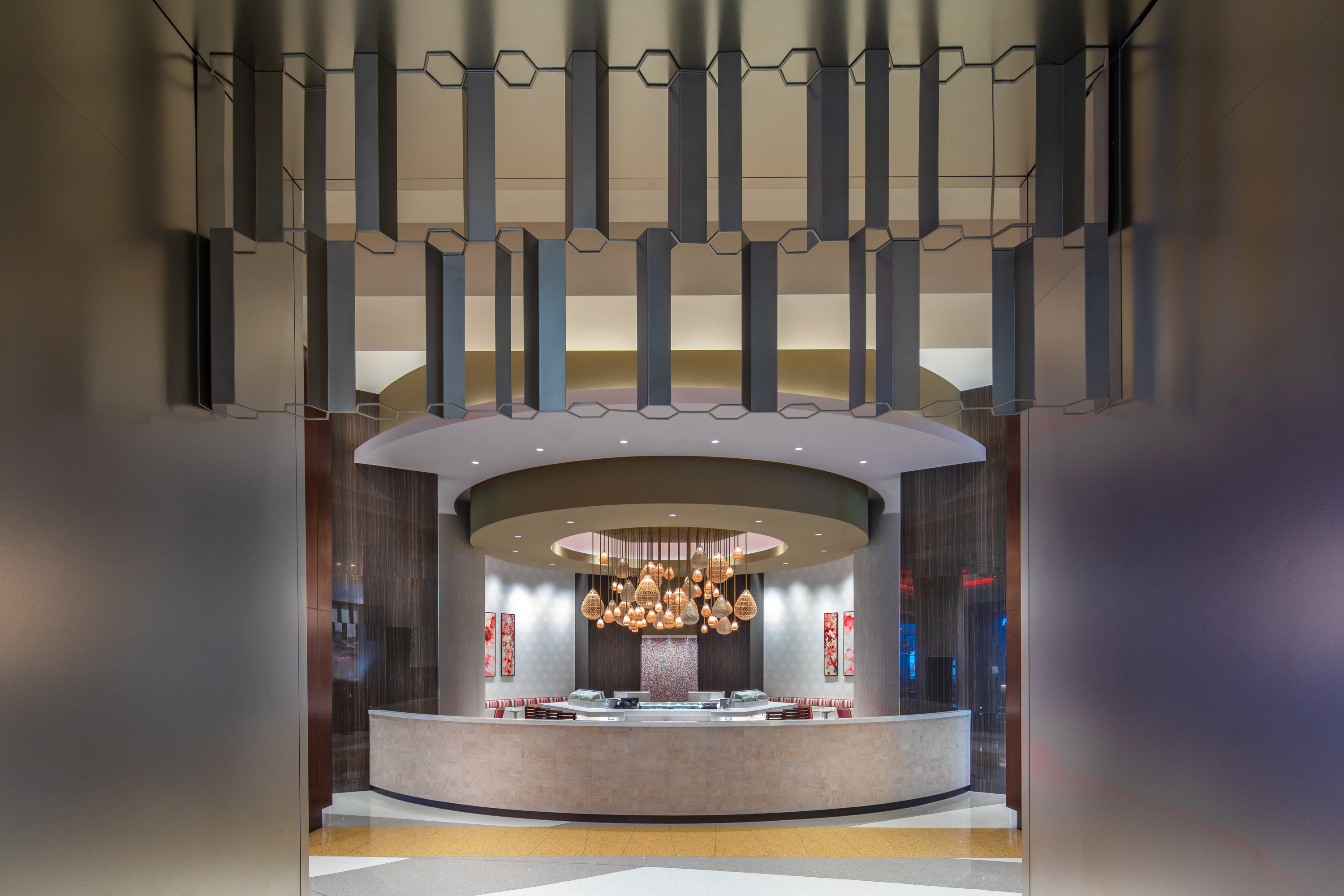 As an ode to the honeybee and its importance to agriculture, four hexagonal columns and honeycomb patterned screens give intimacy to the energetic lobby lounge accented in maroon and honey golden tones. Above, a wildly geometric ceiling plane contrasts with a spiral golden light fixture to emulate the frenzied energy of the hive.