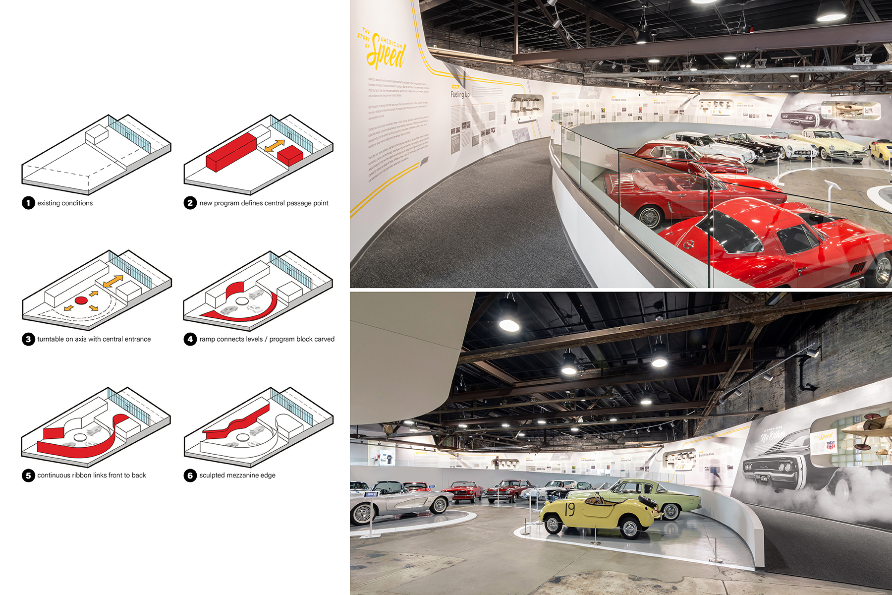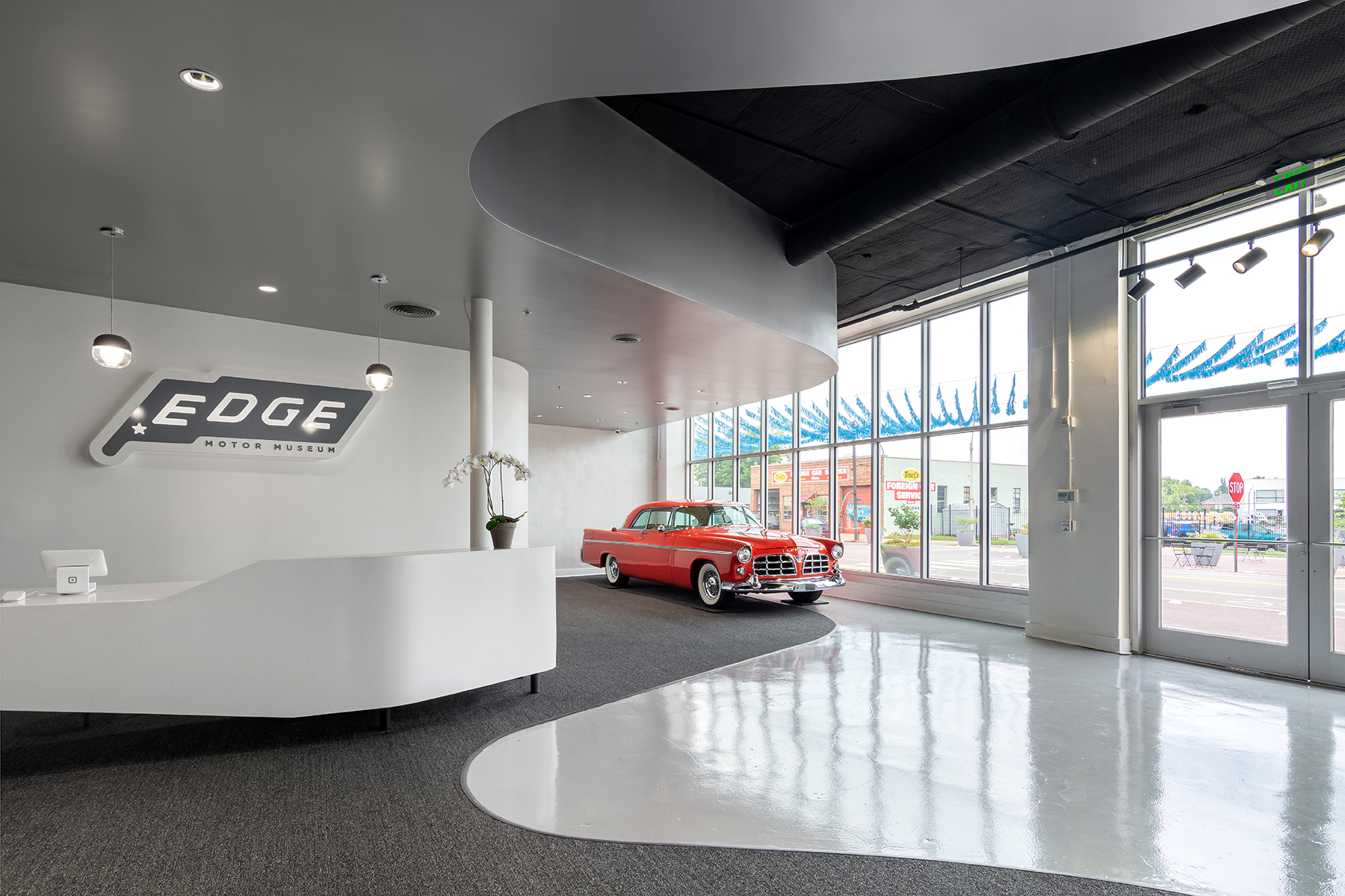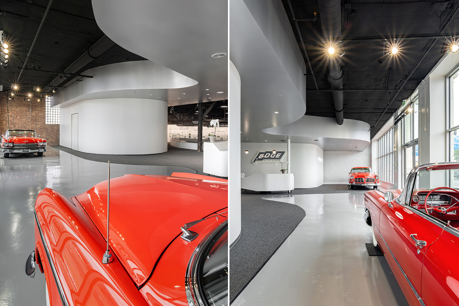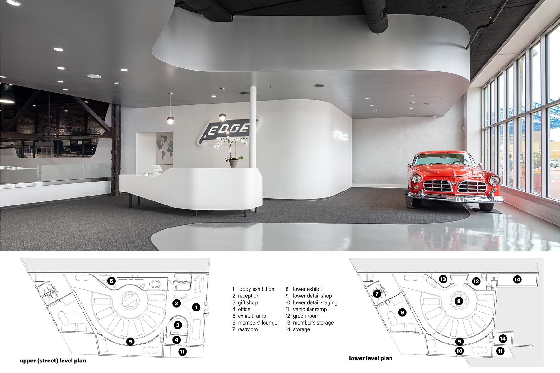 Edge Motor Museum exemplifies adaptive re-use through the insertion of new architecture within an existing shell building with a beautifully historic terra cotta façade. The museum design was governed by 6 primary goals/ideas: Treat cars as works of art, Create clean surfaces without articulation, Use white as a neutral backdrop, Highlight qualities of existing building, Resist anything flashy, and Gracefully transition between levels. The existing building is spread between two levels: a smaller, upper street level and larger lower level. A diagram was developed treating the upper level as lobby exhibition before compressing the space at the ticket counter. Visitors are guided through the space by a continuous wall originating within the lobby and running alongside a sweeping ramp. Its wall surface graphically relates to the current exhibit while simultaneously serving as an indirect light source through heavy illumination. Opposite this wall, a glass guardrail offers greater views of the automobiles as one moves down the ramp. At the lower floor, cars are positioned in a circular array around a central turntable. White walls serve as a neutral backdrop, allowing the cars to viewed as paintings in a museum. Overhead, the existing steel roof trusses are exposed in juxtaposition to the precise white walls below. A members’ mezzanine occupies this truss zone as its leading edge is sculpted to the geometry of the display floor below. The detail shop is nestled behind an existing brick wall, allowing visitors views into the extensive detailing process before cars are put on display.