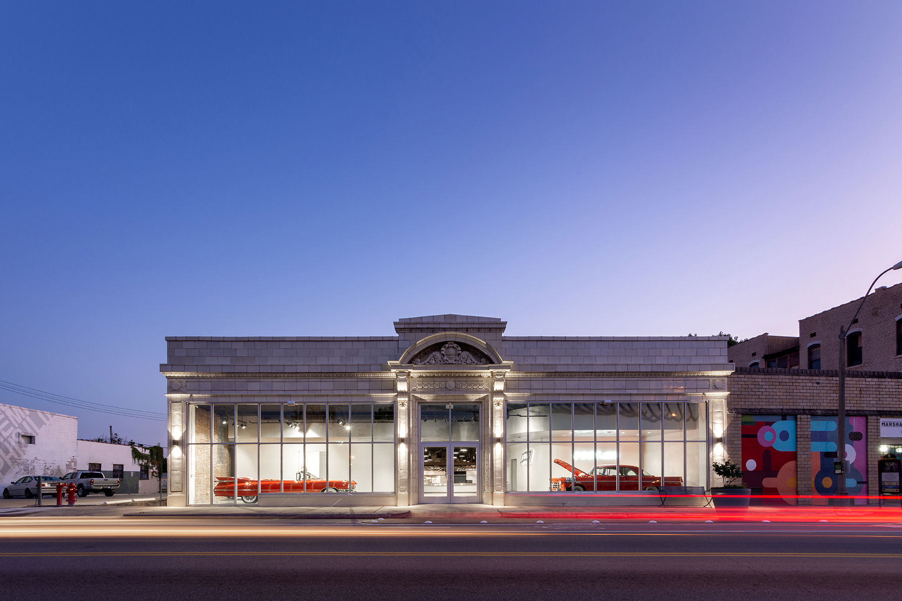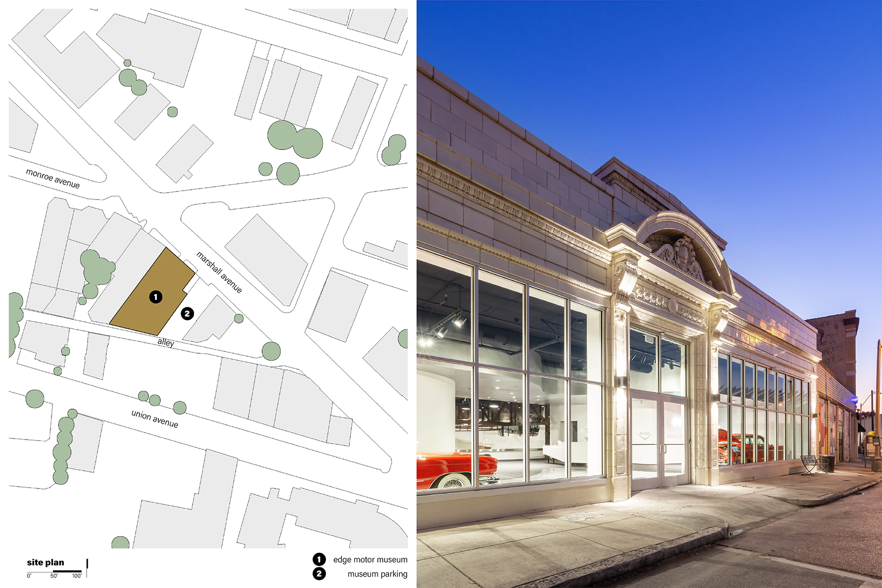 Located within yards of historic Sun Studio, Edge Motor Museum breathes new life into a long-overlooked portion of Memphis known as “The Edge”. The new museum occupies a former car assembly factory/showroom that was more recently used to produce potato chips. The museum highlights the best aspects of the existing building with an infusion of new architecture to draw visitors to the ever-changing exhibit of automobiles.