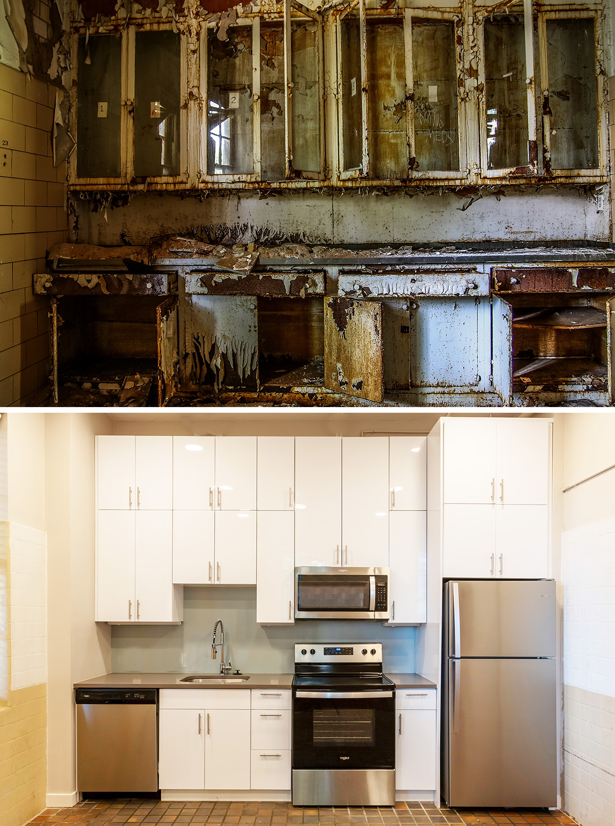 4. New kitchen design elements invoke the shimering white and light green tone finishes of the original medical casework and equipment. Photography by: Leland Kent, Abandoned Southeast
