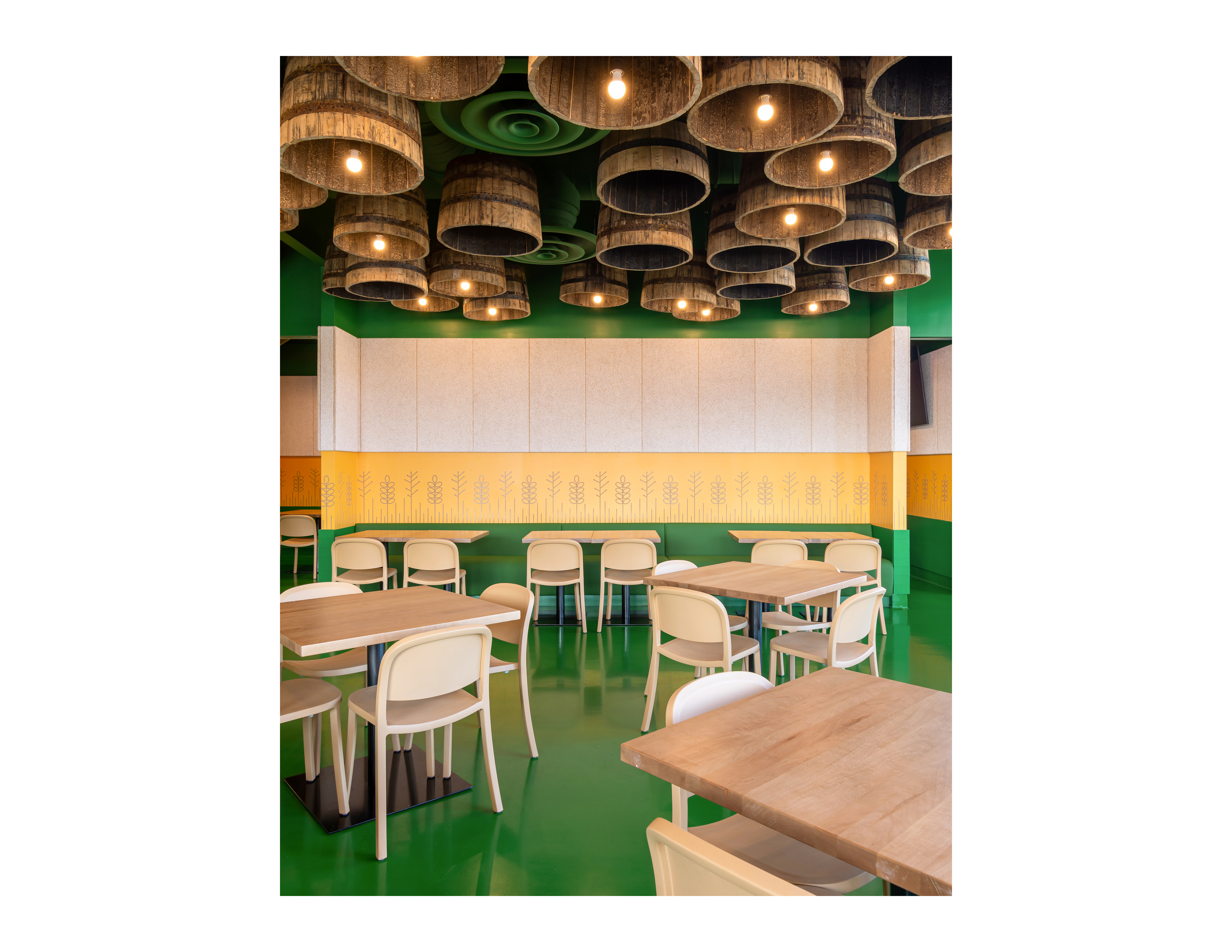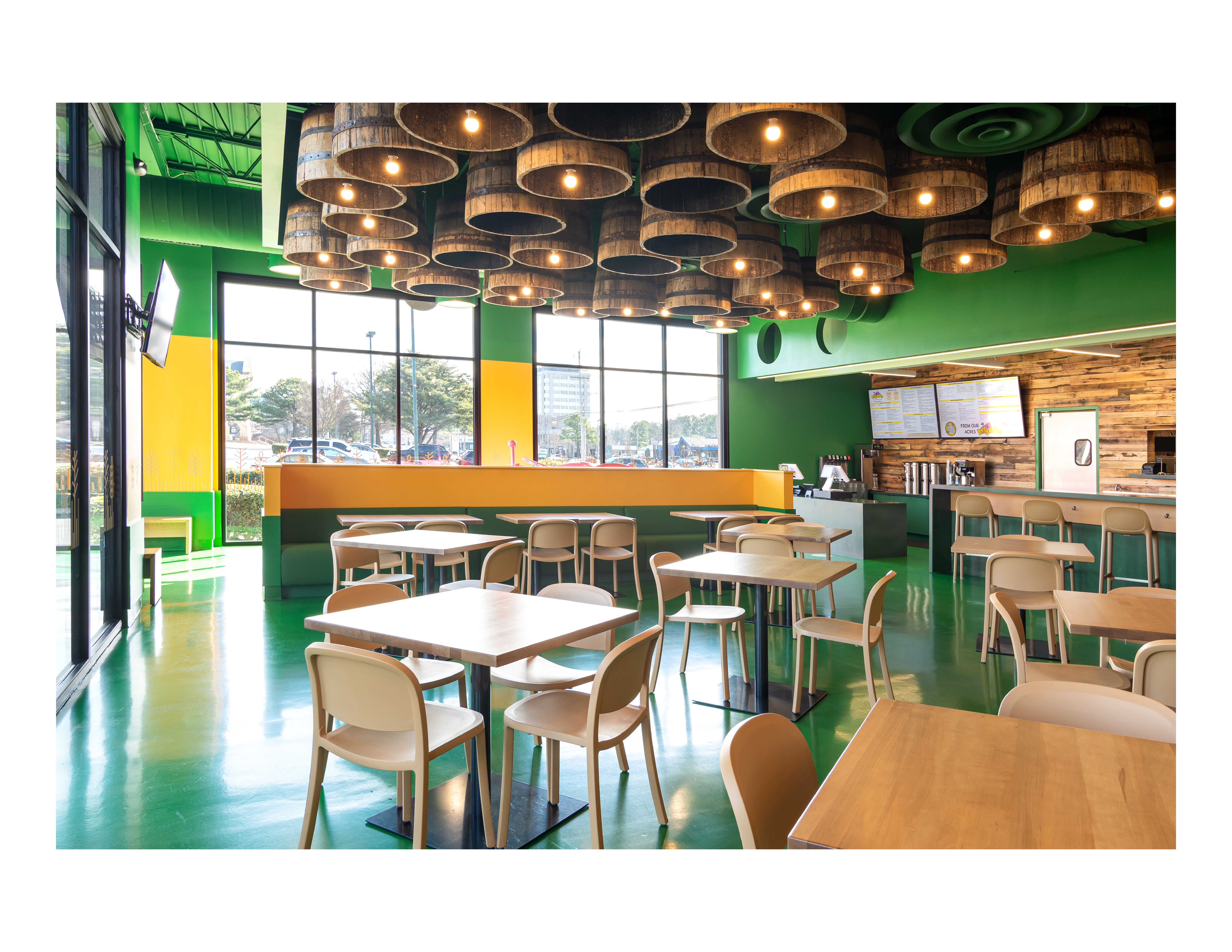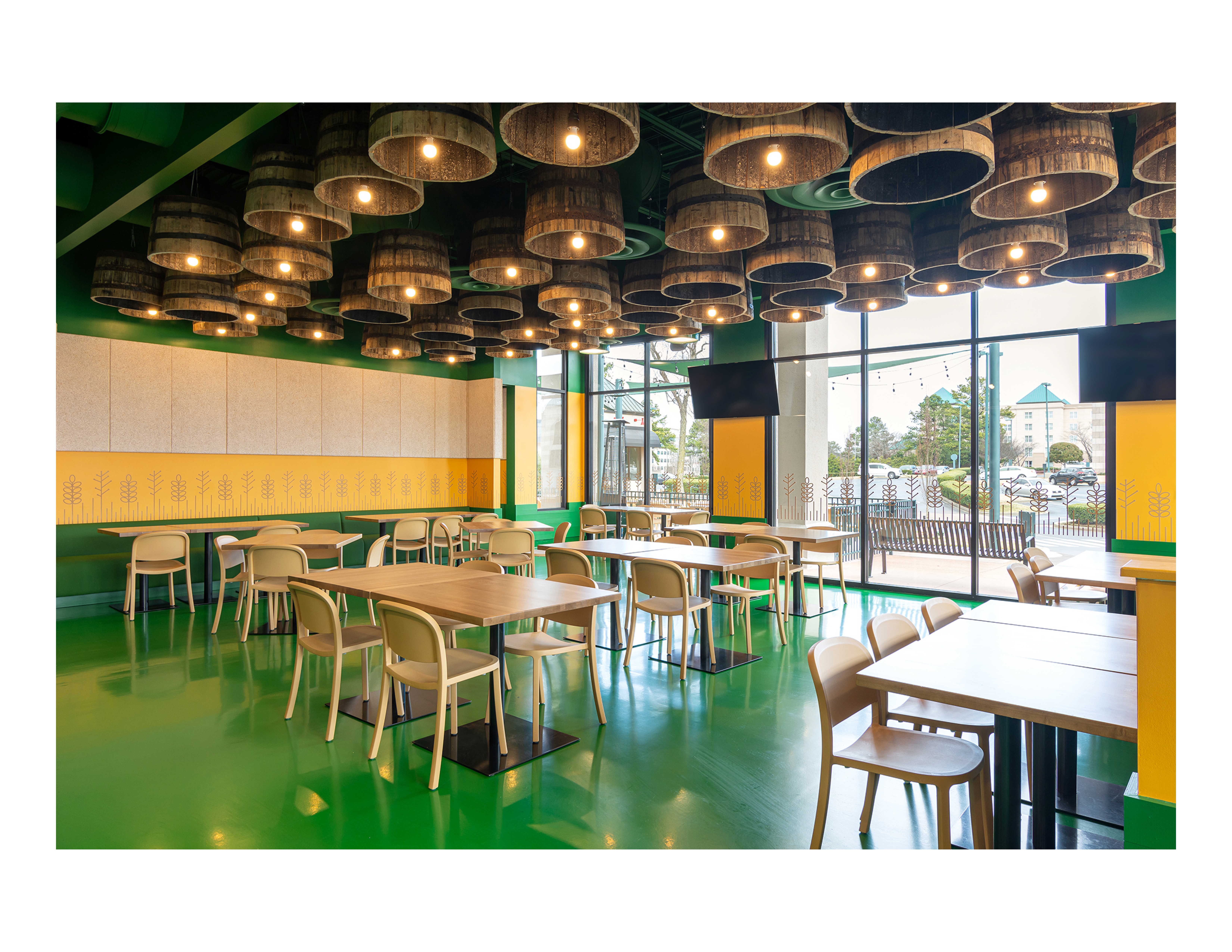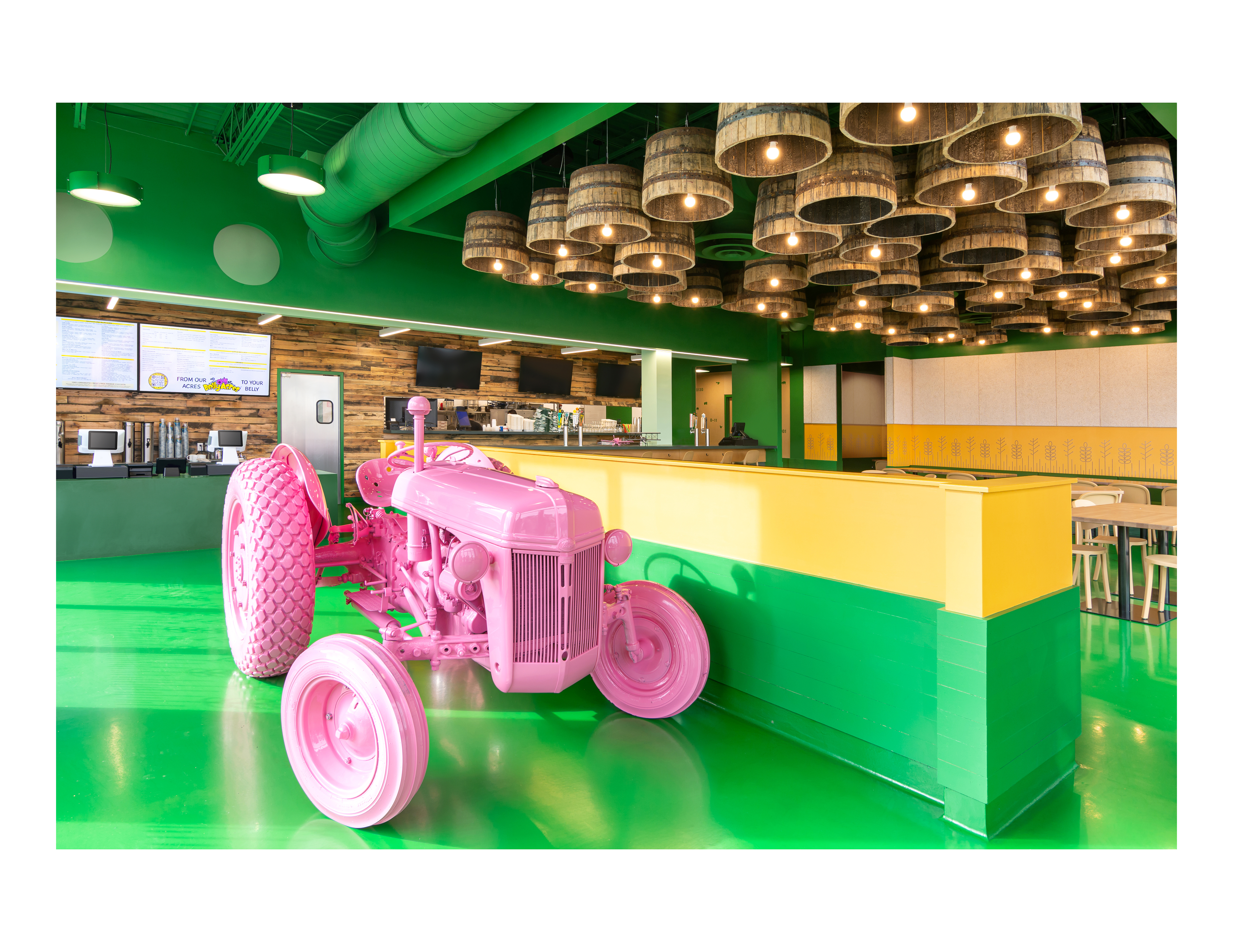 The tenant infill space was cut open to allow for more natural light and visual connections to an expanded outdoor patio space. Using a mix of greens, natural materials and a contrasting monochromatic custom cotton candy colored pink tractor on the interior allows for the bright colors to act as an additional billboard showing off the space. The dining room features fabricated barrel lights spaced for optimal light levels, a cut vinyl crop pattern and tectum panels for acoustical performance.