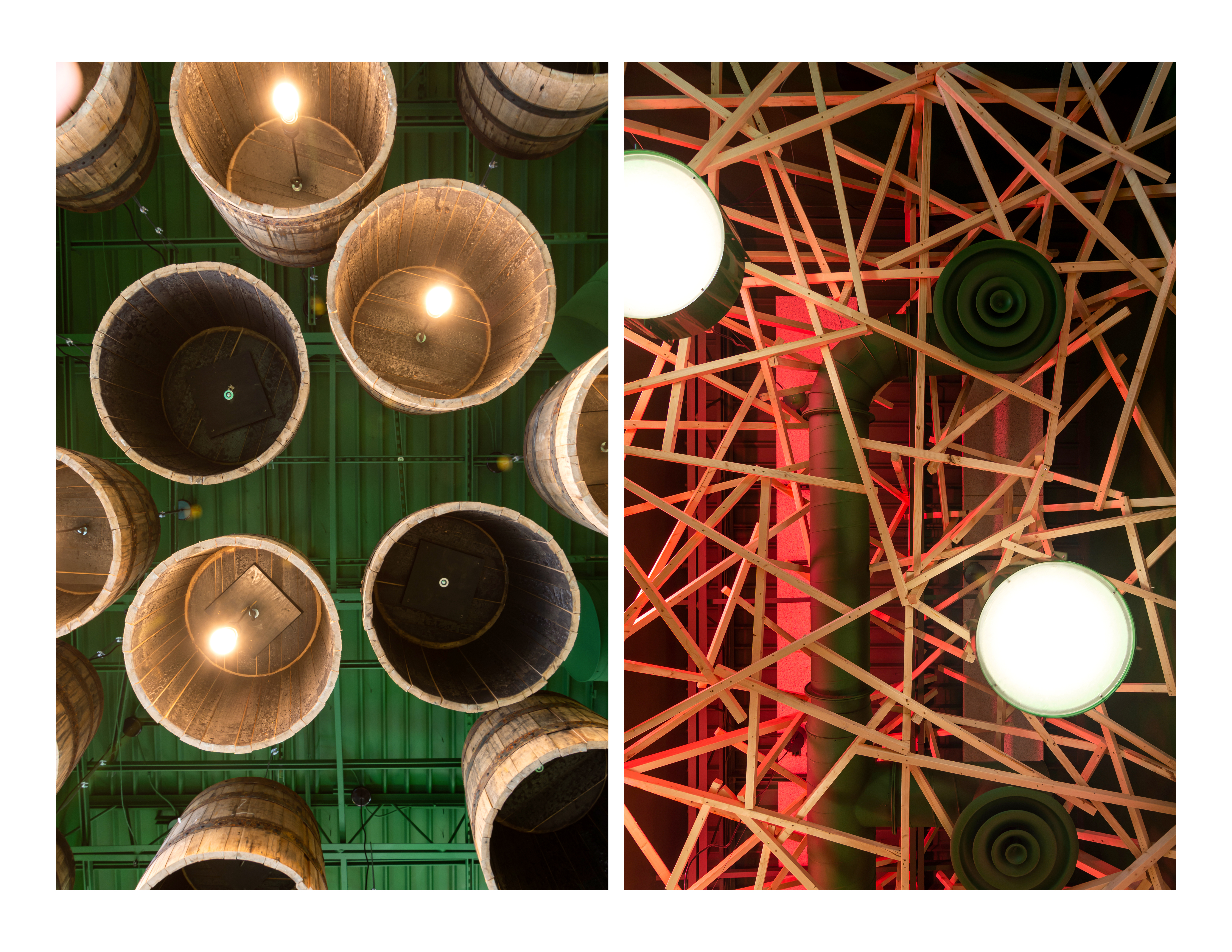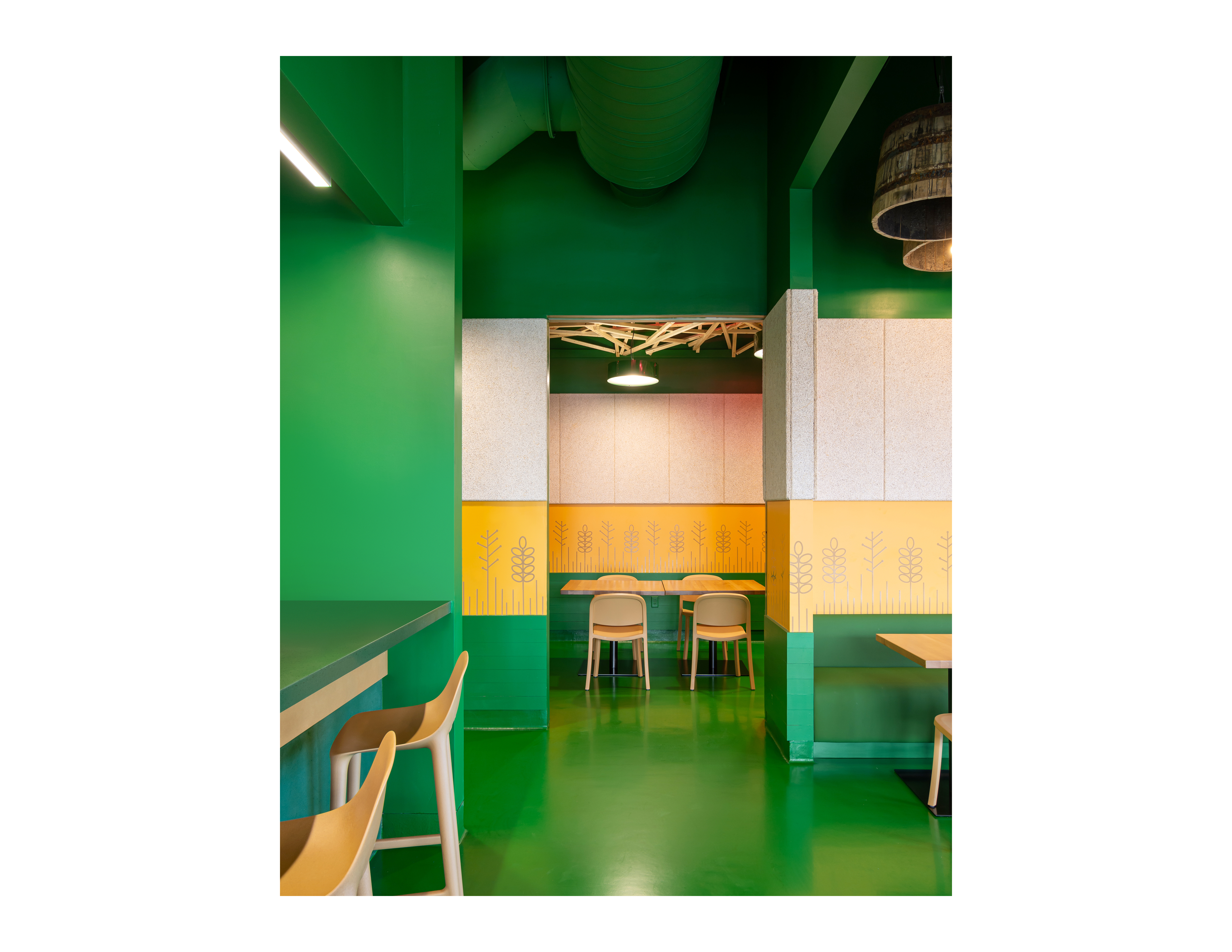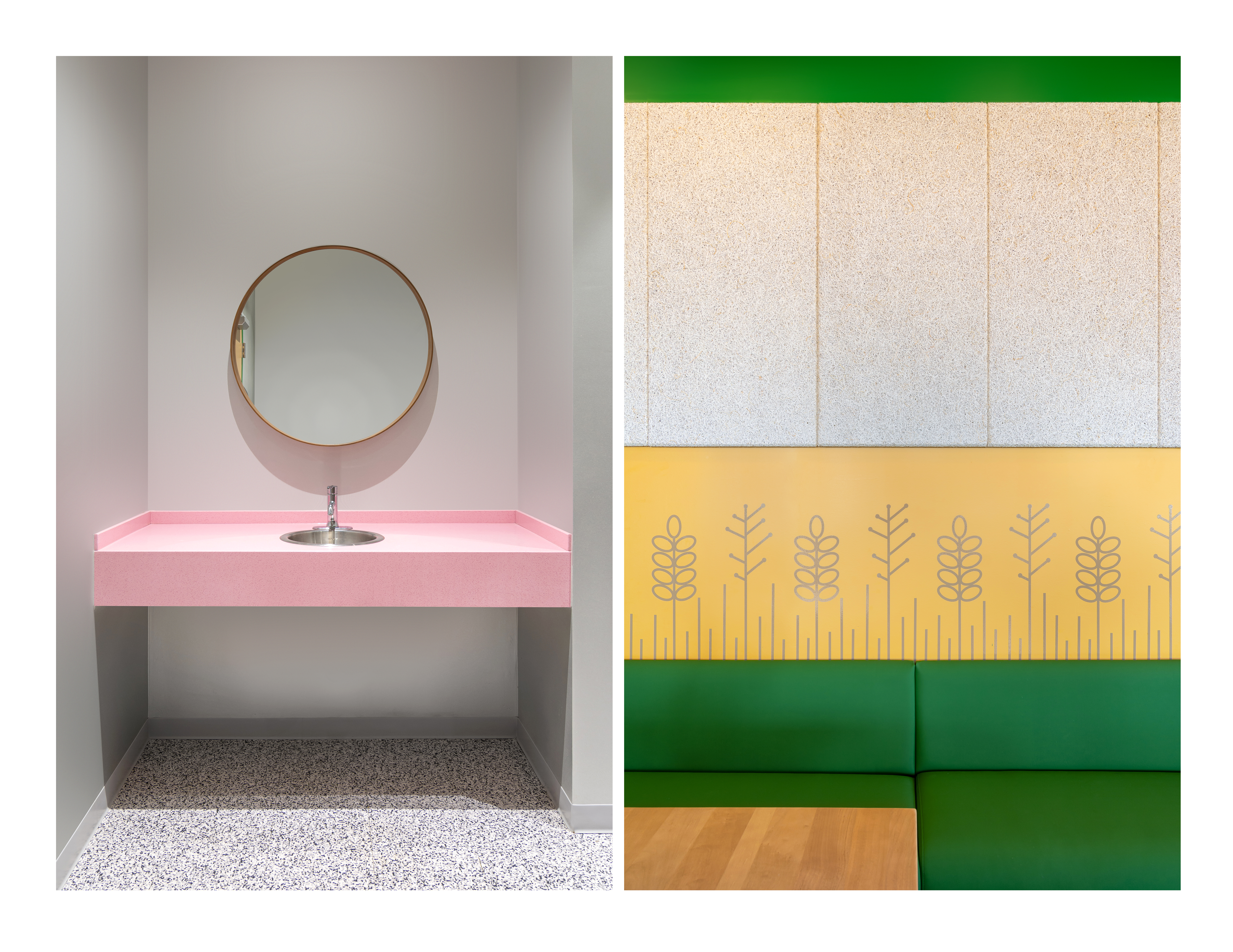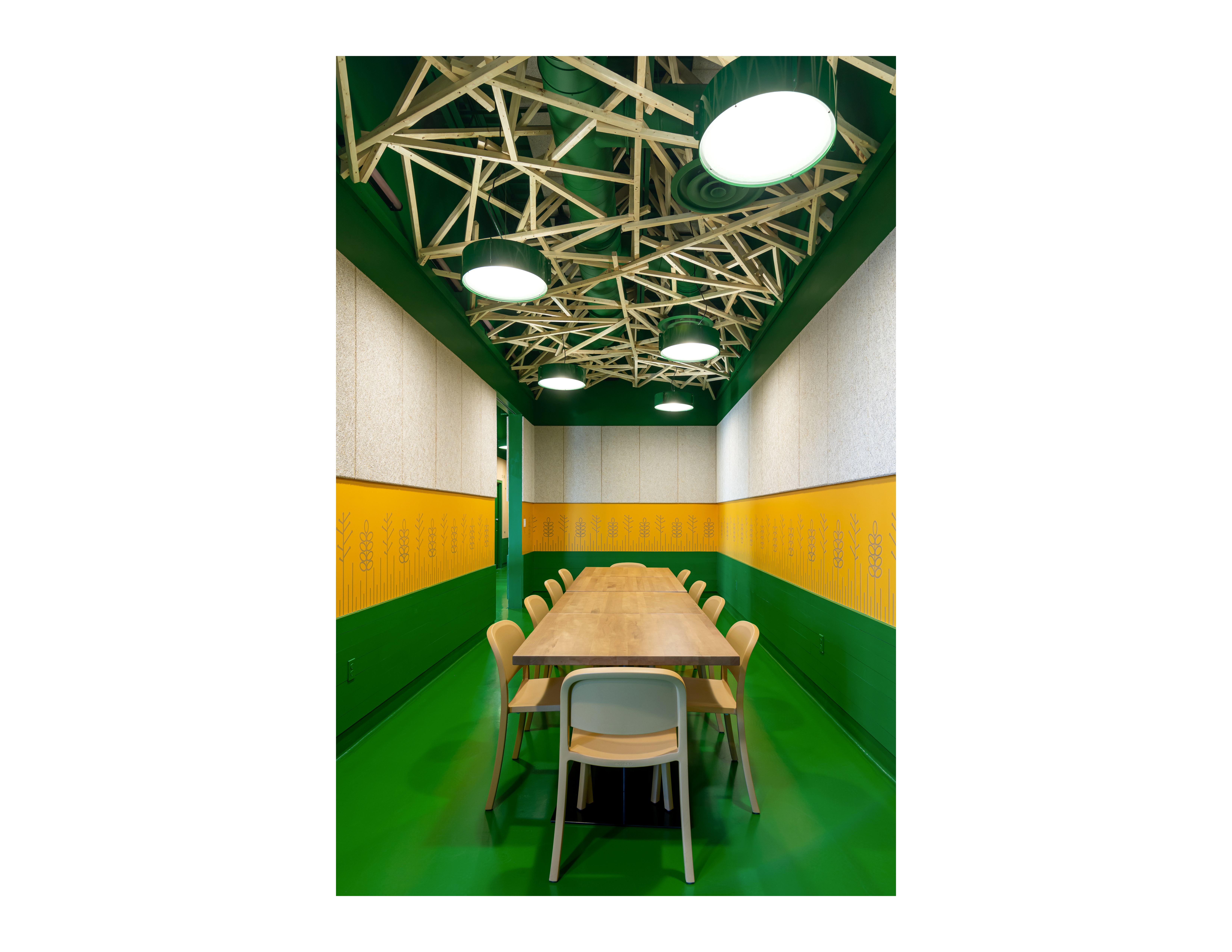 The tenant infill space was cut open to allow for more natural light and visual connections to an expanded outdoor patio space. Using a mix of greens, natural materials and a contrasting monochromatic custom cotton candy colored pink tractor on the interior allows for the bright colors to act as an additional billboard showing off the space. The dining room features fabricated barrel lights spaced for optimal light levels, a cut vinyl crop pattern and tectum panels for acoustical performance.