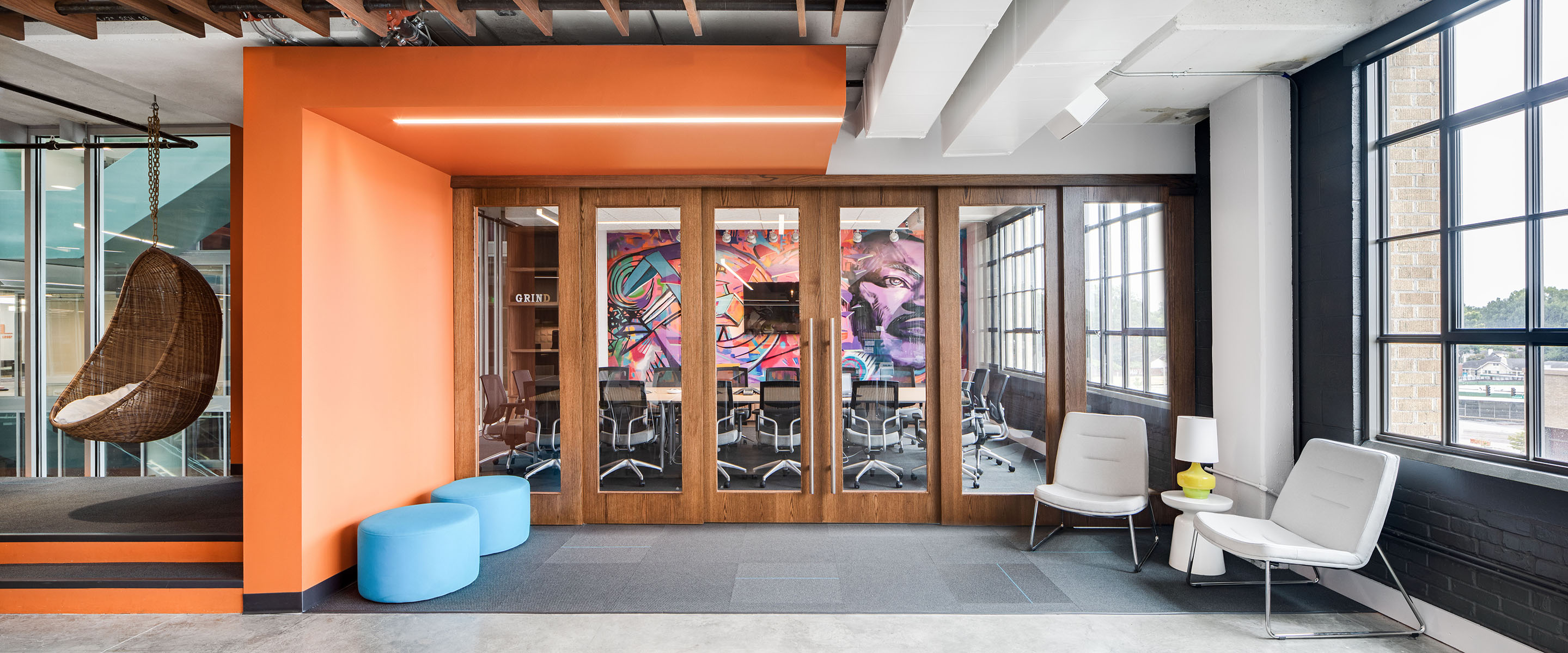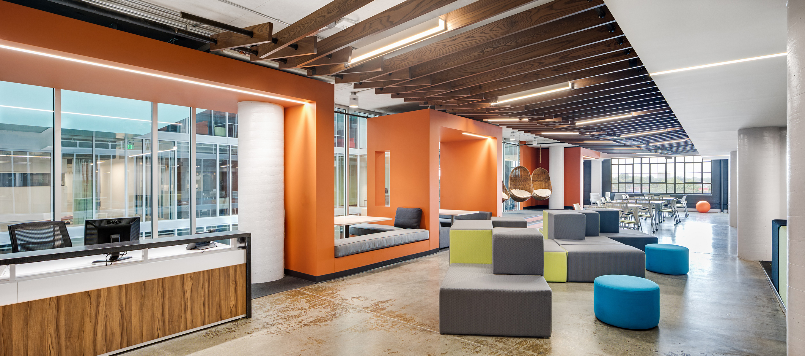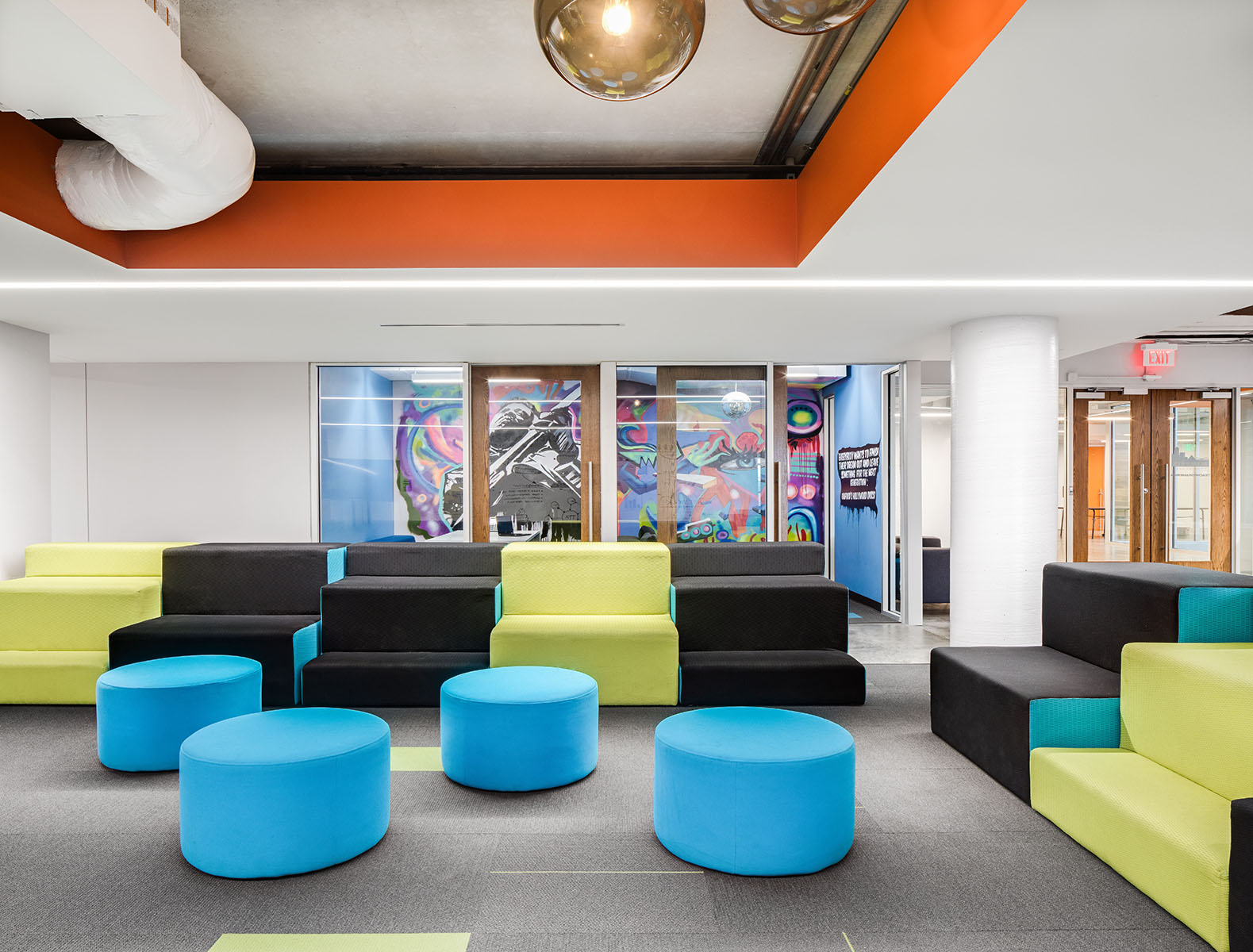 The project is located within a vast community of tenants of all use types. This prompted the design team to create features that showcased the design outwardly to the community. The material requirements of the new office translated to gritty, industrial aesthetics which were robust, durable and comprised of raw finishes. Exposed concrete, weathered steel and wood were explored. Vibrant wall coloring and furniture incorporated throughout the space emphasizes the organization’s upbeat and innovative vision.