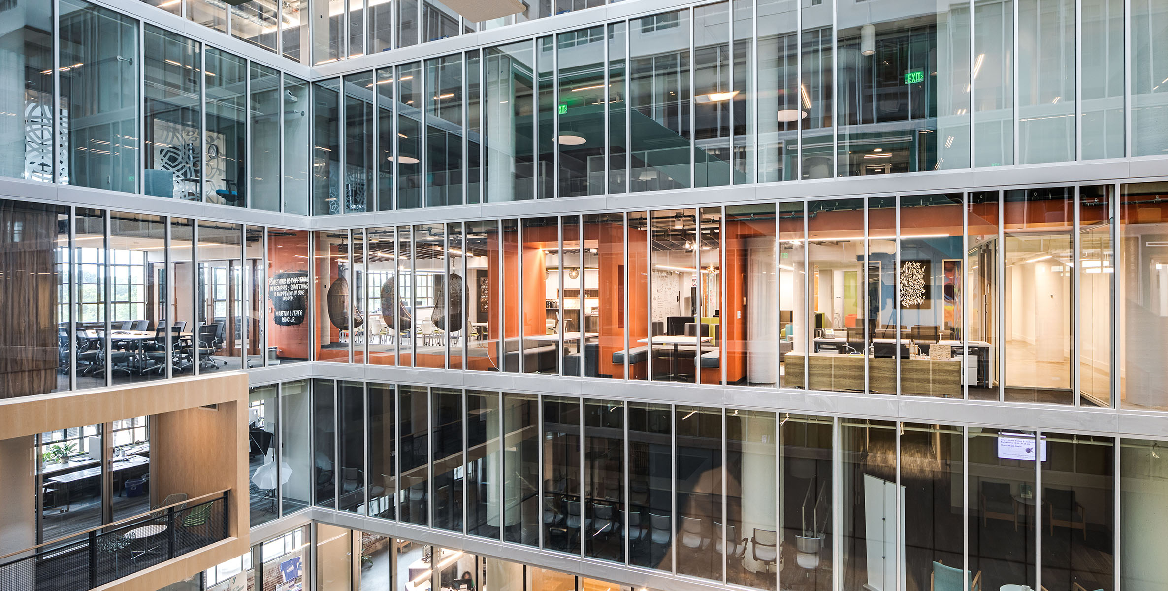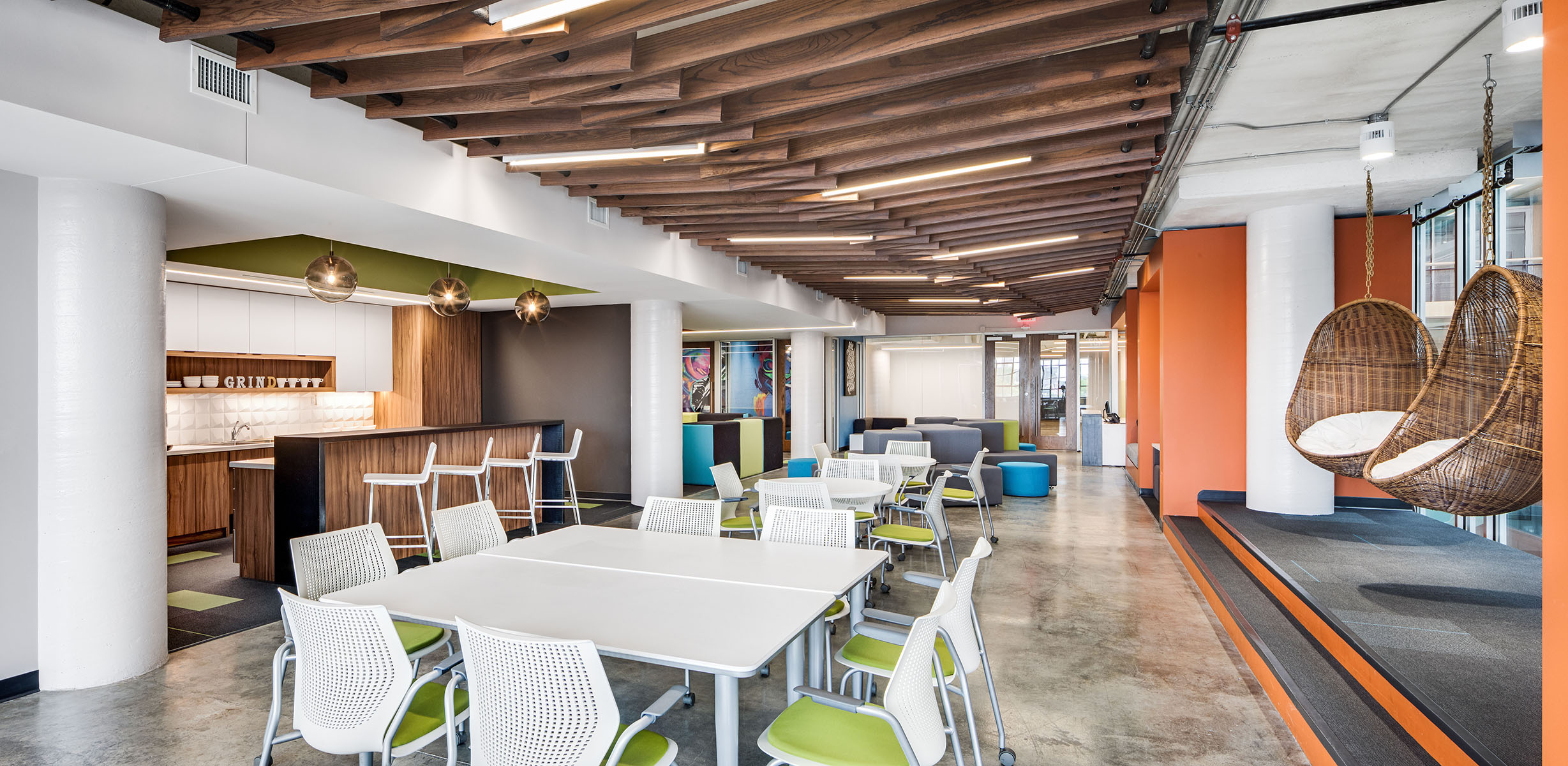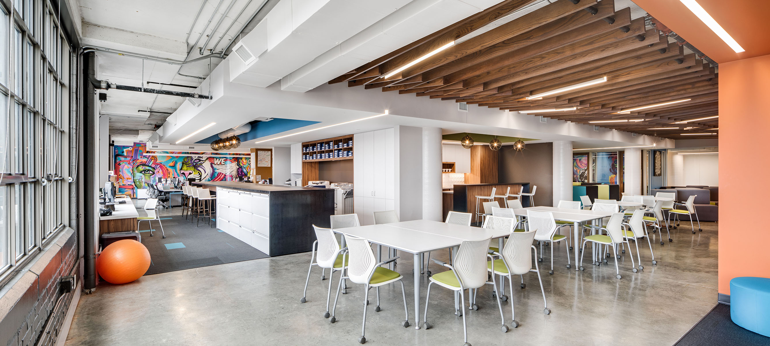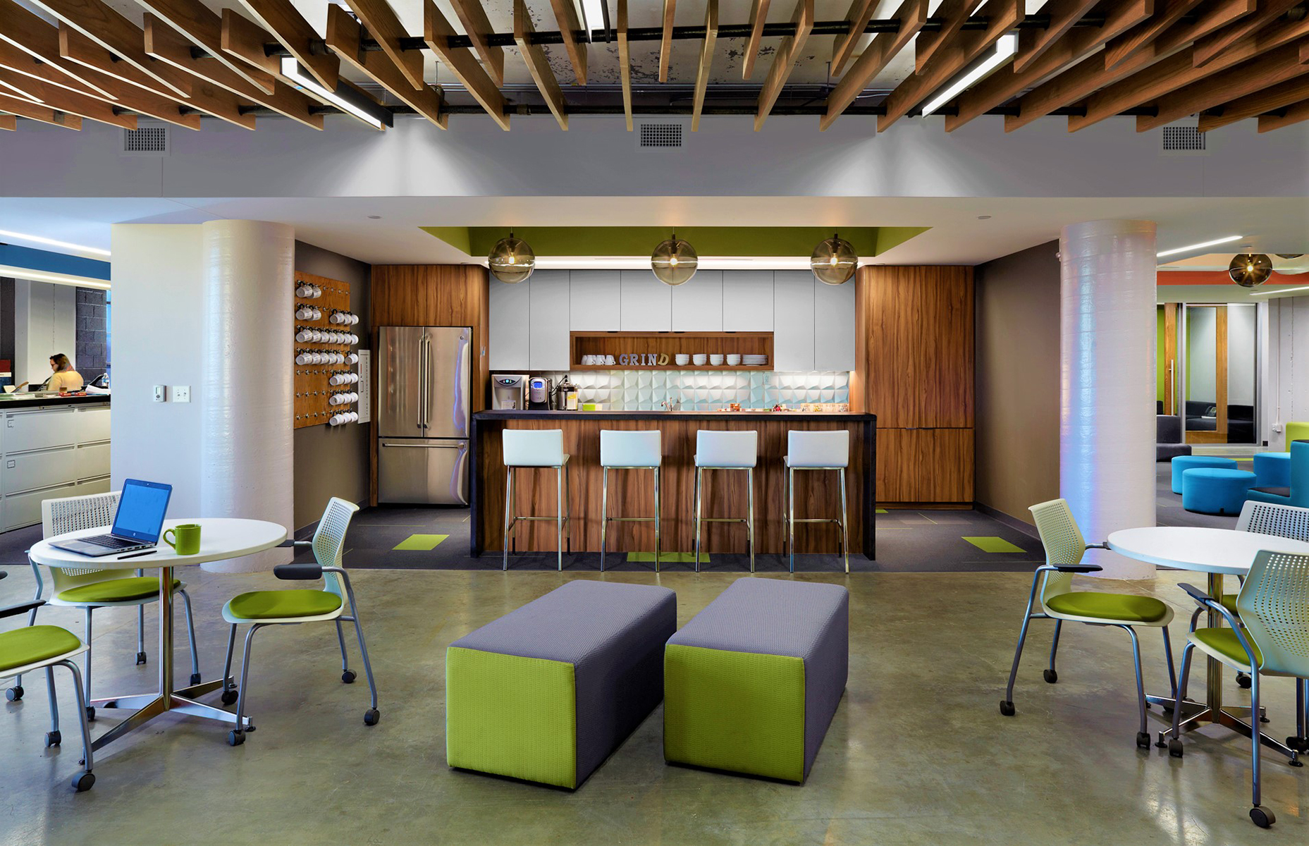 The project is located within a vast community of tenants of all use types. This prompted the design team to create features that showcased the design outwardly to the community. The material requirements of the new office translated to gritty, industrial aesthetics which were robust, durable and comprised of raw finishes. Exposed concrete, weathered steel and wood were explored. Vibrant wall coloring and furniture incorporated throughout the space emphasizes the organization’s upbeat and innovative vision.
