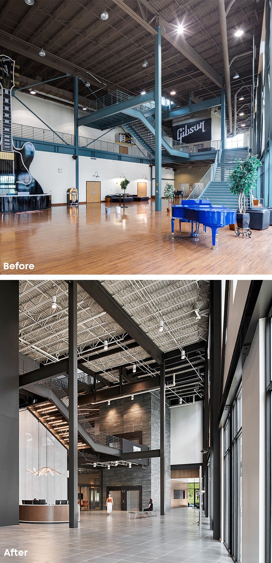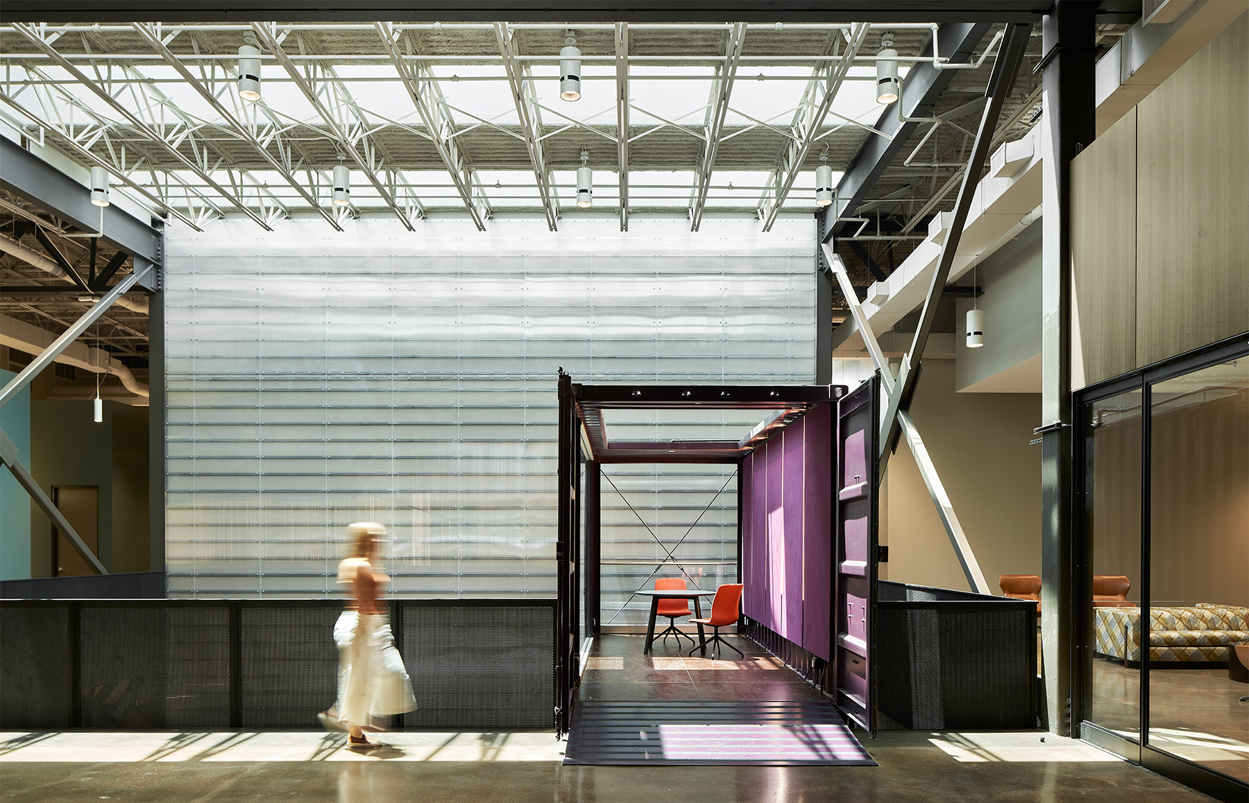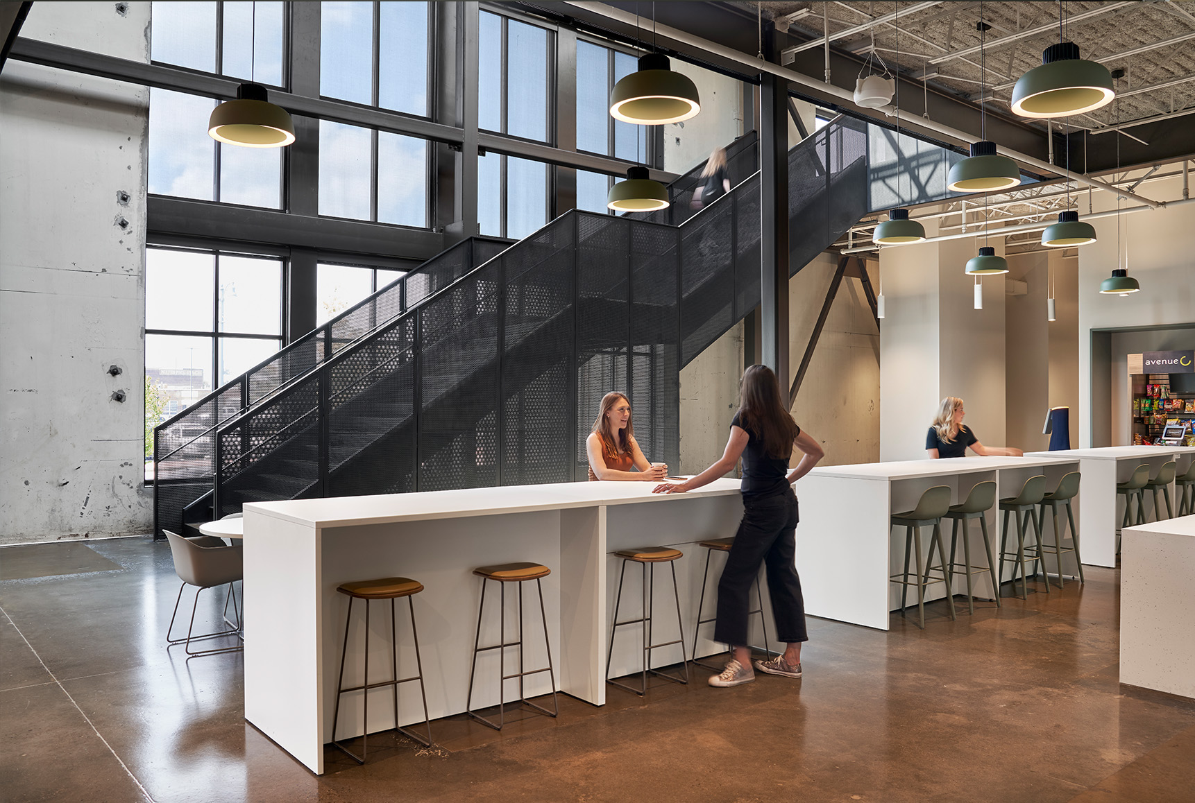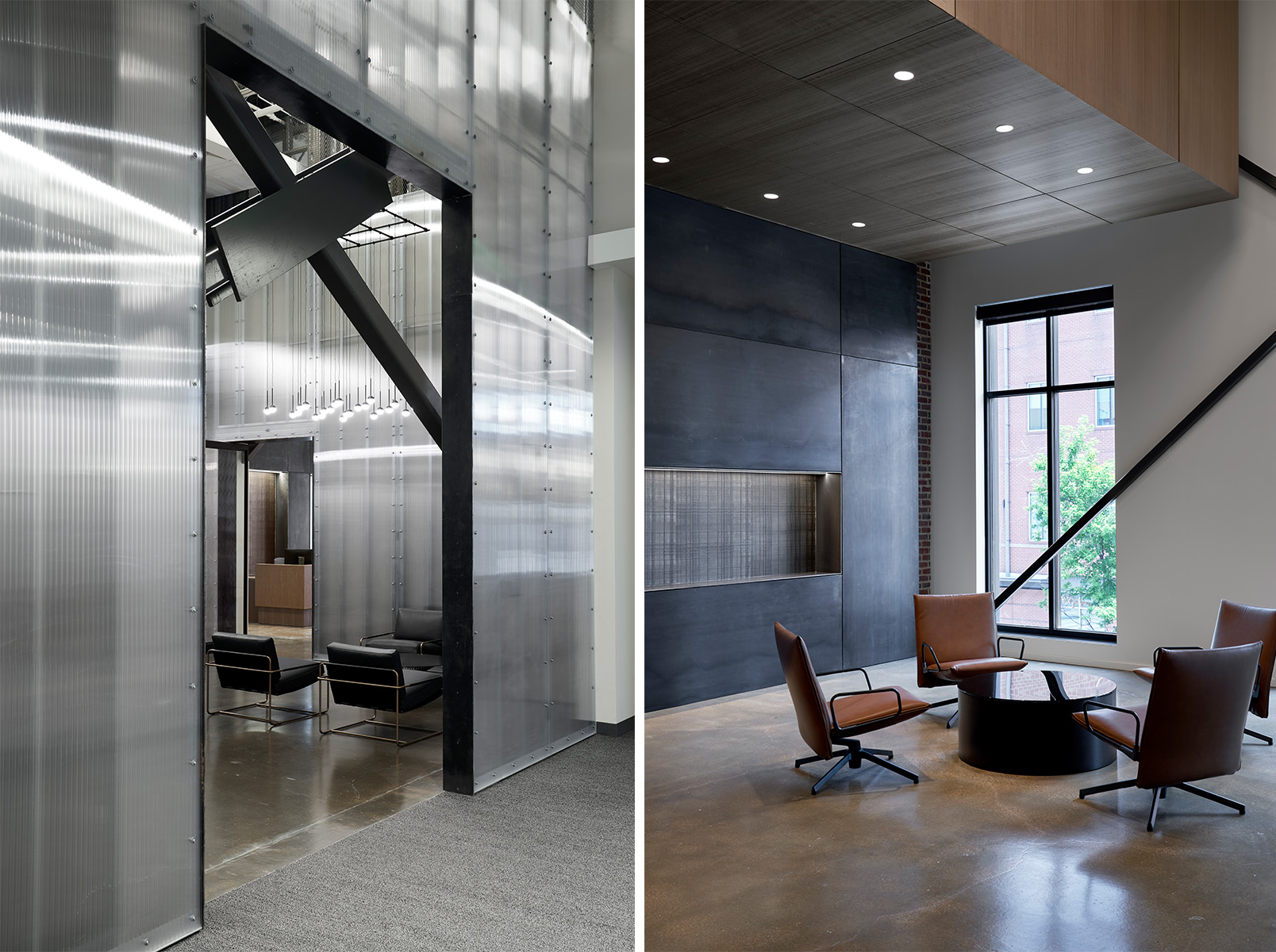 Project Statement: Repurposing a guitar manufacturing facility inside and out to become the global headquarters of a Fortune 50 company within a short timeframe was the challenge. Simultaneously programming, designing and documenting, the team created a singular design vocabulary to guide the vision. Showcase the client’s mission. Enhance the building’s industrial character. Create flexibility for collaborative technology innovators. Focus on wellness and sustainability: daylight and views, comfortable acoustics, indoor/outdoor connection, comfortable lighting and temperature management, encourage physical mobility, offer choice in work environment and intuitive technology. Structural steel was painted dark and expressed, raw concrete and brick left exposed. Windows were added at each façade, and skylights were composed to bring daylight across the entire floor plate without imposing glare onto worksurfaces. Views of the sky were essential. Monumental stairs and large openings between floors wrap stacked shipping containers that serve as meeting areas. The complimentary, contrasting elements of large format plate steel, translucent polygal and metal mesh were introduced to absorb and diffuse light, adding interest and texture. Blocking is exposed. Custom steel and glass pivot doors convey significance of place at the touch of the steel pull. A color palette of light woods, soft wall planes with deep grey-green and pale blue create a tranquil environment with layers of fresh white and citron to punctuate shared spaces. The floor plan streamlines traffic to modulate sound and distraction and finds odd, interesting nooks for “get away” vignettes—lounge seating, small meeting areas with a view, quiet no-click libraries, private phone rooms, or custom standing height flip-top tables. Acoustic insulation, felt baffles, and ceiling panels create an exceptional auditory environment and distinctive visual expression. Two-story gathering spaces at the employee entry and above, as well as at the new penthouse and rooftop, offer a fresh perspective and vantage point from this historic place, looking forward.