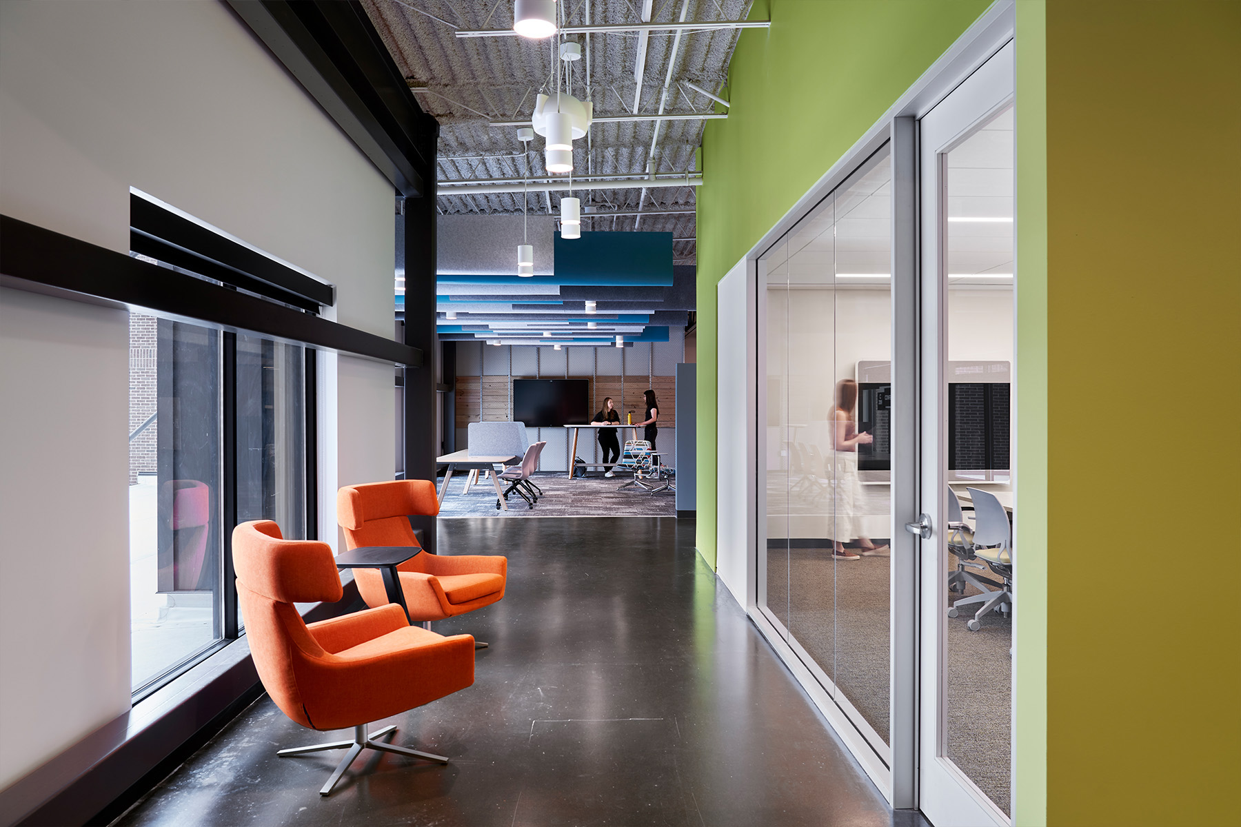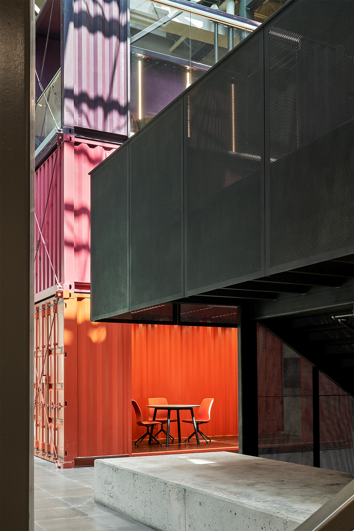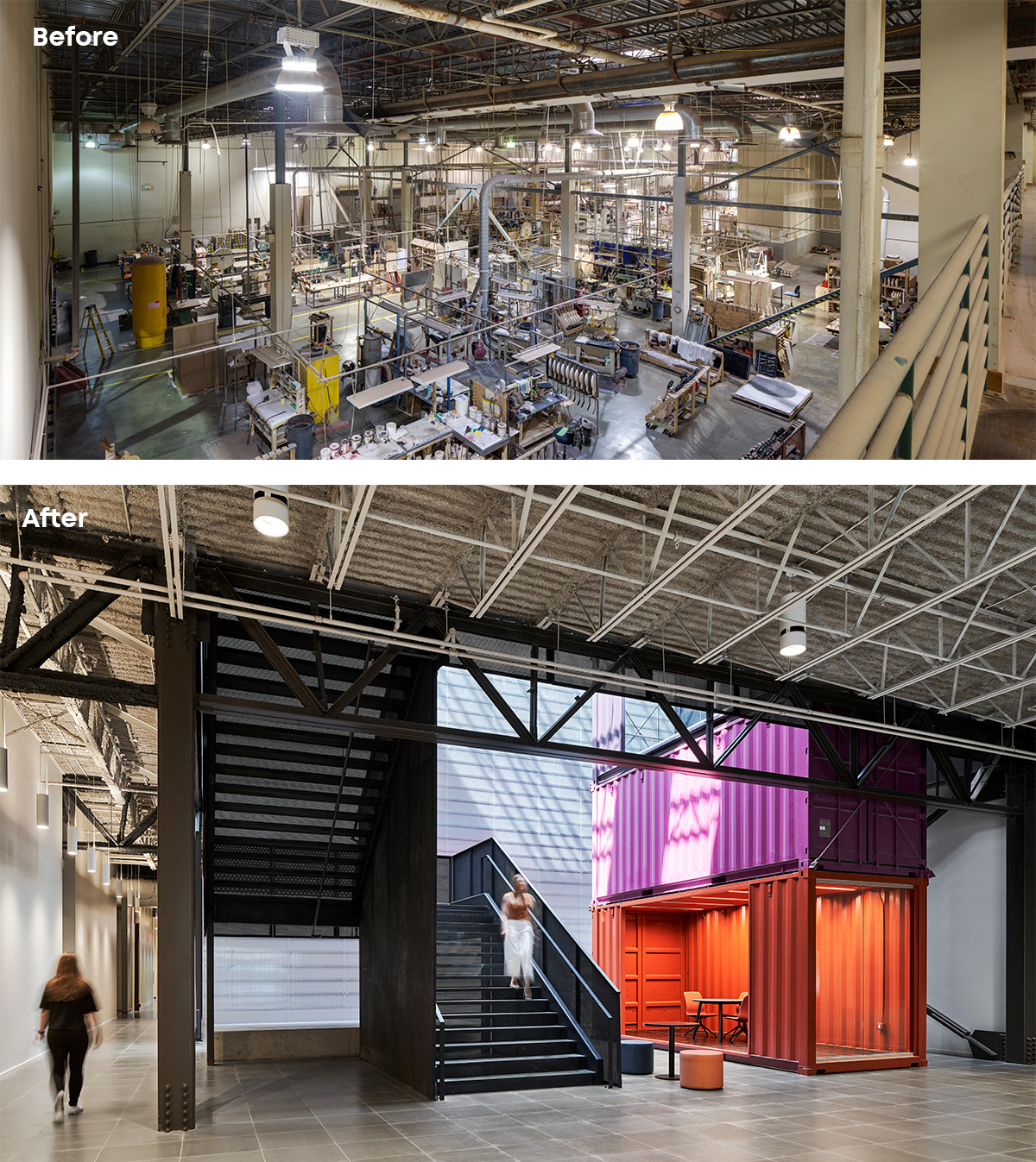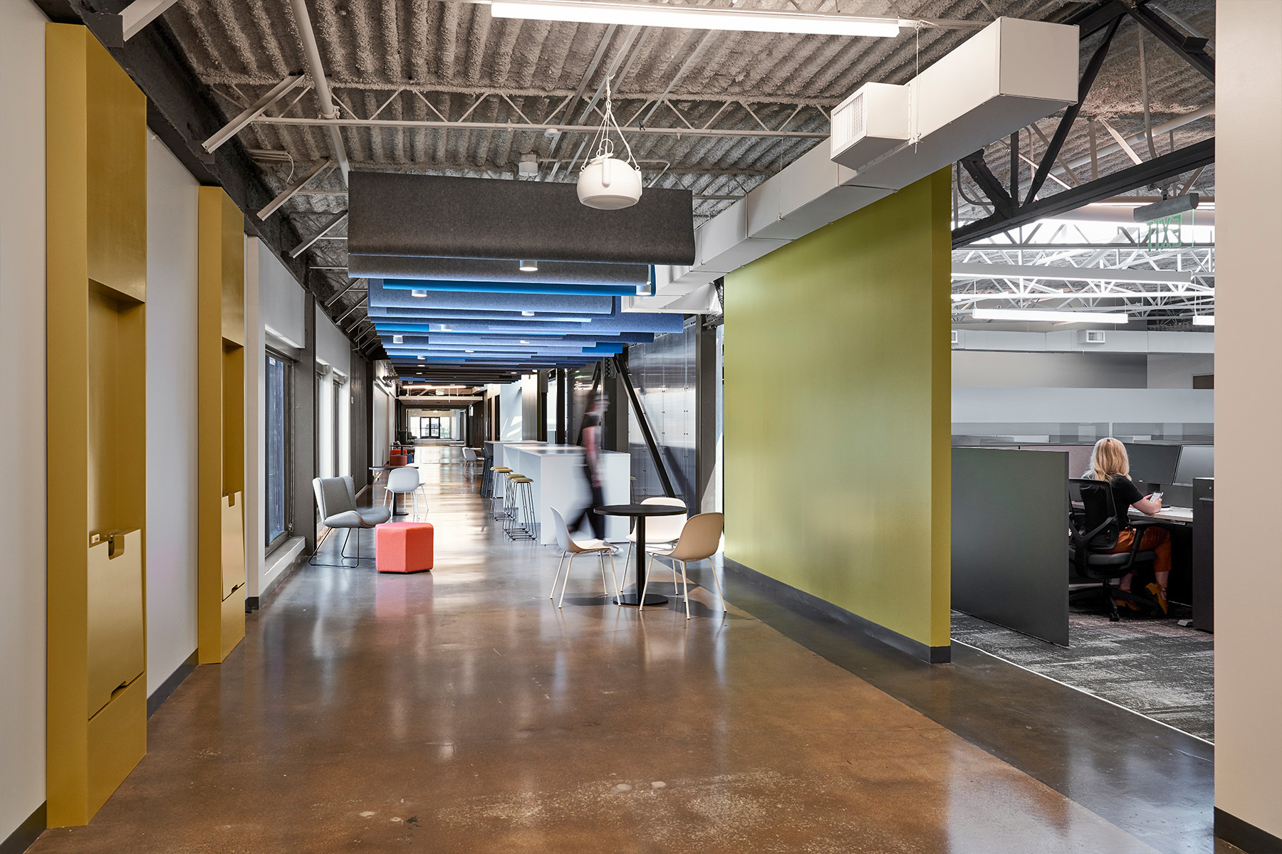 Project Statement: Repurposing a guitar manufacturing facility inside and out to become the global headquarters of a Fortune 50 company within a short timeframe was the challenge. Simultaneously programming, designing and documenting, the team created a singular design vocabulary to guide the vision. Showcase the client’s mission. Enhance the building’s industrial character. Create flexibility for collaborative technology innovators. Focus on wellness and sustainability: daylight and views, comfortable acoustics, indoor/outdoor connection, comfortable lighting and temperature management, encourage physical mobility, offer choice in work environment and intuitive technology. Structural steel was painted dark and expressed, raw concrete and brick left exposed. Windows were added at each façade, and skylights were composed to bring daylight across the entire floor plate without imposing glare onto worksurfaces. Views of the sky were essential. Monumental stairs and large openings between floors wrap stacked shipping containers that serve as meeting areas. The complimentary, contrasting elements of large format plate steel, translucent polygal and metal mesh were introduced to absorb and diffuse light, adding interest and texture. Blocking is exposed. Custom steel and glass pivot doors convey significance of place at the touch of the steel pull. A color palette of light woods, soft wall planes with deep grey-green and pale blue create a tranquil environment with layers of fresh white and citron to punctuate shared spaces. The floor plan streamlines traffic to modulate sound and distraction and finds odd, interesting nooks for “get away” vignettes—lounge seating, small meeting areas with a view, quiet no-click libraries, private phone rooms, or custom standing height flip-top tables. Acoustic insulation, felt baffles, and ceiling panels create an exceptional auditory environment and distinctive visual expression. Two-story gathering spaces at the employee entry and above, as well as at the new penthouse and rooftop, offer a fresh perspective and vantage point from this historic place, looking forward.