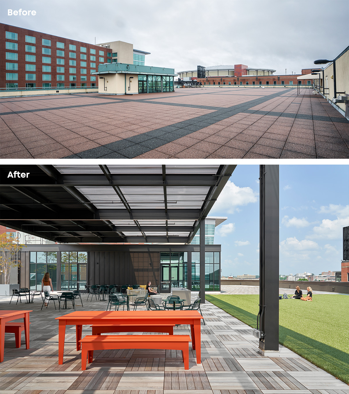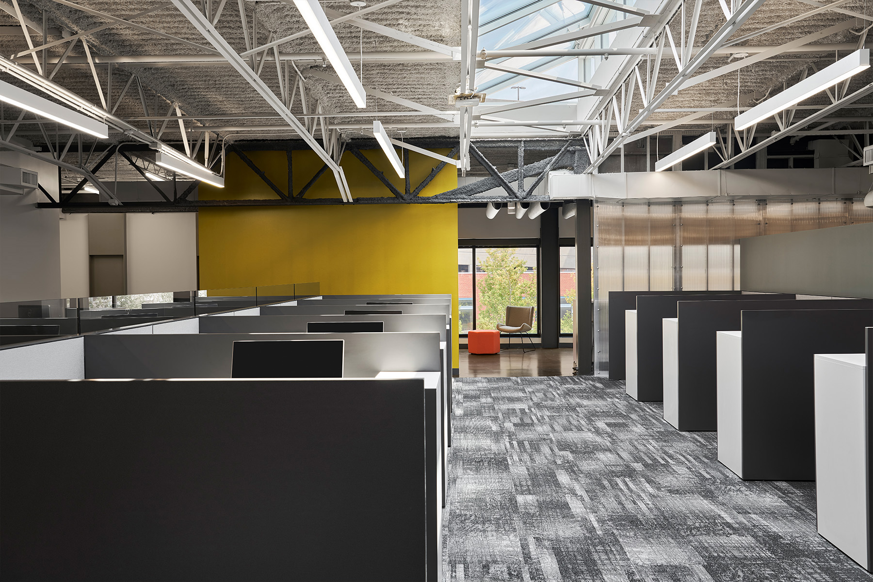 The Fortune 50 client sought to consolidate their innovative technology workforce from numerous locations around the world to a single headquarters in downtown Memphis. The selected building was a 150,000 SF guitar manufacturing facility with ad hoc additions made over time. To accommodate the nearly 700 employees within an agile workplace supporting boundless innovation and employee well-being, the design team added 50,000 SF in mezzanine and rooftop area, doubled the amount of window area, added nearly 4,000 SF in skylights, and created outdoor areas to embrace connections to the outdoors as well as to the downtown community.