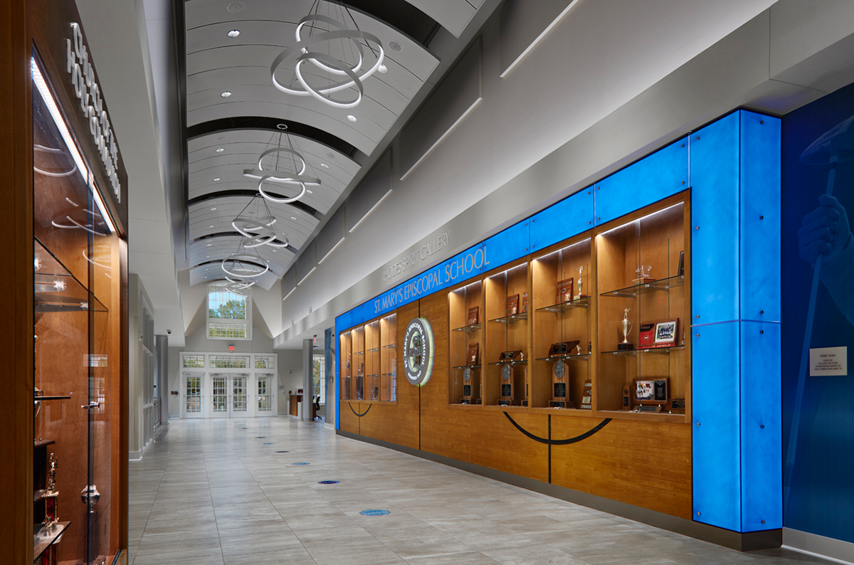 Bold and clean uses of the St. Mary’s blue create a distinct sense of place and identity. The second floor features a new gymnasium, locker rooms, a spirit store, concession stand, and a space for the St. Mary’s Athletic Hall of Fame. The gym features large windows, capturing more natural light, and a mezzanine for students to cheer on their peers during games. Having a strong nostalgic tie to the students and faculty of the school, the original Barth Gym floor was salvaged and reused in the design of the Hall of Fame, as well as building signage throughout the new building.