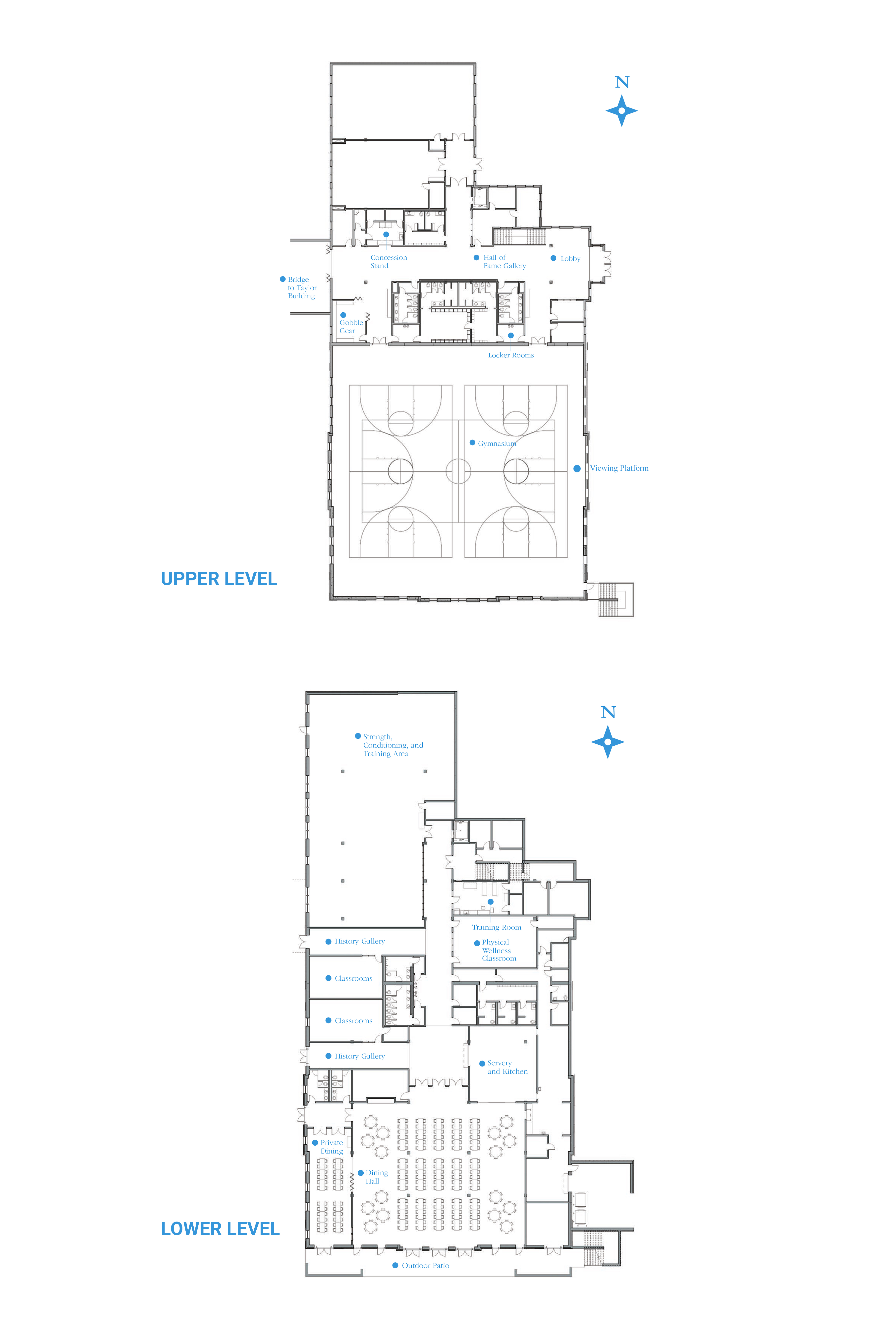 Photo by Jeffrey Jacobs. Photo 2 – The Main Lobby space is anchored by the trophy case, fabricated from salvaged floor of the gym this building replaced. This space also serves as the main connection between the church and school. Photo by Jeffrey Jacobs. Photo 3 – The Gymnasium has a combination of traditional bleacher seating, a court-side lounge for officials, and an elevated viewing platform provides a variety of ways to appreciate the game. Photo by Jeffrey Jacobs. Photo 4 – The Strength Training Room uses dark blue exposed ceiling keeping the focus down where it should be – on the work. Waterjet cut rubber flooring further integrates the school’s branding. Photo by Jeffrey Jacobs. Photo 5 - The large window openings help modulate the very large volume and blend the building into its traditional campus. Photo by Jeffrey Jacobs. Photo 6 - The building steps down in scale at the entrance as the canopy reaches out to engage the site. The new building more than tripled the amount of usable square footage compared to the existing buildings without reducing on-site parking. Photo by Jeffrey Jacobs. Photo 7 - The building and related site work ties together three existing school buildings, two church buildings, and the shared parking and circulation areas. This outdoor connector, designed to resolve five different finished floor elevations, features two open-air classrooms as well as casual seating and gathering areas, interspersed with shade-tolerant landscaping. Photo by Jeffrey Jacobs. Photo 8 - Floorplans by Firm.