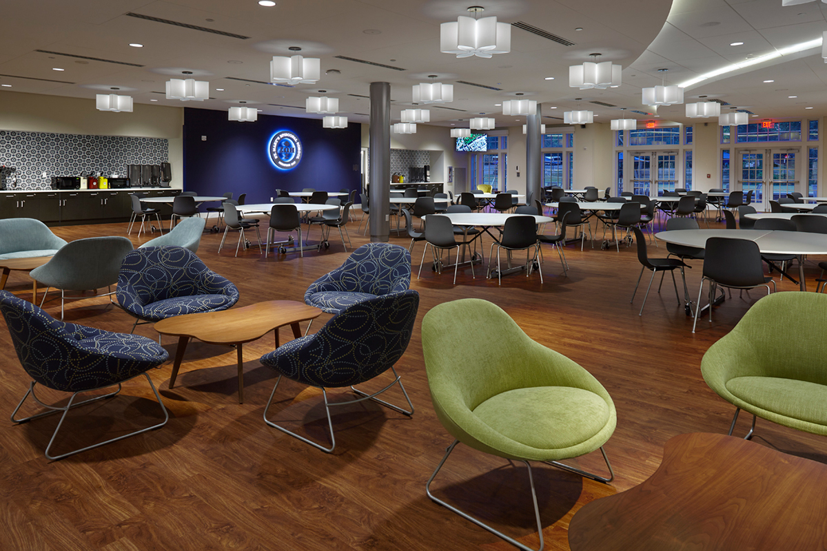 Photo 1 – The Dining Hall incorporates feminine light fixtures, various types of seating and a highly acoustical ceiling to diffuse sound from the Gymnasium above. Full height openings along the south flood the room with light and provide views and direct access to an outdoor patio overlooking the school’s sports fields.