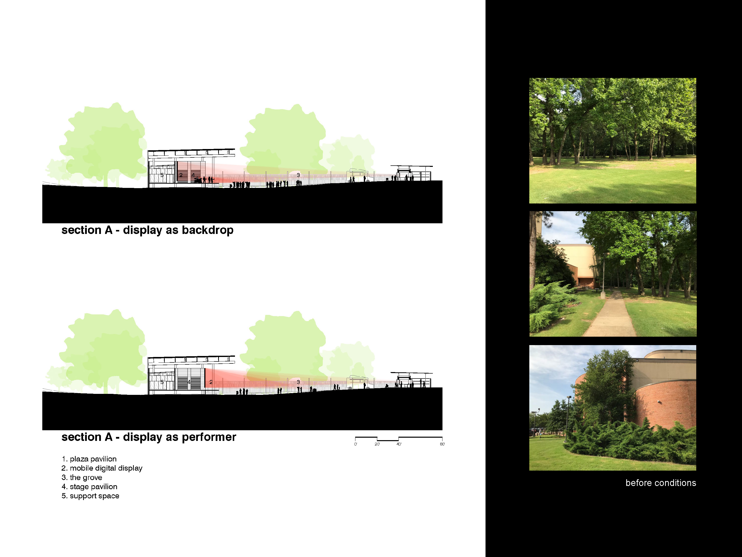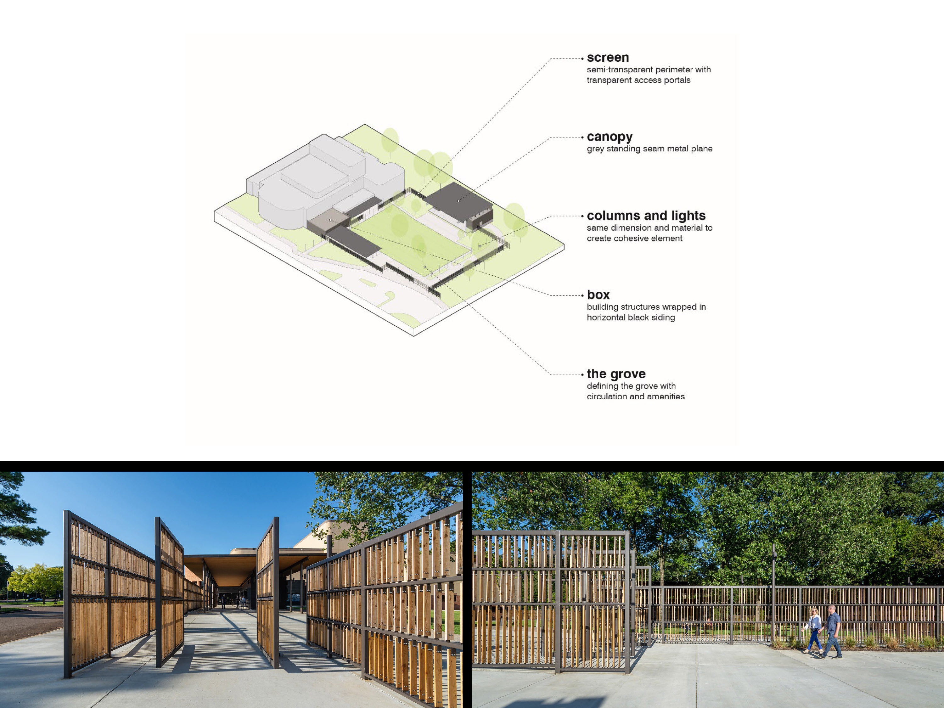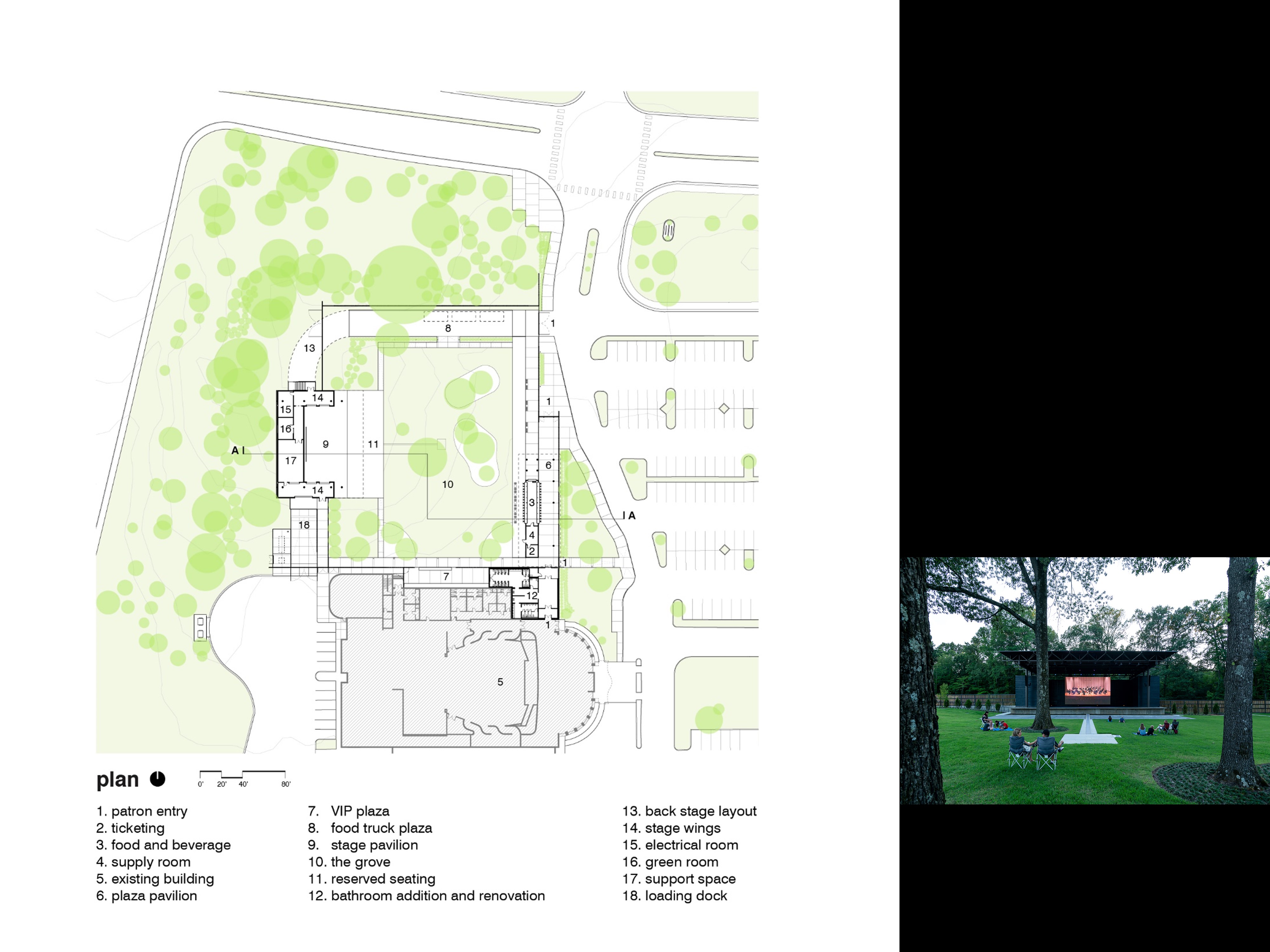 Seven elements craft the full experience. In addition to The Grove, The Park is an overall place holder of GPAC and its supporting programs. The Parking achieves much needed spaces to support GPAC and the existing nearby Athletic Club. The Front Door Plaza unifies GPAC venues and welcomes patrons. The Pavilion provides immediate access to offices, venue entries, and an expanded pre-function/art gallery/rental space. The Outdoor Balcony is elevated for special group activities and views. The Backstage Plaza brings purpose and life to the Germantown Parkway viewshed. The venue will be the only intimate outdoor performance venue in the region that can relocate a performance to an adjacent indoor performance theatre due to inclement weather.