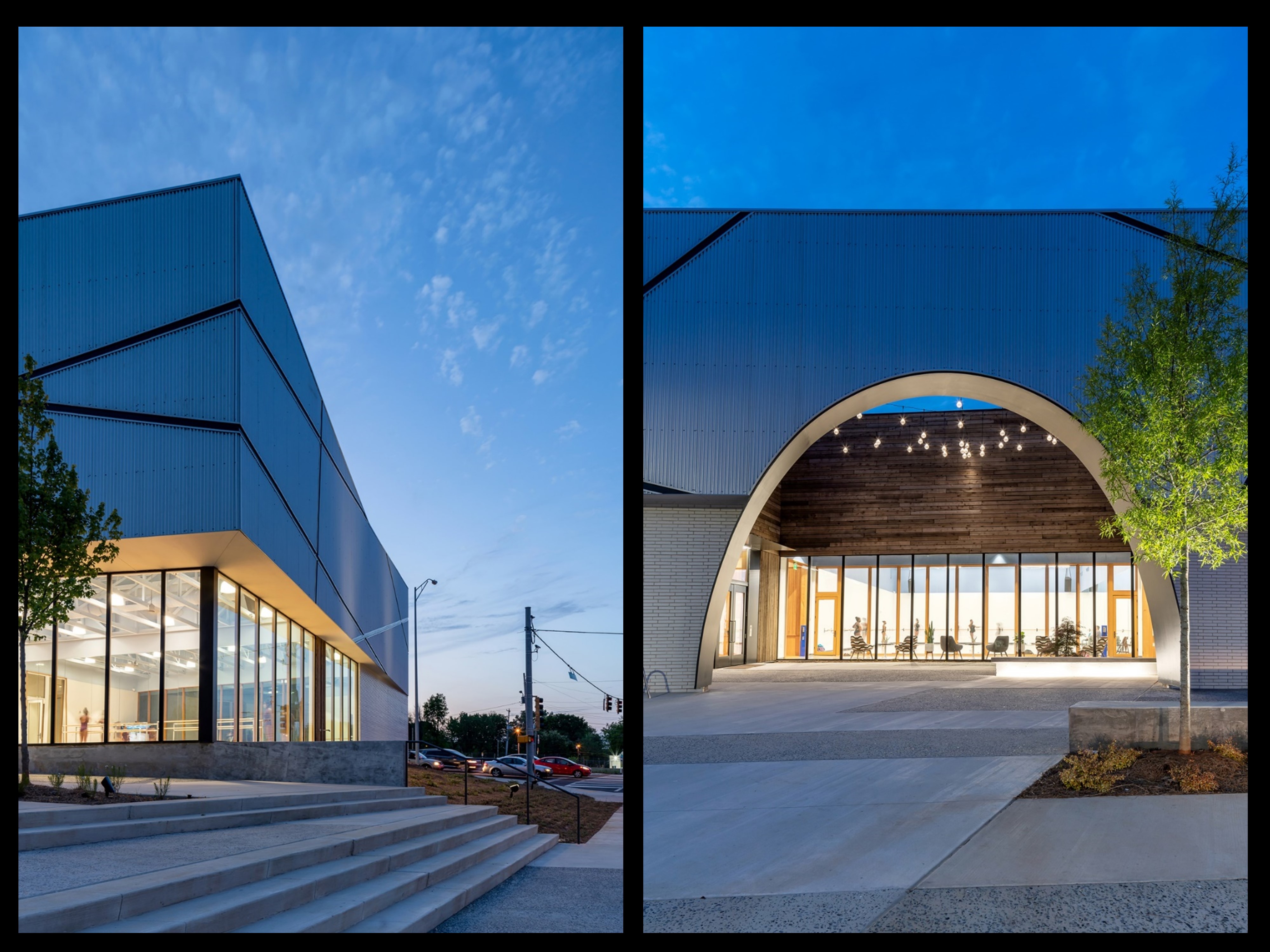 The building form was conceived as two tiers, alluding to two dancers in a lift. Glazed brick base offers durability and permanence at street level while holding up a lightweight, corrugated galvalume parapet. The lively metal parapet ‘crown’ dances in both plan and elevation, enclosing interior spaces and exterior courtyards and disguising varied roof heights between studios and public space.
