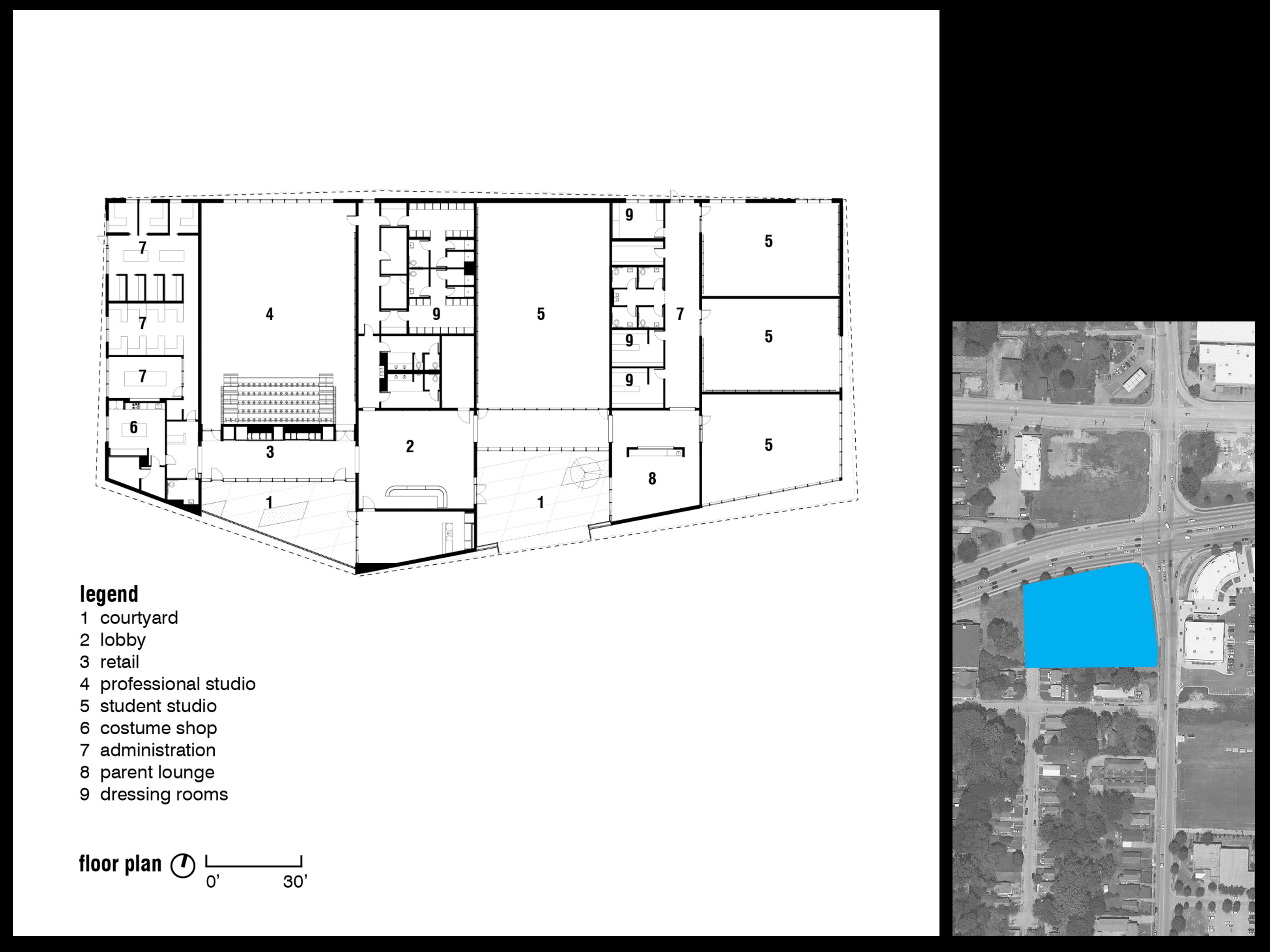 The company’s program was growth-minded, including: 4 rehearsal studios; performance studio; expanded administration spaces; lounges for Company dancers, Conservatory dancers and parents; retail space; dressing rooms; costume shop; and generous lobby and pre-function spaces including 2 courtyards and an outdoor plaza.