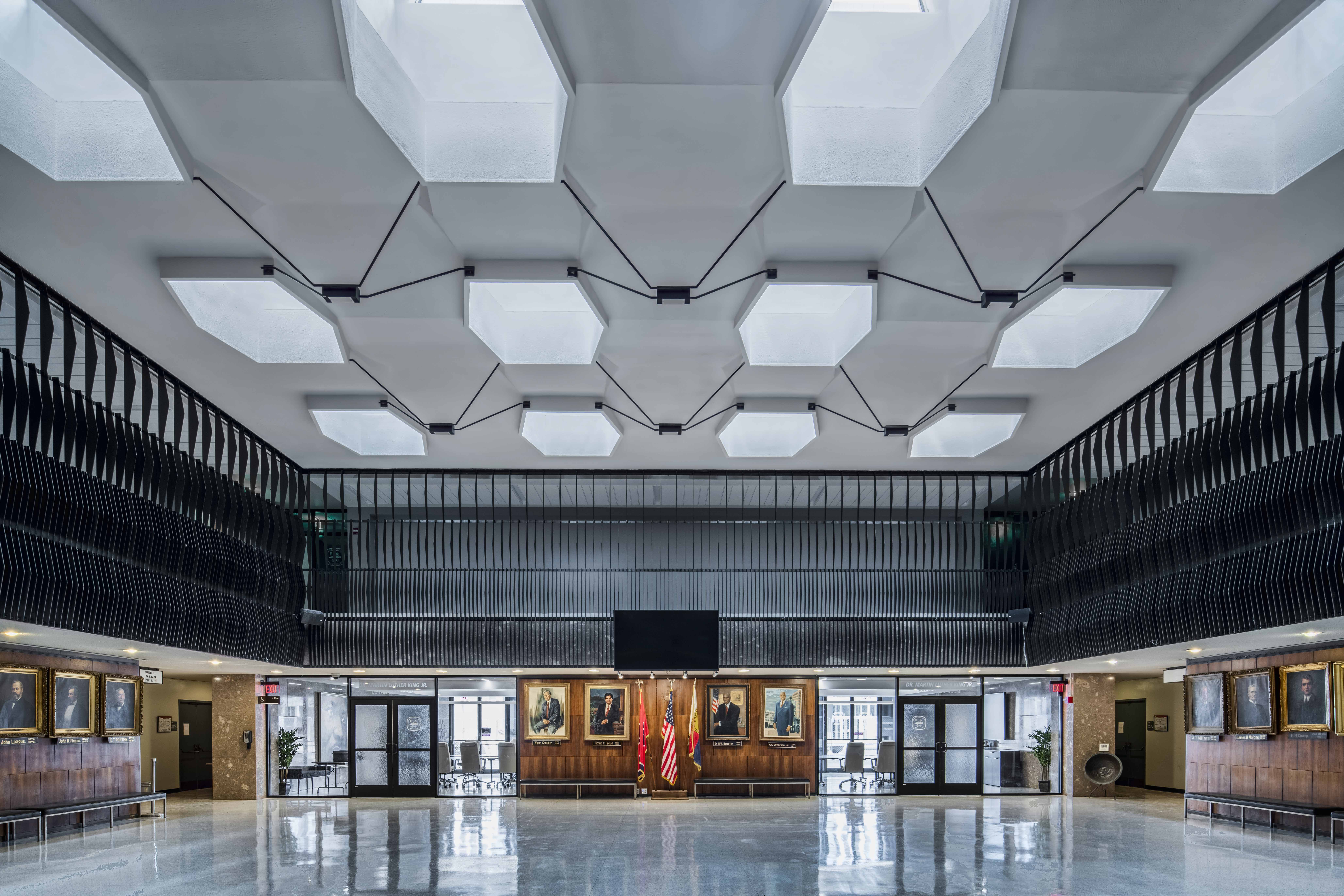 The City of Memphis had long needed a space to host meetings for large groups of people on the main floor of City Hall. Just north of the Hall of Mayors was a seldom used room initially designed as a Gallery, it was exceptionally finished with terrazzo floors and walls and a wood accent wall. In conjunction with MLK50, the architect designed the new Conference Room and the City commissioned local artist Lonnie Robinson to create a 6’ tall painting of Dr. Martin Luther King, Jr. to set a tone of collaboration and community action within the space. The Hall of Mayors, which connects The Council Chamber and MLK Conference Room, also received upgrades to the skylights, increasing natural light and reviving an interior foyer.