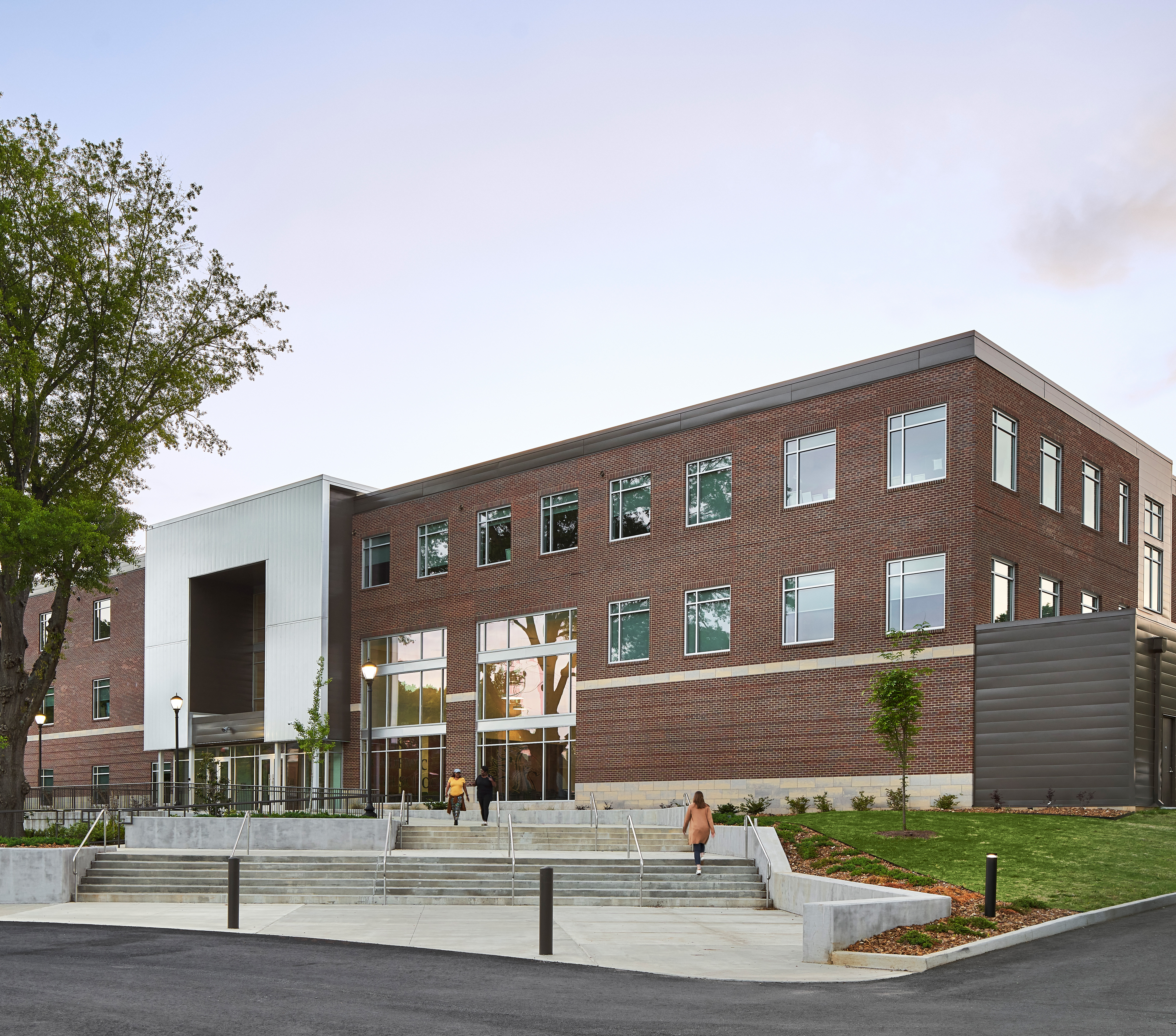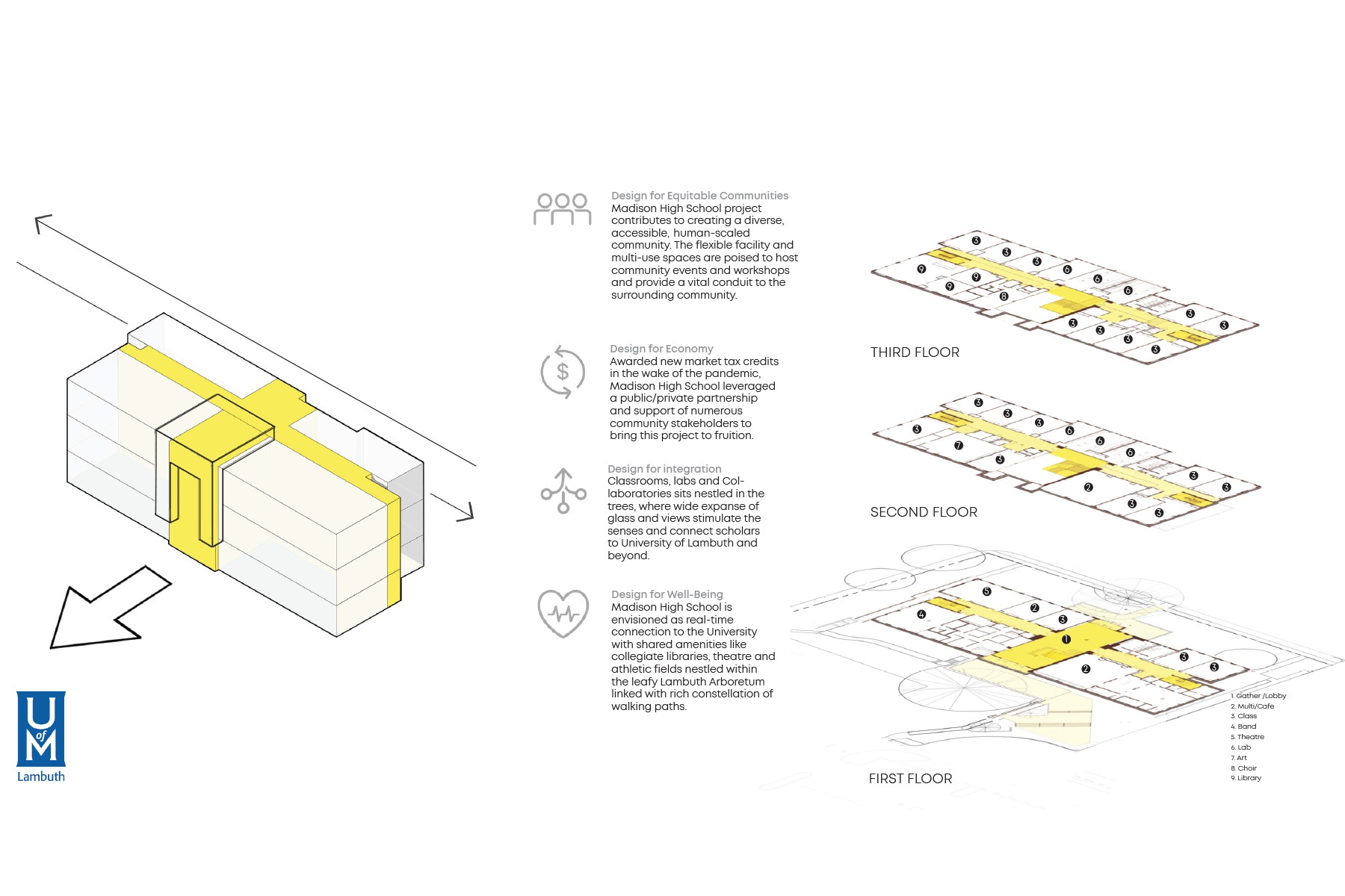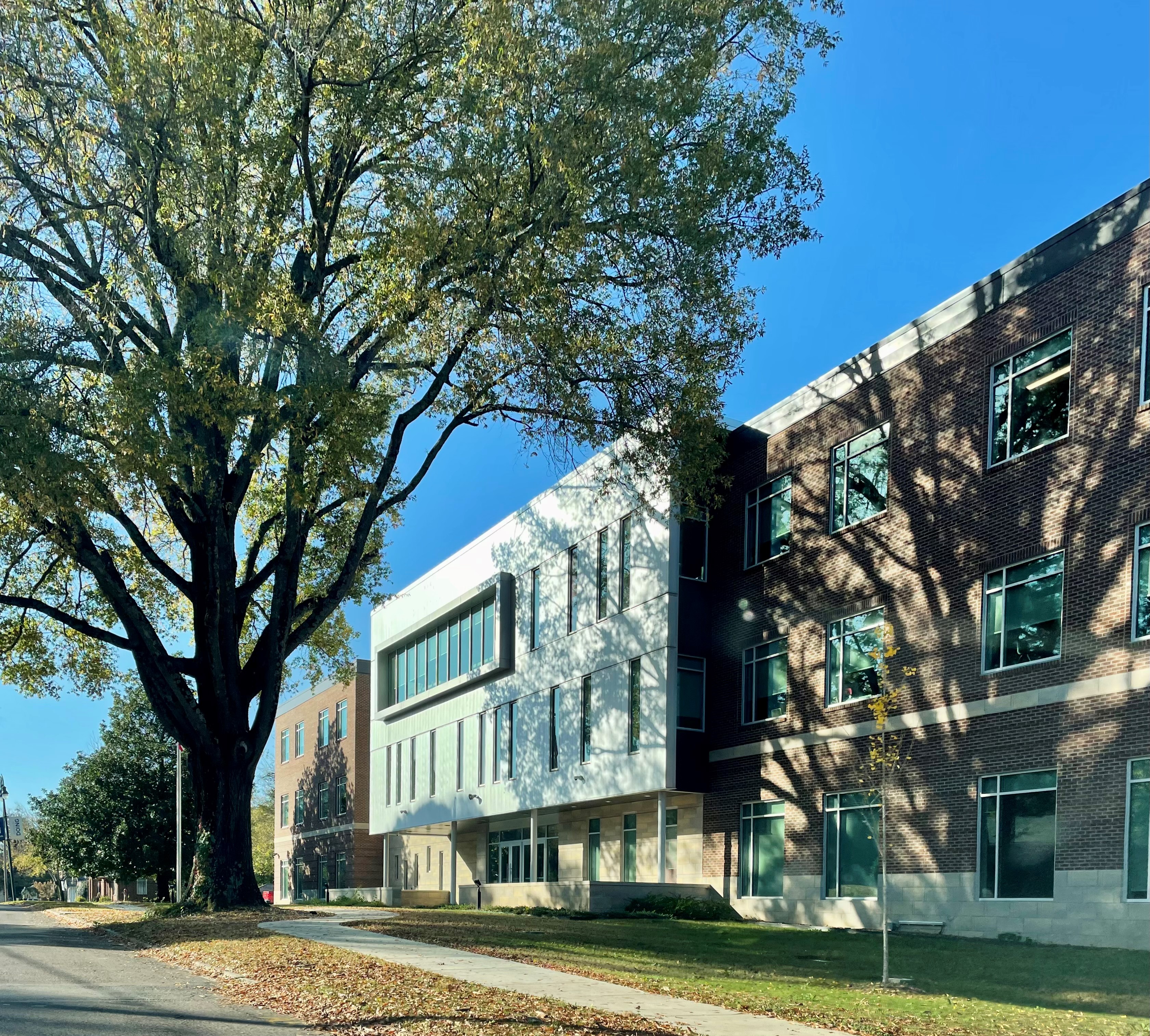 Madison High School classrooms, labs and Col-laboratories sits within the framework of the existing Lambuth Georgian Campus grid of quads and open greens. Wide expanse of glass and views stimulate the senses and connect scholars to University of Lambuth and beyond. Madison High School project contributes to creating a diverse, accessible, human-scaled community. The flexible facility and multi-use spaces are poised to host community events and workshops and provide a vital conduit from the surrounding neighborhood. One of the final projects to be awarded new market tax credits in the wake of the pandemic, Madison High School has been successful in galvanizing a broad public/private partnership and support of numerous community stakeholders to bring this project to fruition. Madison High School dual enrollment serves as tangible connection to the University of Memphis with shared amenities like collegiate libraries, theatre and athletic fields nestled within the Lambuth Arboretum linked with rich constellation of walking paths. The three-story masonry structure offers a fresh interpretation of collegiate architecture with a material palette harmonized with the historic campus