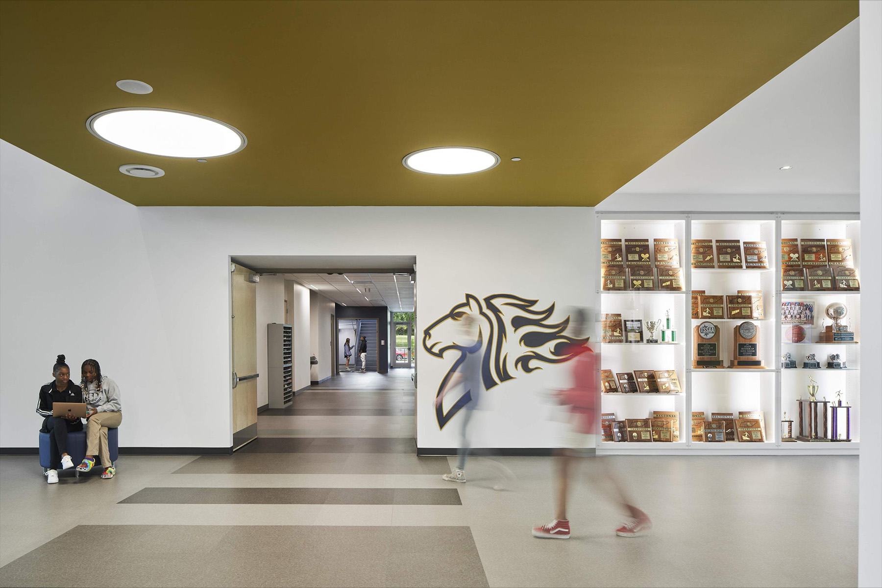 7. Hallways are lined with illuminated trophy cases to primarily generate school pride and coincidently promotes a sense of place. The flooring pattern indicates a progression of education and marks the location of classrooms. Photo by: Nick McGinn