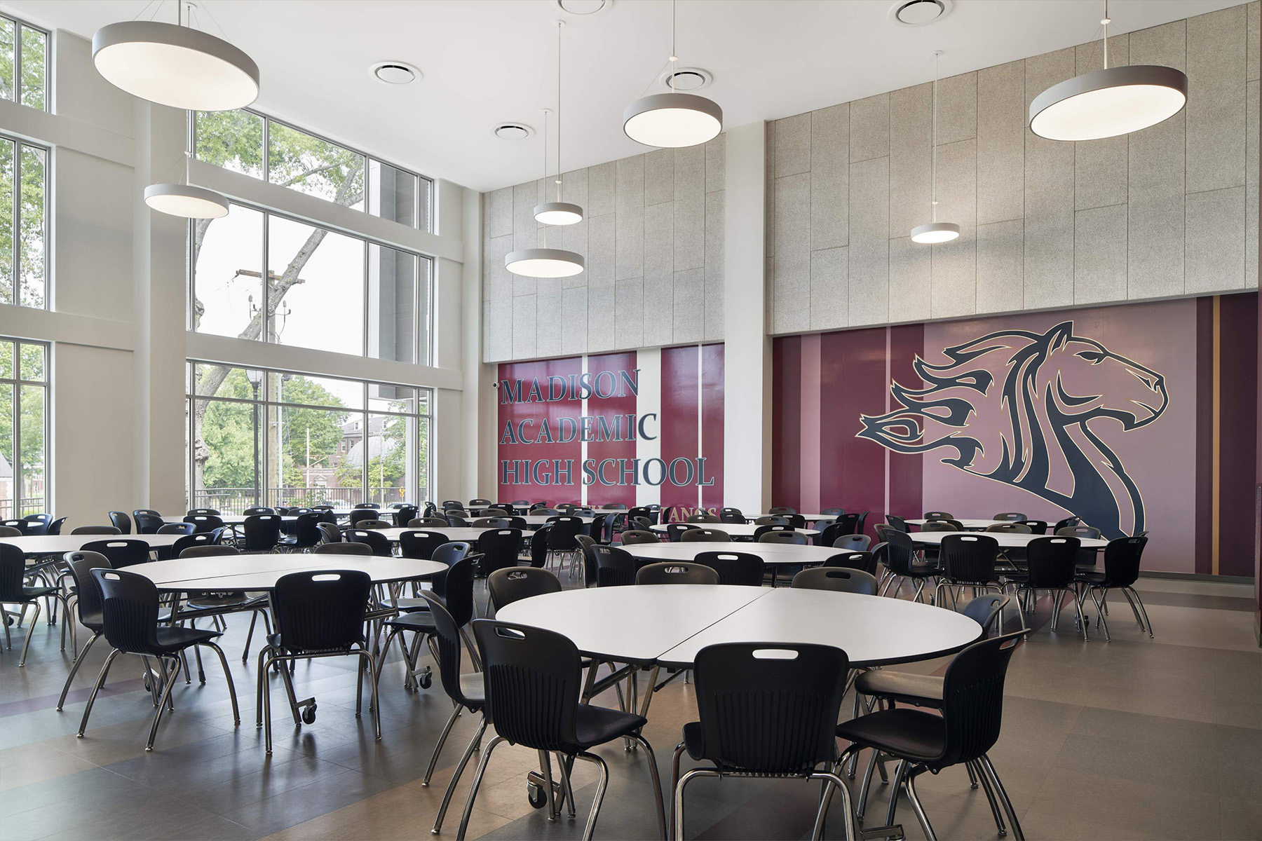 8. The cafeteria is a multifunctioning flexible space open to light and future possibilities. Its design was predicated on the future yet captures the feeling of home for the Madison Mustangs. Photo by: Nick McGinn