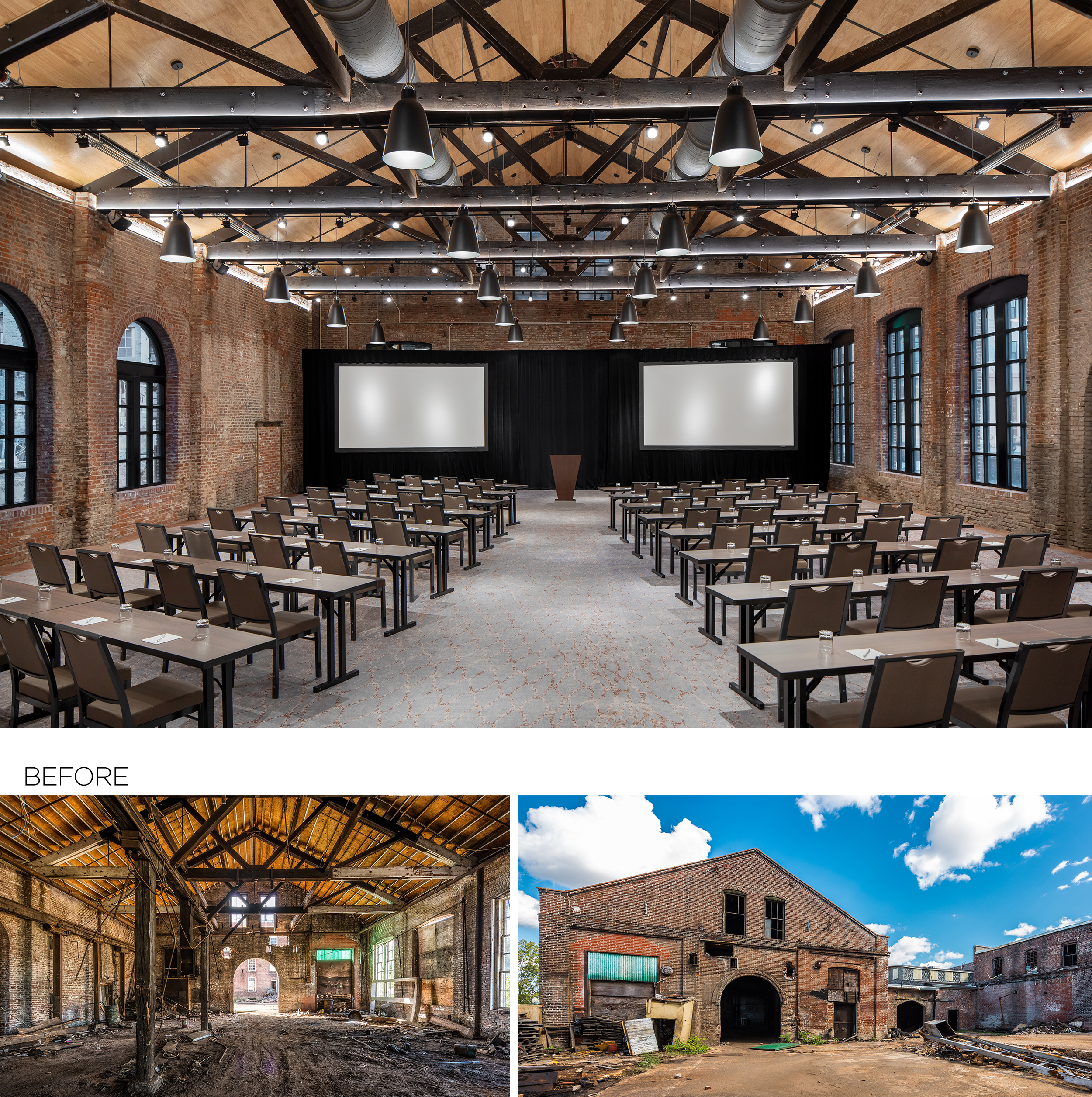 Existing on the site and built in 1878, the Ellis Machine Shop buildings were repurposed for the hotel’s event, conference, and meeting space. Designers honored the inimitable history of the former blacksmith shop by integrating them into the overall property and referencing the building and its original use throughout the hotel’s interior design and detailing. Several of the machine shop’s tools and castings were used to create a unique front check-in desk. The new building material palette is rooted in the local design traditions in this historic area of Memphis. Composed of metal, brick, concrete, and glass, all of which allow both the structure to blend contextually with the immediate neighborhood and being an architecture of its time.