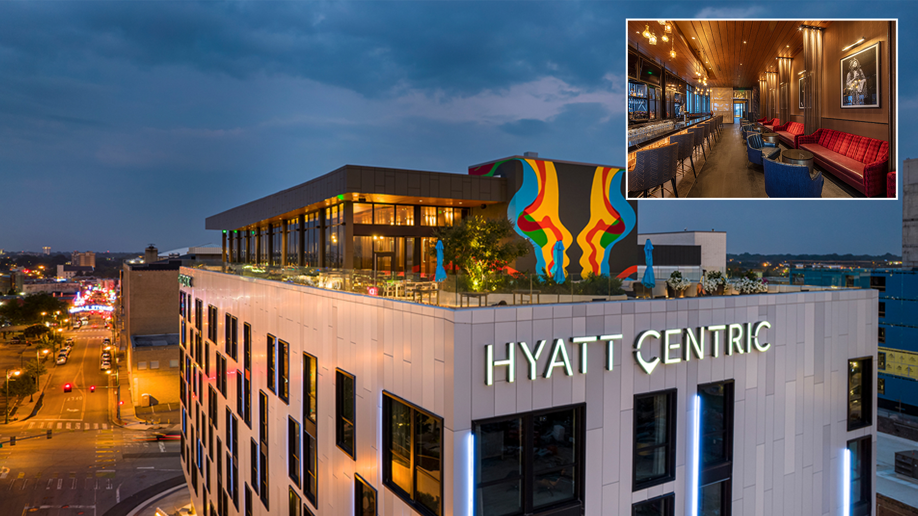 04 – Hotel bar and lounge is sited at a ‘see and be seen’ corner location at Beale and Front. Exterior Photo by Dero Sanford. Inset photo by Chris Villano.