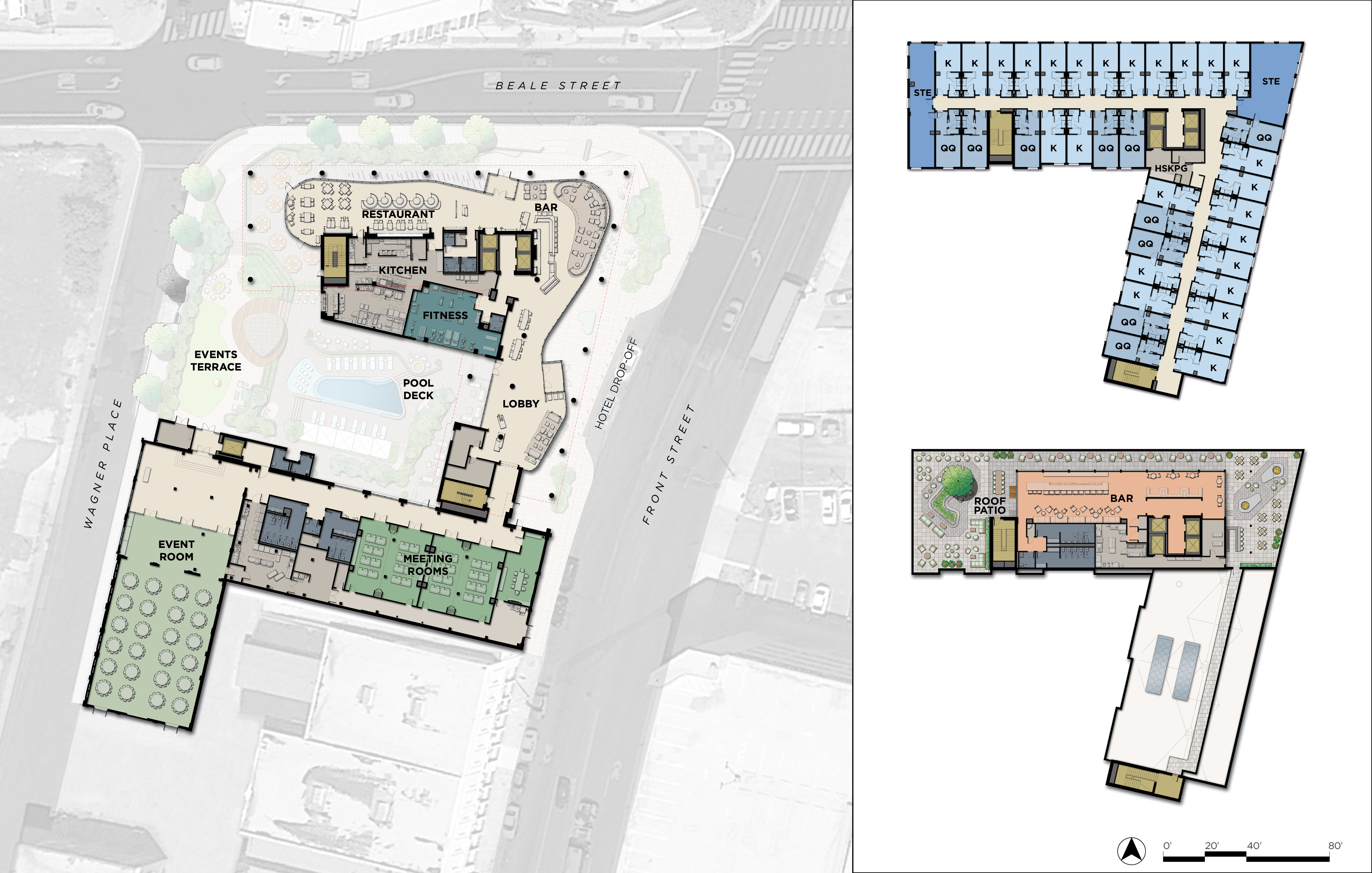 The mass of the hotel is elevated on concrete columns and wrapped around an interior courtyard providing full visibility for ground level amenities through a serpentine glass wall. Shaped to mimic the adjacent riverbank and reference the curves and shapes of musical instruments, the curving glass wall recesses within the hotel perimeter to create a three-sided loggia. This loggia provides covered outdoor spaces for entry canopy and outdoor patio dining at the restaurant with a view overlooking the river. While the facades along Beale and Front respect the tight urban condition, the courtyard facades around the pool deck are more playfully patterned to create a village-like scale and more intimate environment adjacent to the historic buildings.