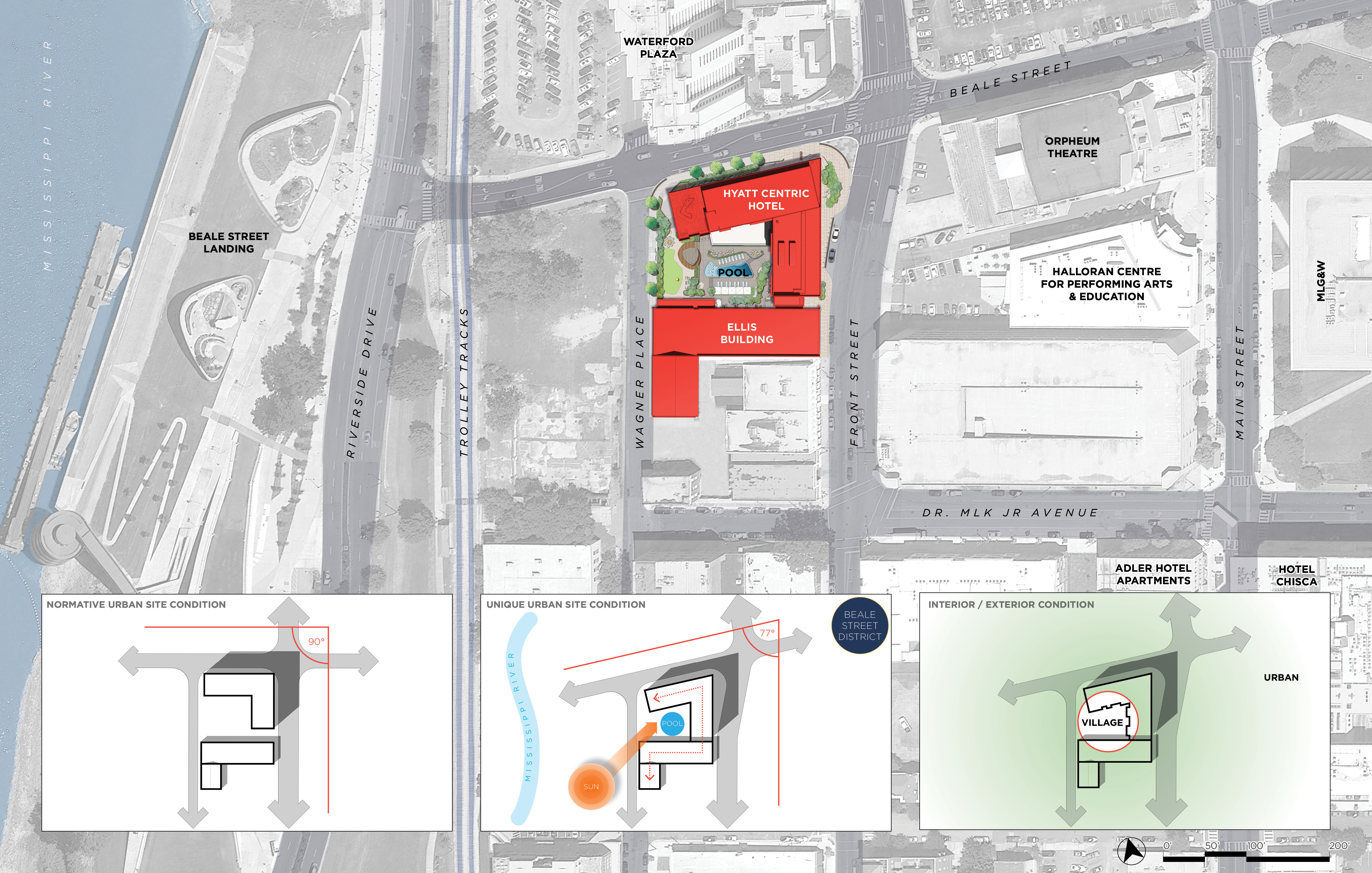 The contemporary new hotel design is intended to provide a missing connection of activity and excitement from the Beale Street Historic District to the origin of Beale Street at the Mississippi River. The musically inspired ideas of flow, pitch, meter, rhythm, sound, repetition, vibration, and resonance are found throughout the design. These ideas are expressed in the staggered patterning of the window placement which recall sheet music and guitar fret patterns. These patterns are accentuated at night with bars of light adjacent to the windows which provide a musically inspired programmable light show on the urban facades.