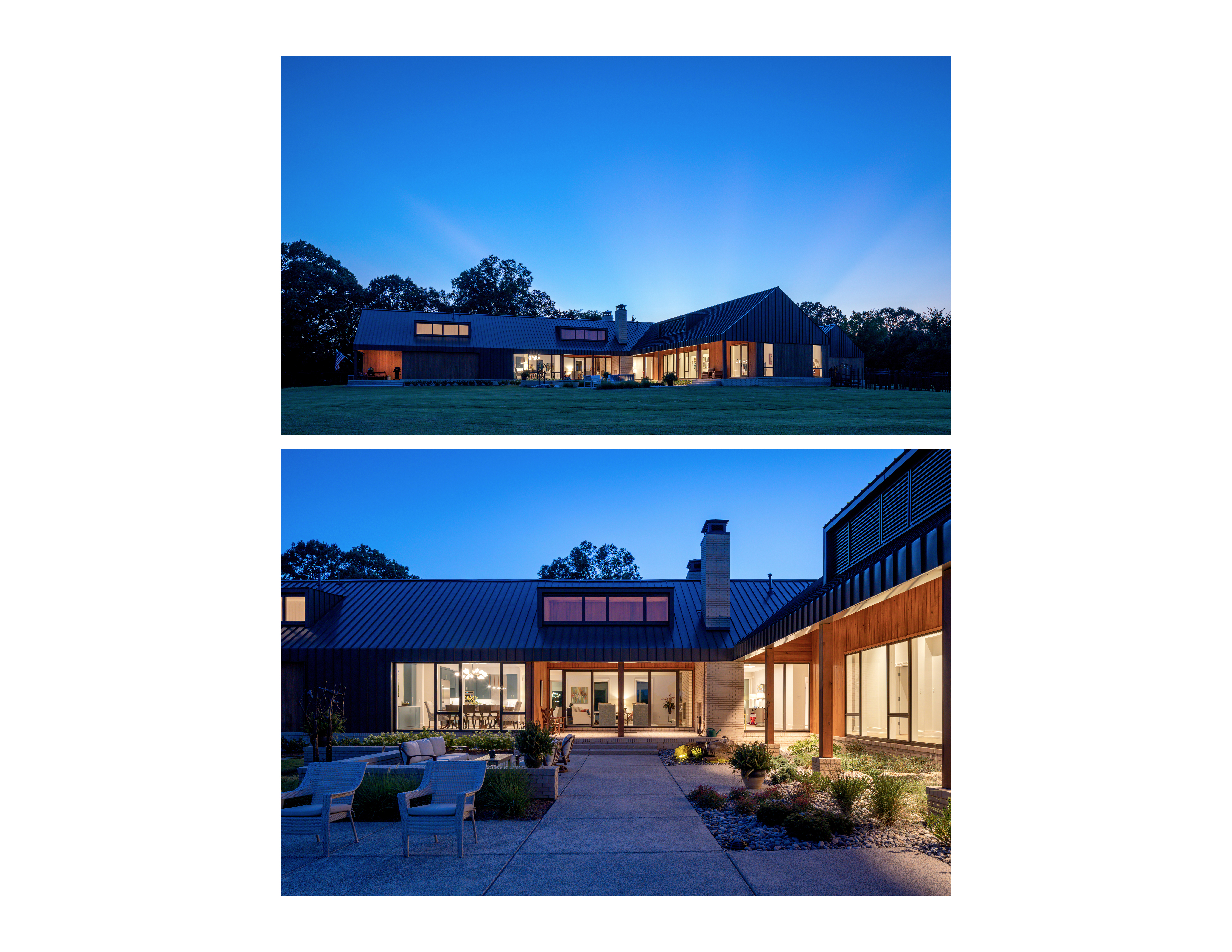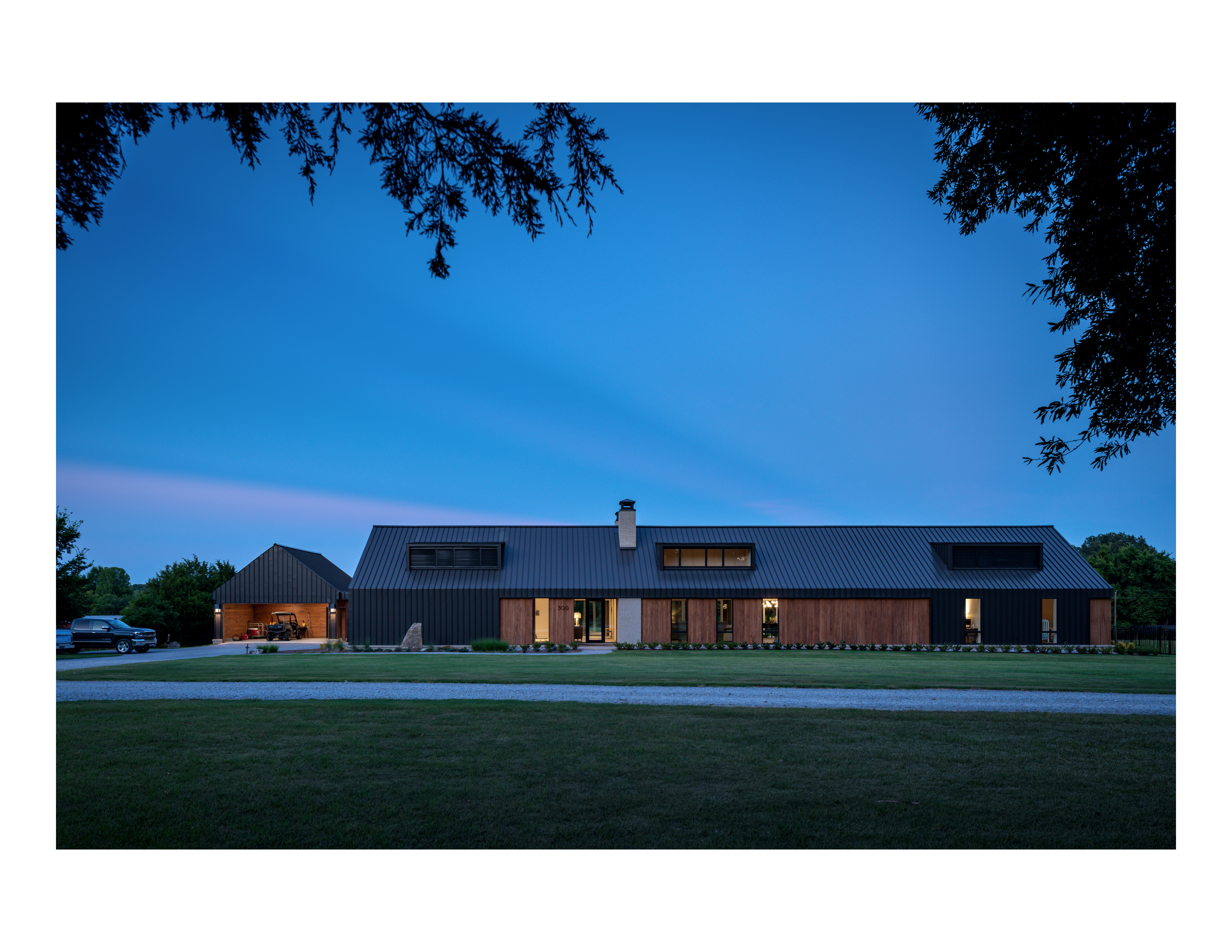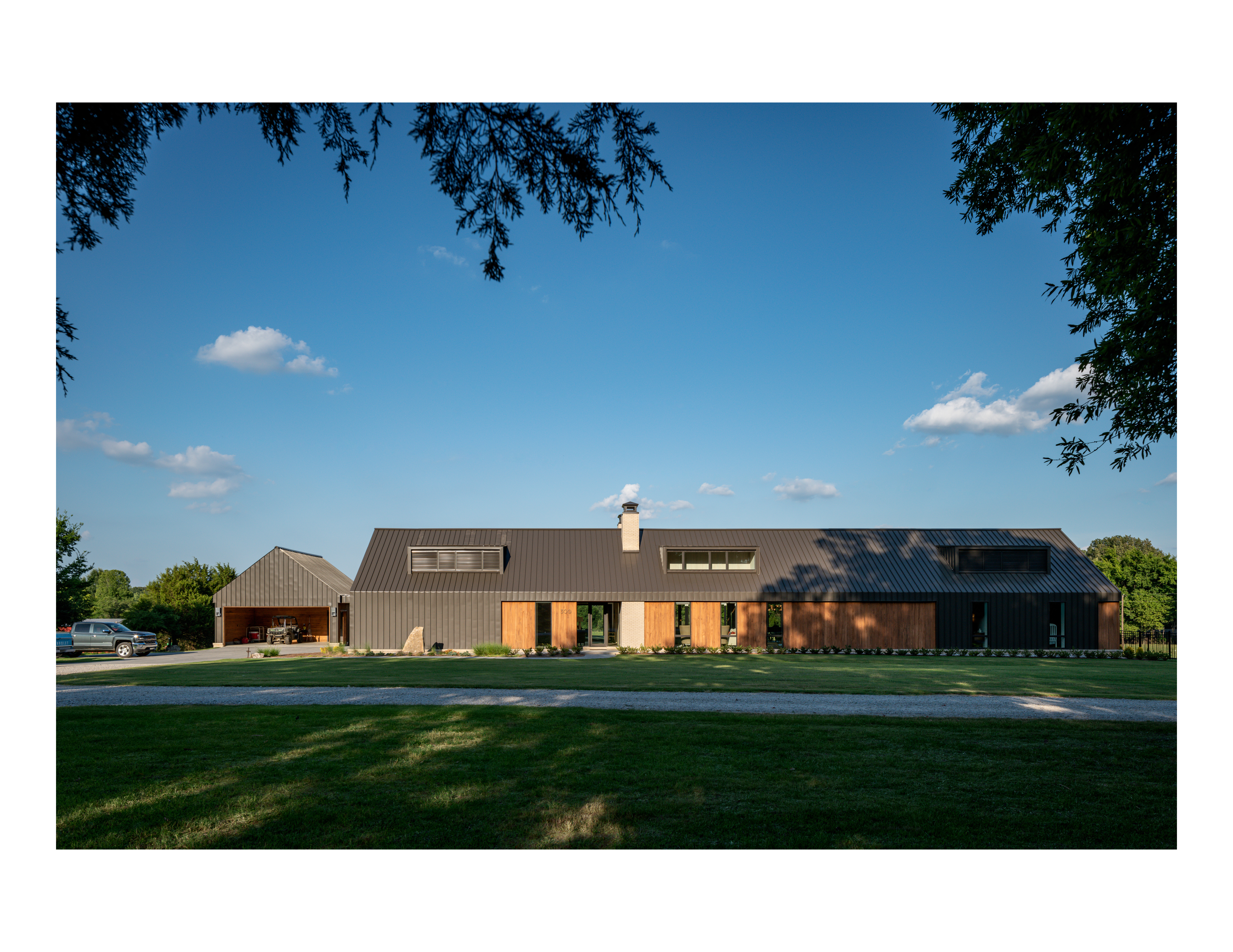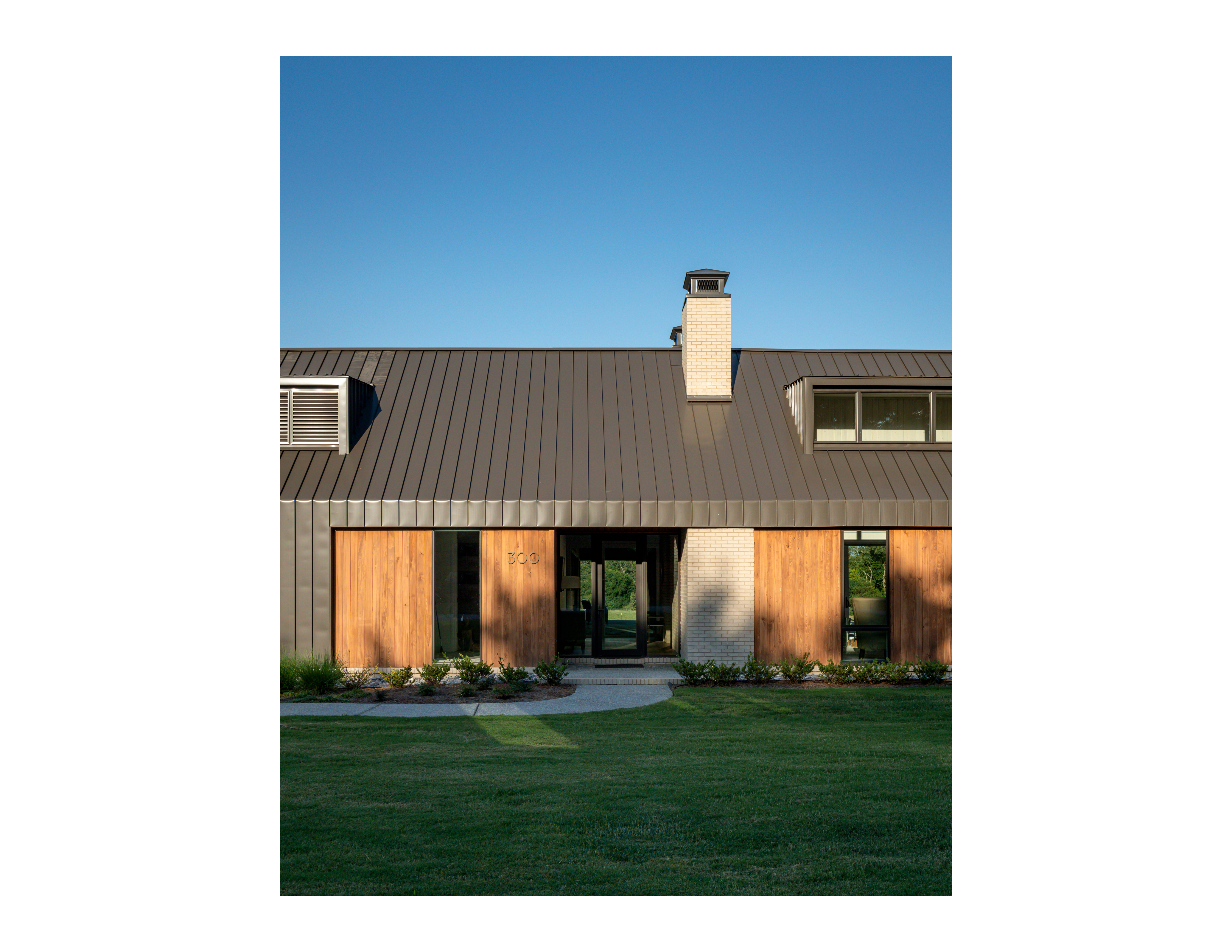Located in a cattle pasture on land owned by the family for generations in Piperton, Tennessee, the home is designed to maximize the views of the idyllic setting and offer a comfortable gathering space for friends and family. A simple gabled form, the material palette draws from the home’s natural setting with earthy bronze metal softened by accents of cedar siding. Strategic placement of punched windows, overhangs and dormers control the harshest light, while longer spans of window walls offer views of the rolling hills and tree canopy beyond.