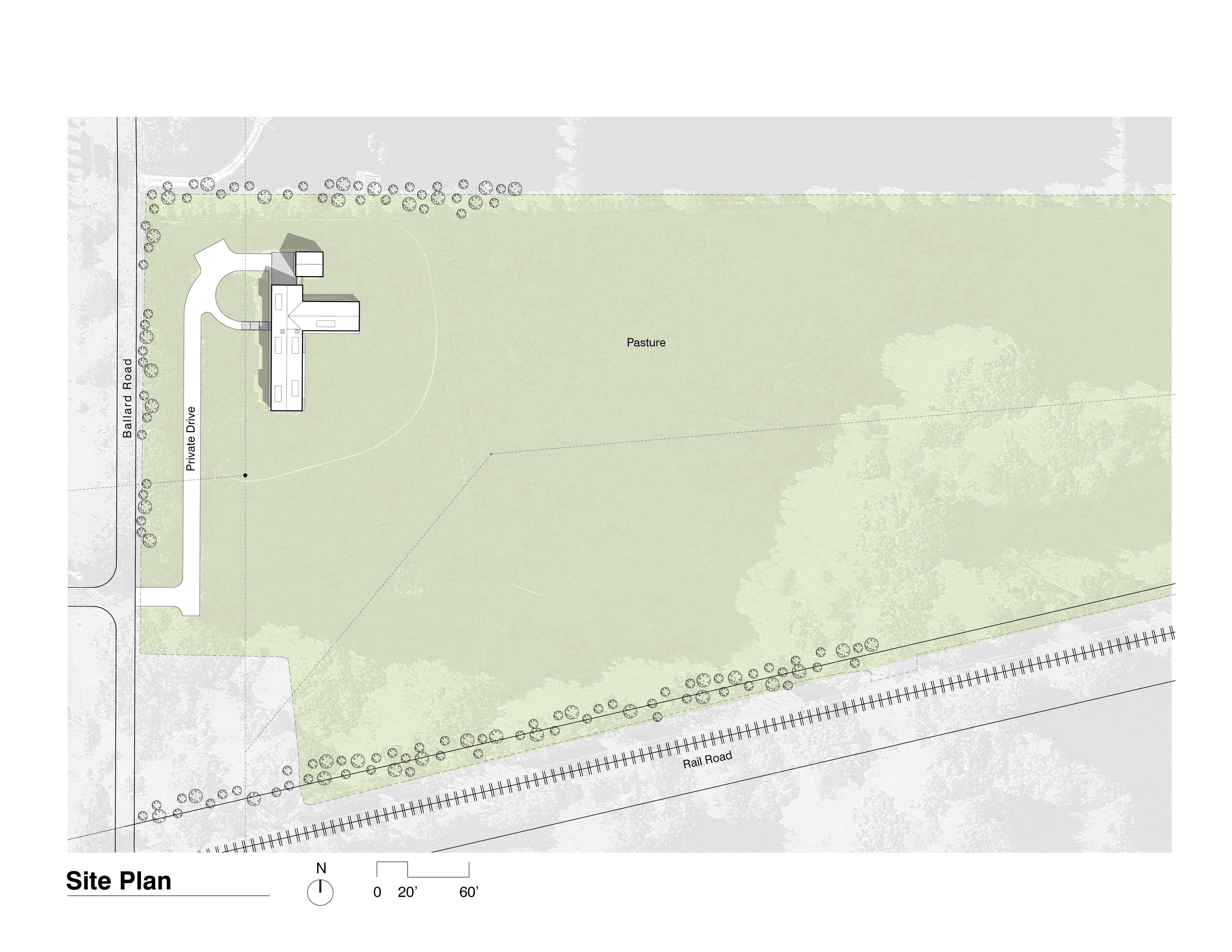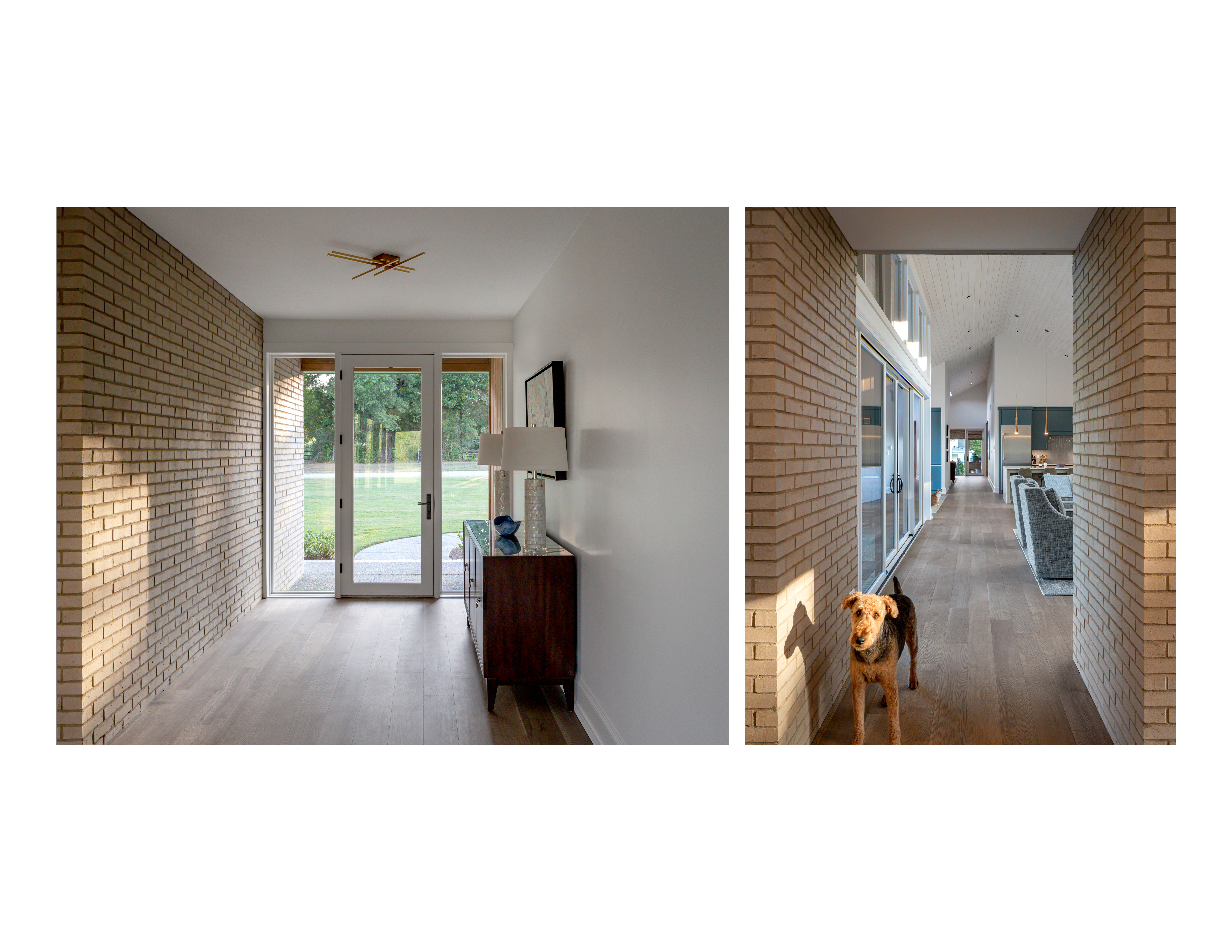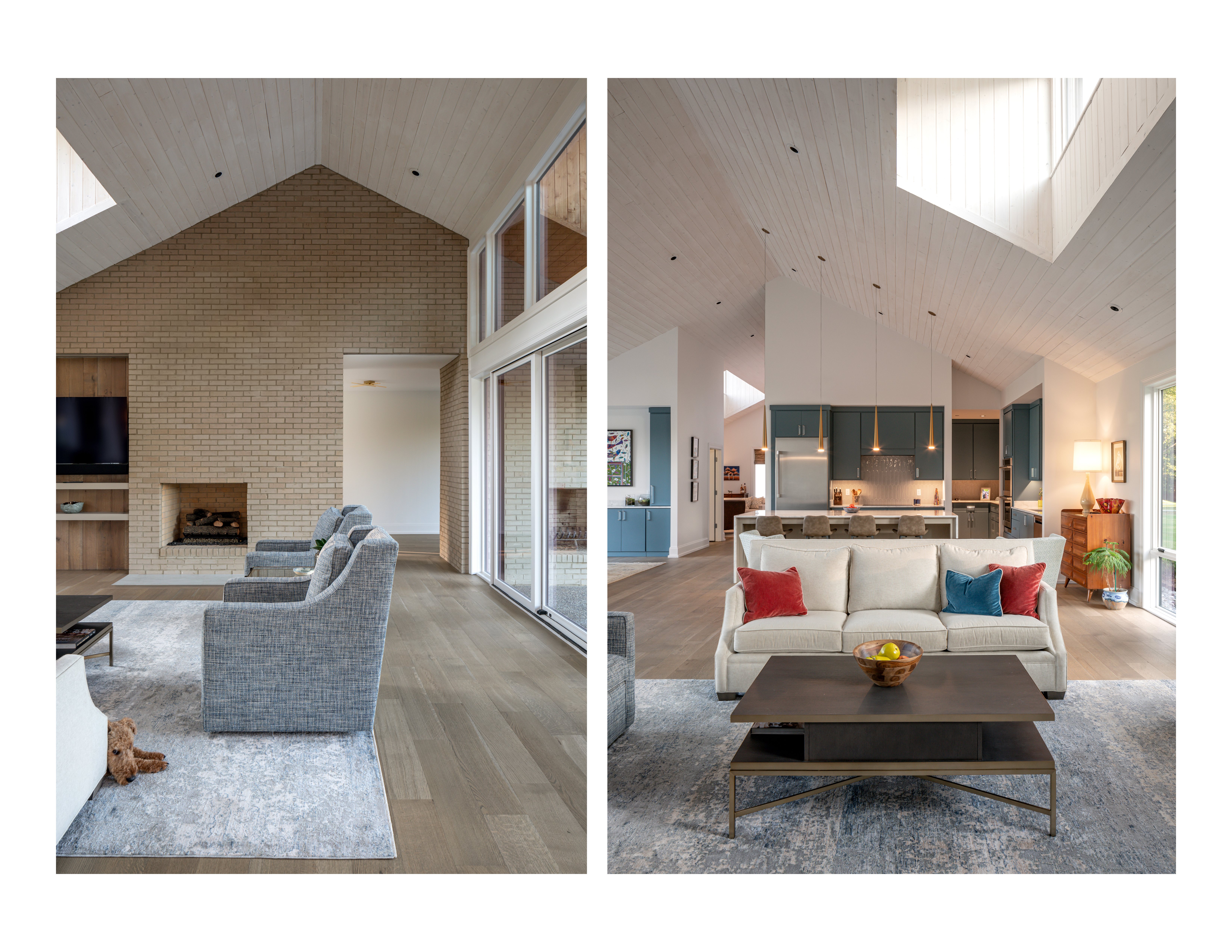 The home is comprised of two intersecting bars of program, one housing the more public living areas and the other a private master wing. At the intersection of the two bars, a framed view of the pasture defines the entry sequence. Contrasting the intentionally compressed ceiling of the entry hall, the living spaces have high vaulted ceilings of whitewashed wood punched by dormers that flood the space with natural light. The open floor plan is anchored by a floor to ceiling brick wall and windows that blur the boundary of interior and exterior.