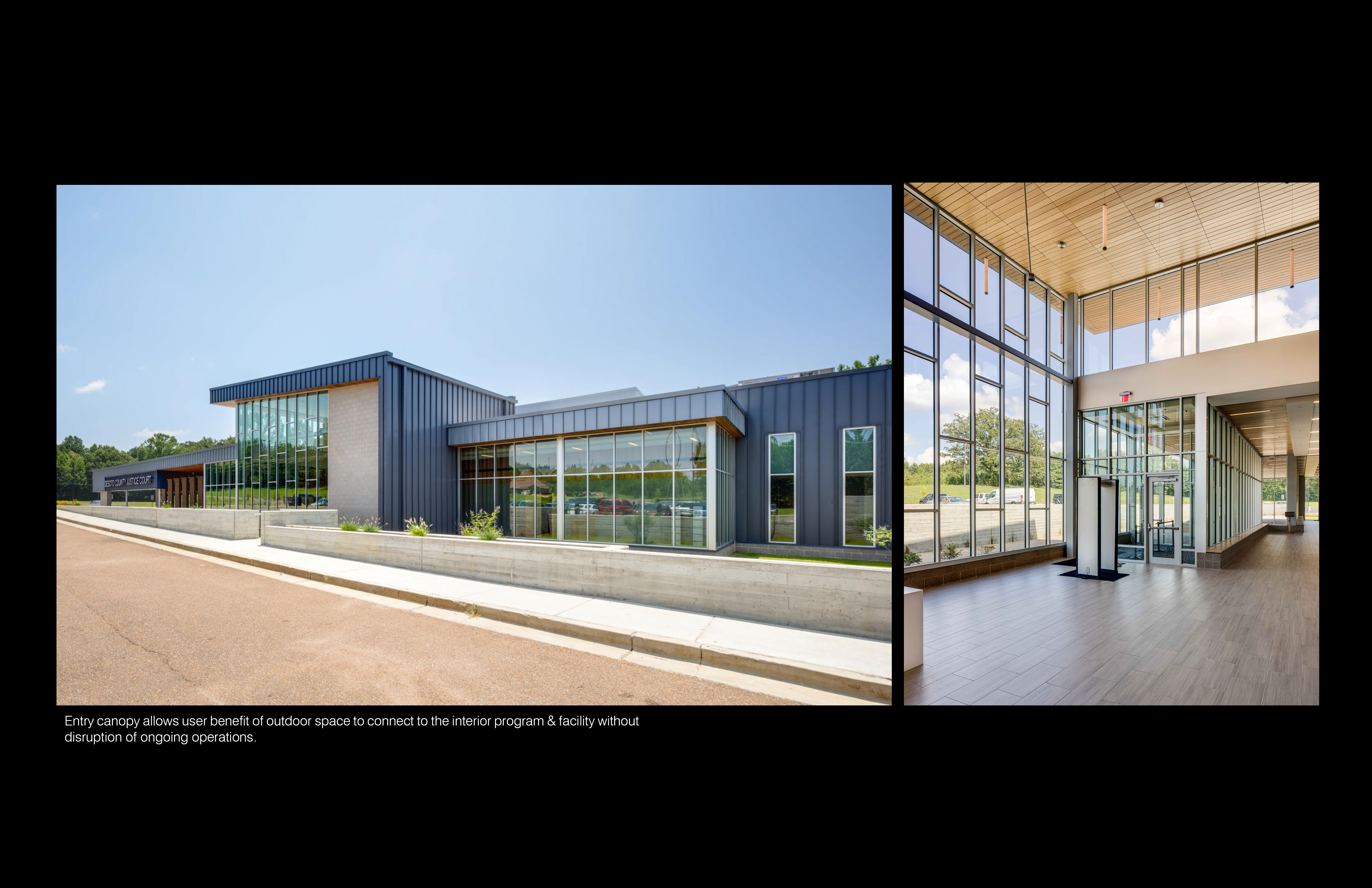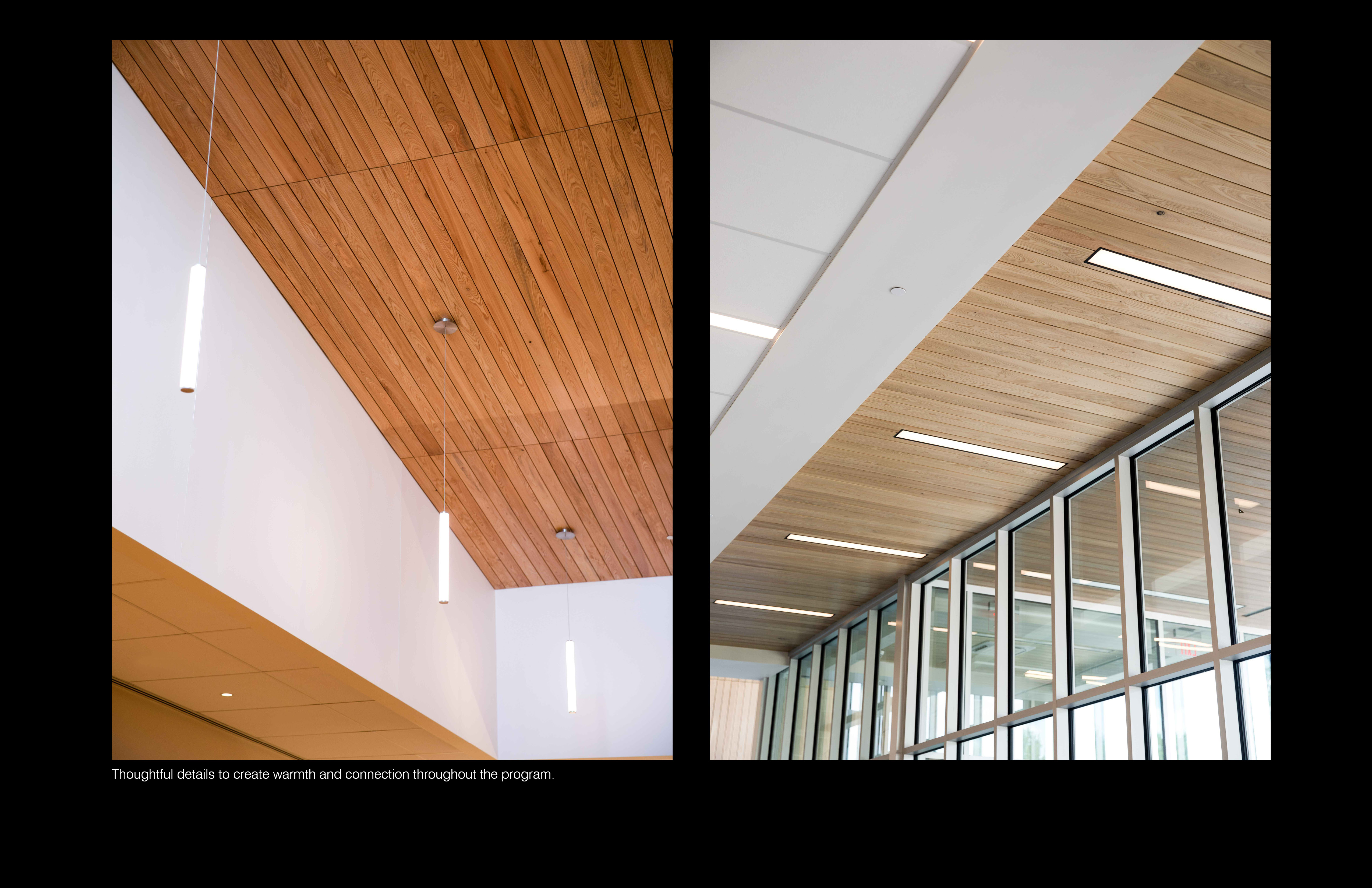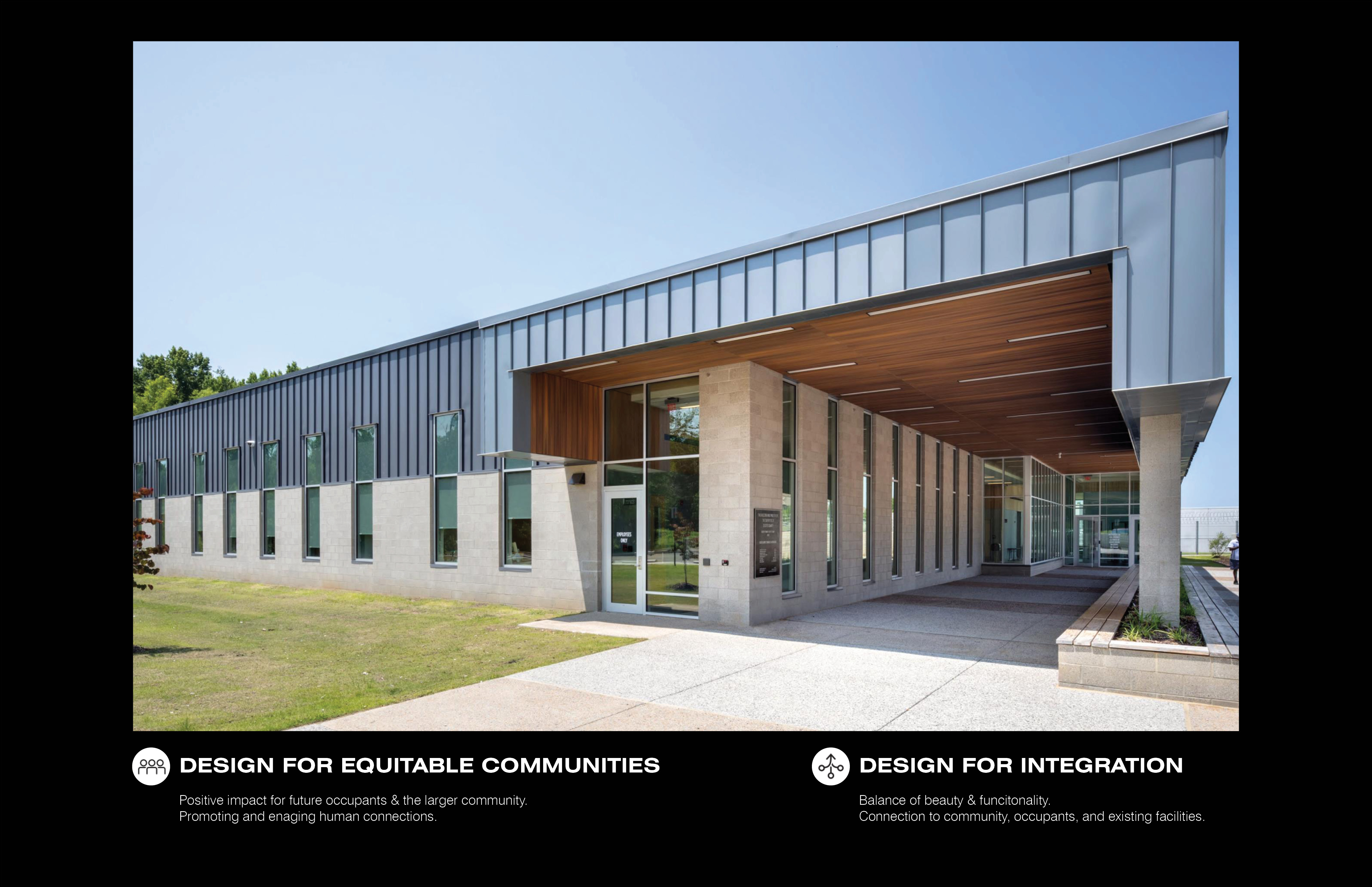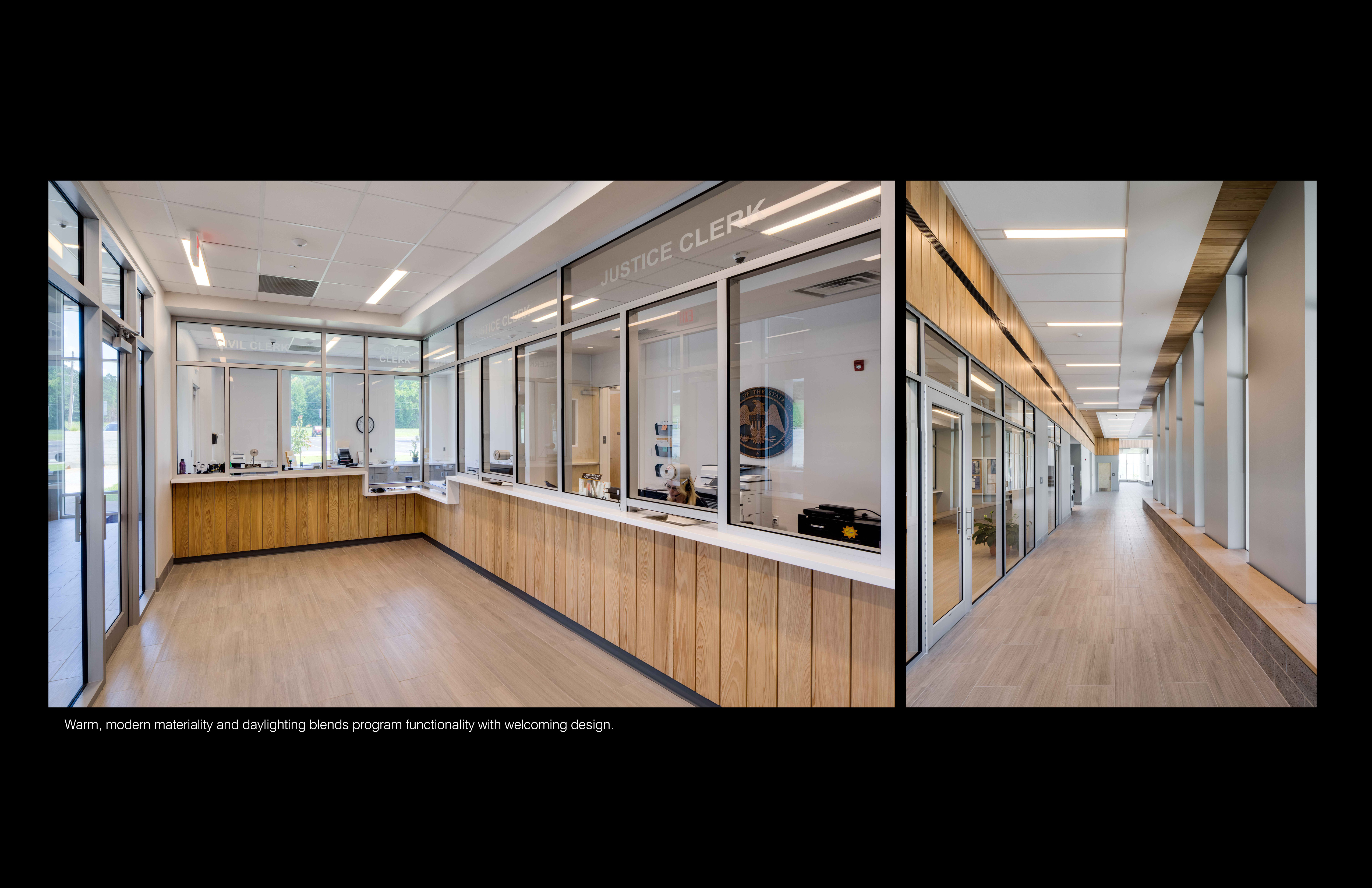 The DCJC sits prominently at the terminus of the approach drive and parking lot. Included within the building are two identical courtrooms which seat approximately 200 occupants each. In order to utilize the site, without compromising security or privacy, the roof is lifted above each courtroom to provide northern daylight into the space. The glassy entry and waiting lobbies are also positioned to utilize northern daylight. While the building does not shy from projecting a space of authority, the interior seeks to promote natural tone materials that give timeless design to the community. Court Clerk offices, judges’ offices, and a visitation center complete the program.