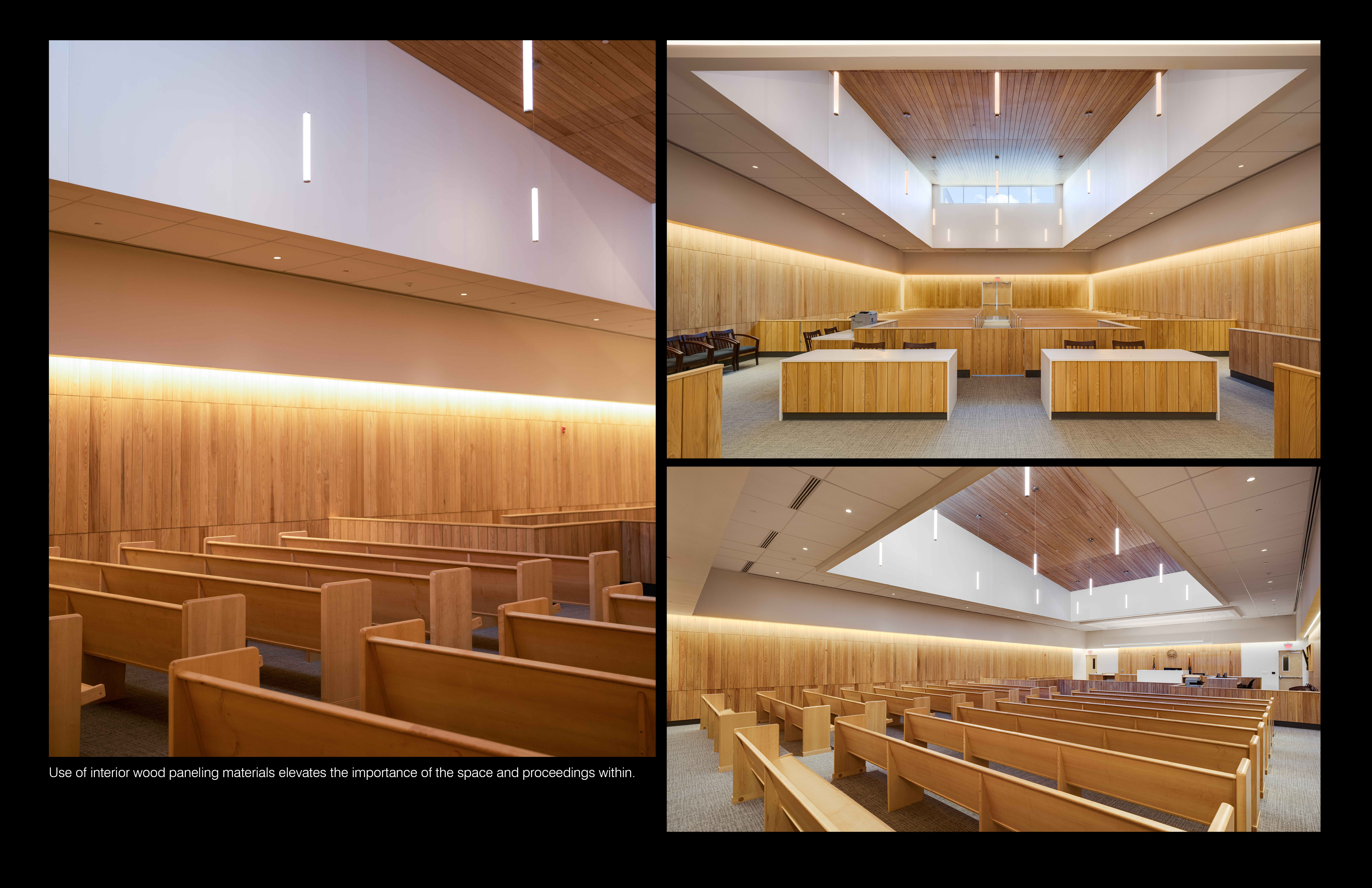 8 - The roof of each courtroom is lifted to elevate the volume of the space and provide natural light from the clerestory glass. Photos by Chad Mellon.