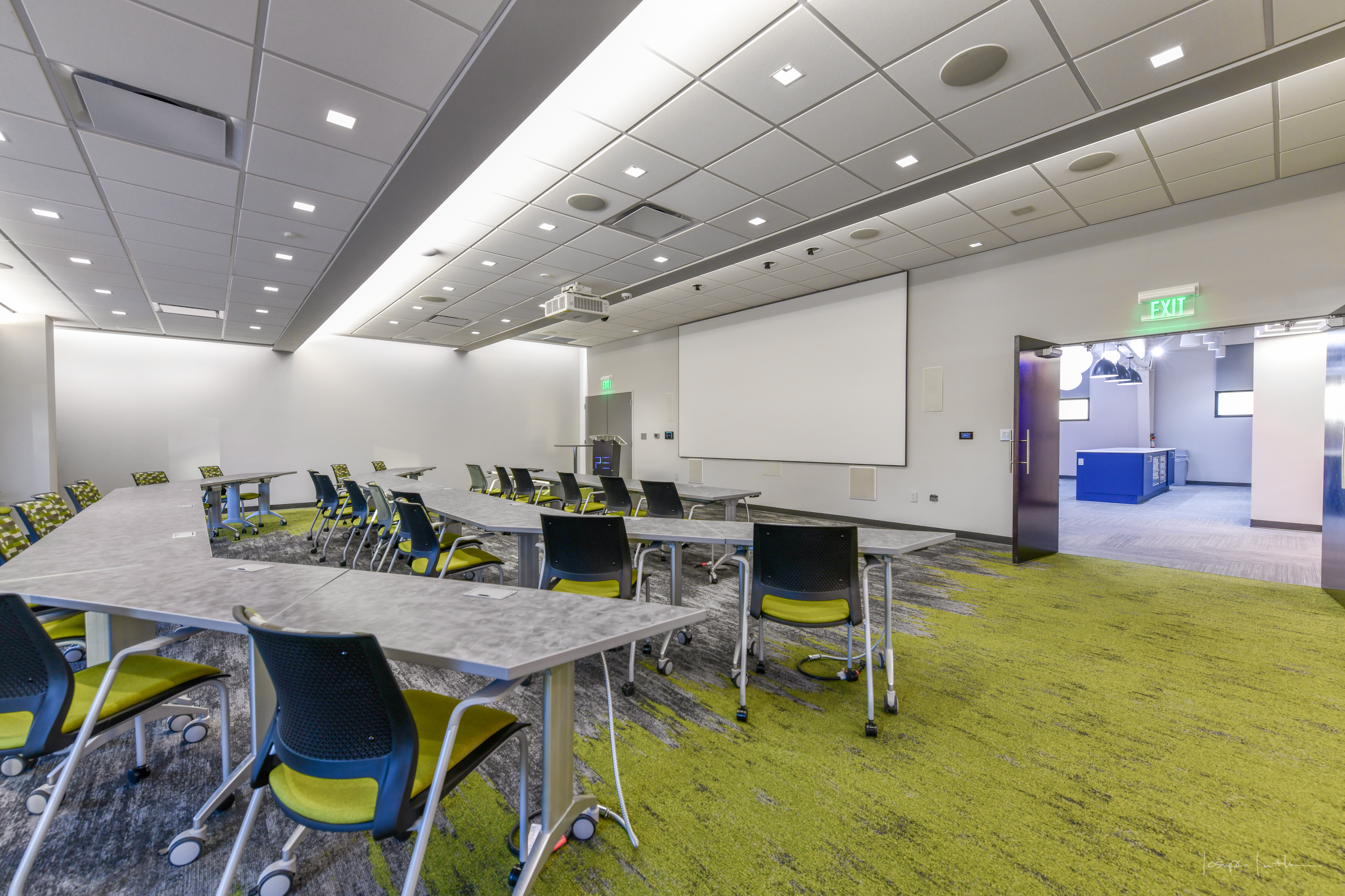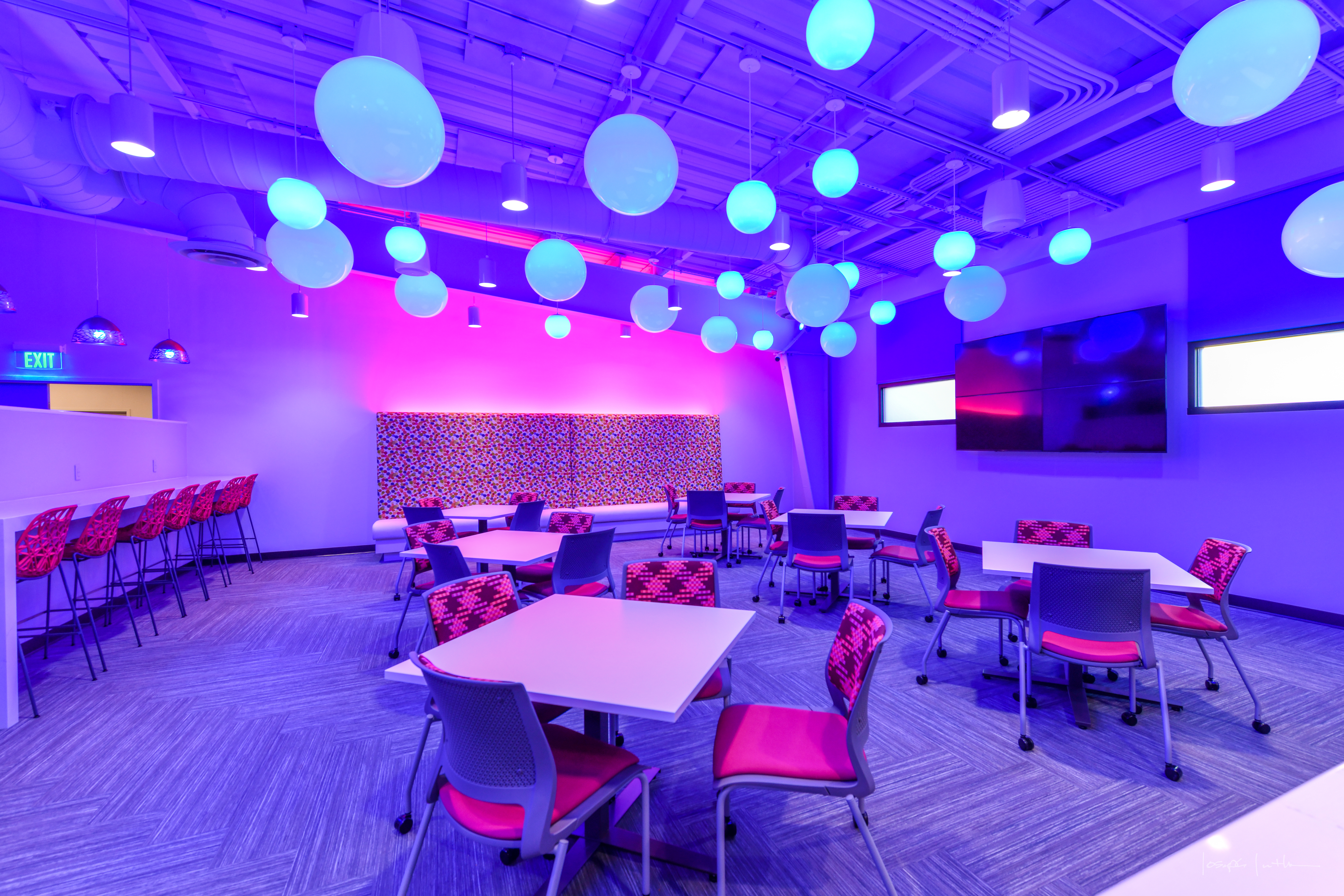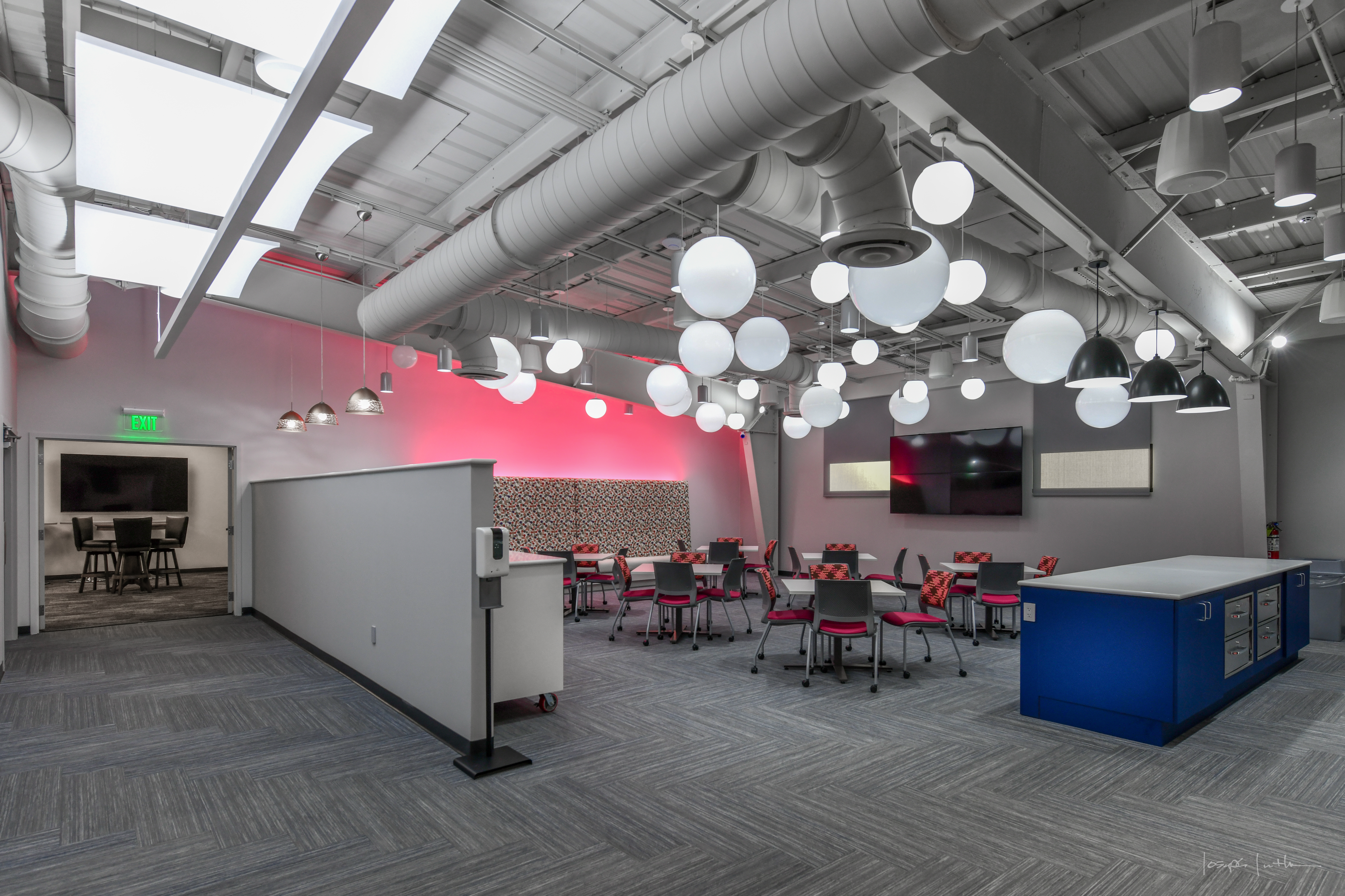 ETFC and PELC collaborated throughout the design process to ensure an optimal lighting experience. The team integrated the sophisticated controls for the lighting and top-of-the-line technology throughout the building, including programmable motorized shades and lighting that maximizes natural daylight throughout every facet of the interior or, when needed, provides immersive experiences for presentations or movie nights. Carpeting and finishes are vibrant and bold—each carefully-planned to ensure all light fixtures and design finishes are portrayed correctly.