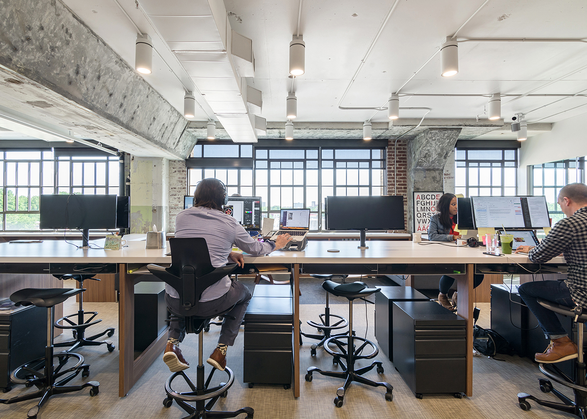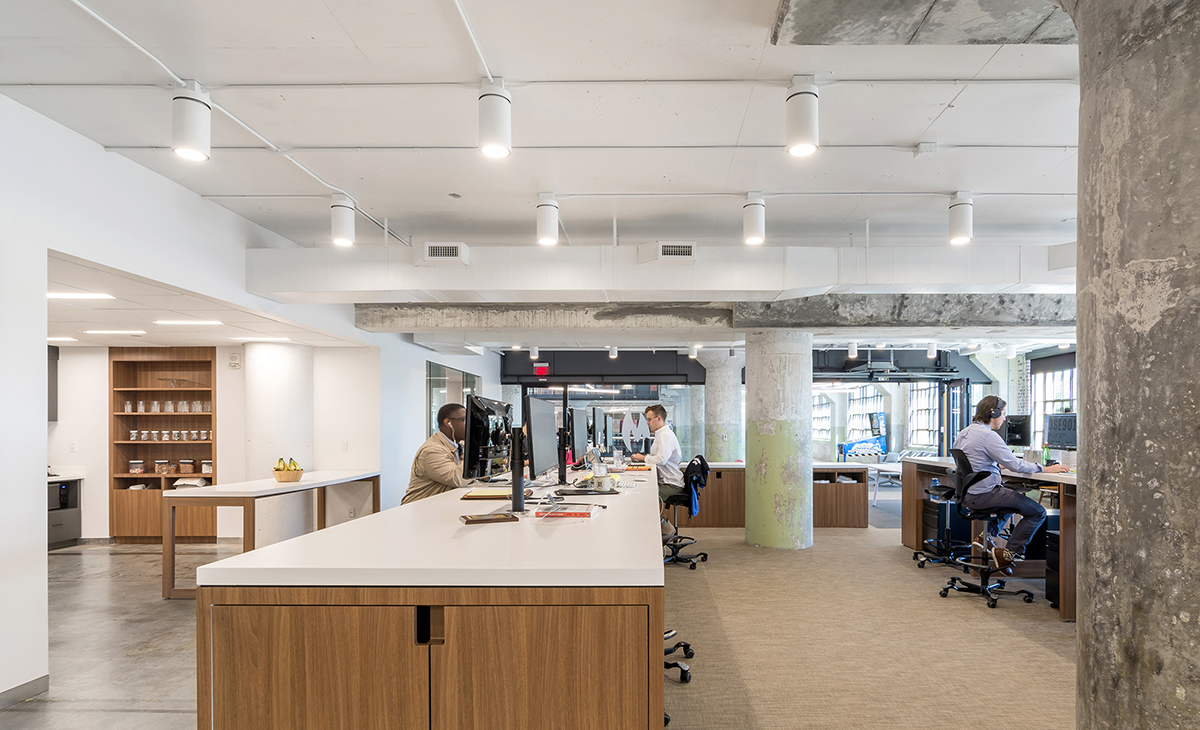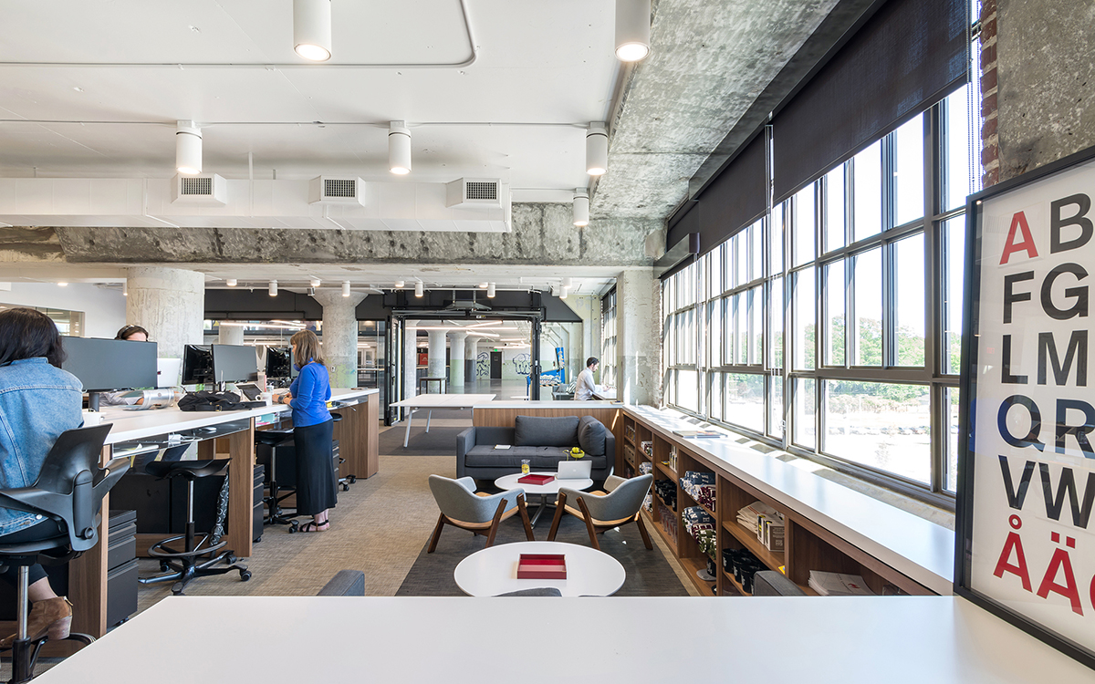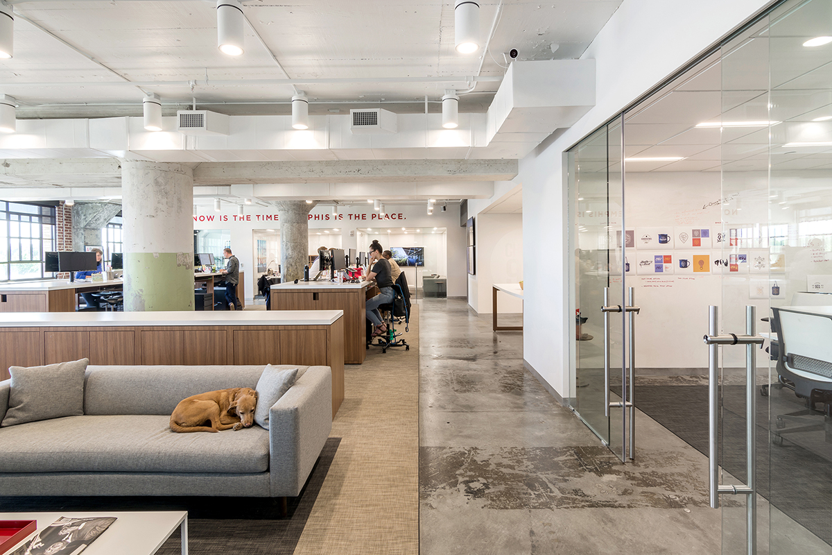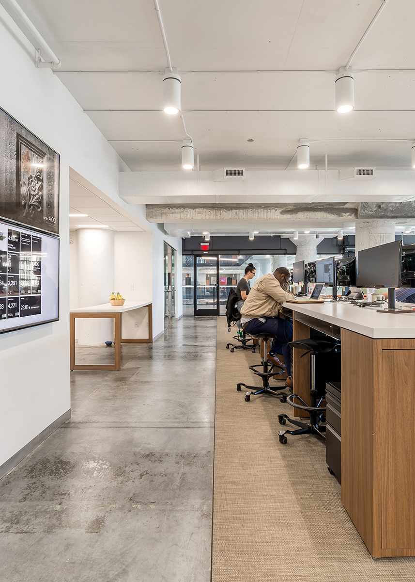 The office space is bounded to the south by the warehouse’s windows and to the east by a large public atrium. The project’s design strategy directly connects an open office area with the public atrium, then furnishes the open office with a field of workspace choices. A series of spliced, woven carpets, are used to define the collaboration zones within the open workspace. The flexible zones are positioned to take advantage of the natural daylight and views of the city. The carpet and furniture spill out into the public atrium beneath a frameless glazed storefront with a large glass garage door, creating a front porch and opening the interior of the organization up to the community. Offices and multi-use meeting spaces form an “L” around the open workspace, framing connections between collaborators and the public. The design reflects the image of an organization committed to the community while providing diverse workspaces for an agile staff.