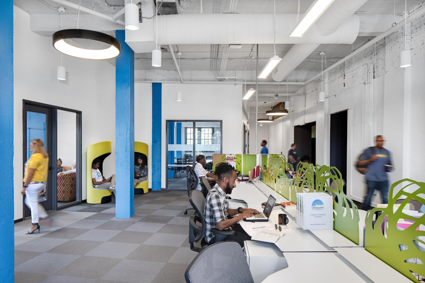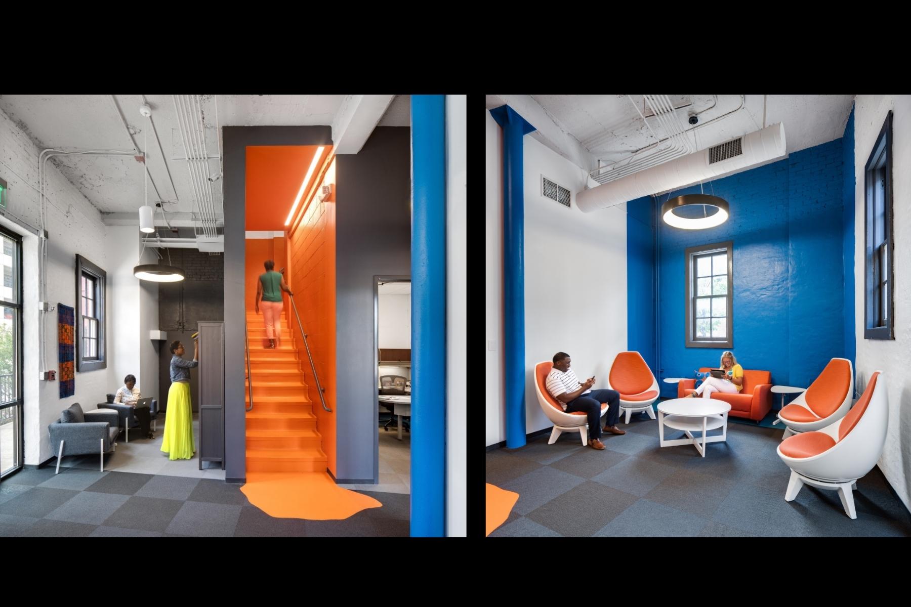 The solution was to lighten the interior through a refreshed palette and spark creativity with touches of bold color. Interior glazing enhanced natural light and LEDs further expand the once-darkened space while prioritizing exterior views. Exposed interior brickwork adds to the historic charm and balances the new, light materials with the sturdy structural elements. Other interior improvements include the use of color and pattern arrangements to strategically define, link, and enhance workspaces. A new elevator connects the two floors, and all new mechanical, electrical, and plumbing with various system controls such as daylight and occupancy sensors were installed.