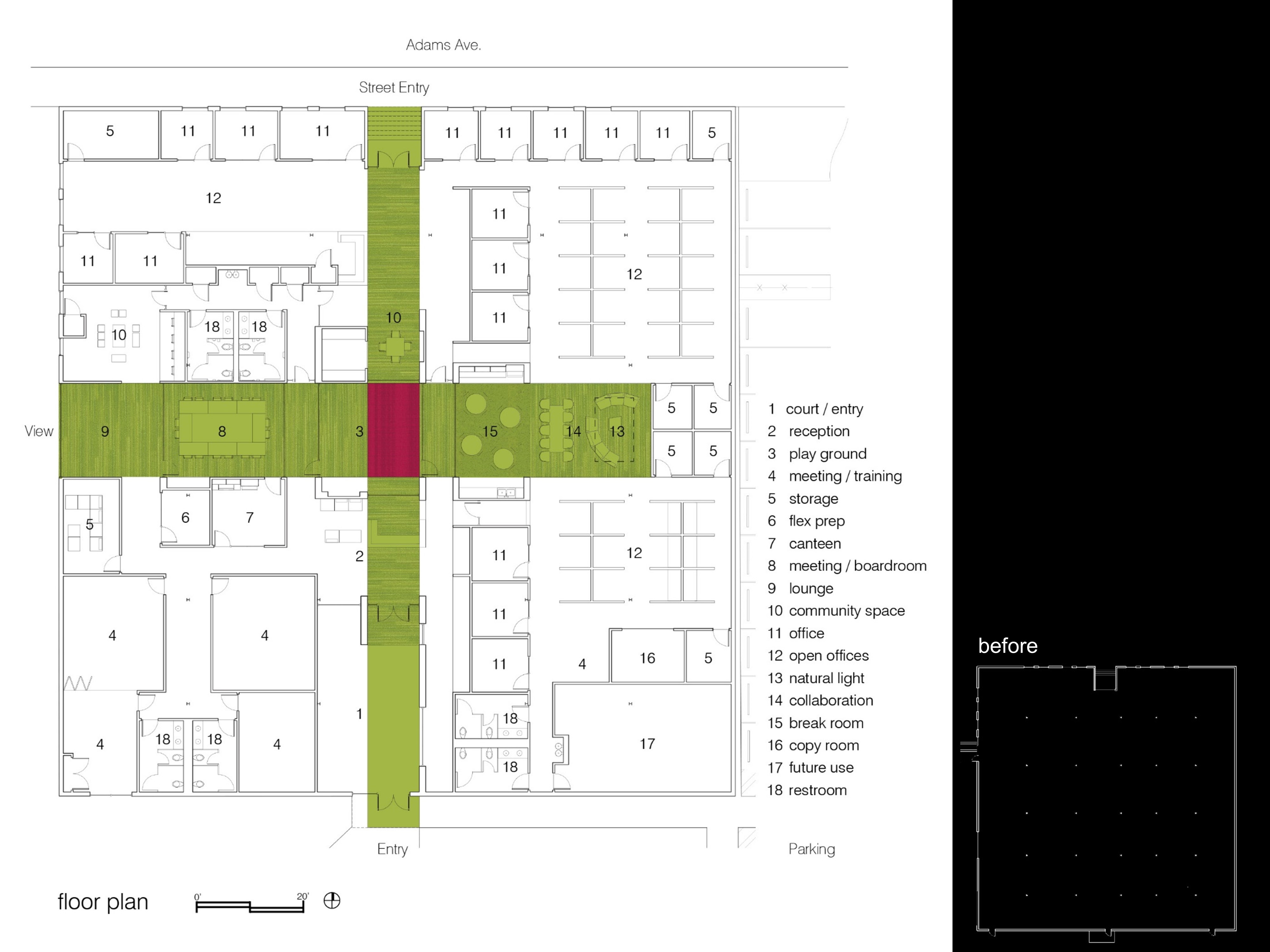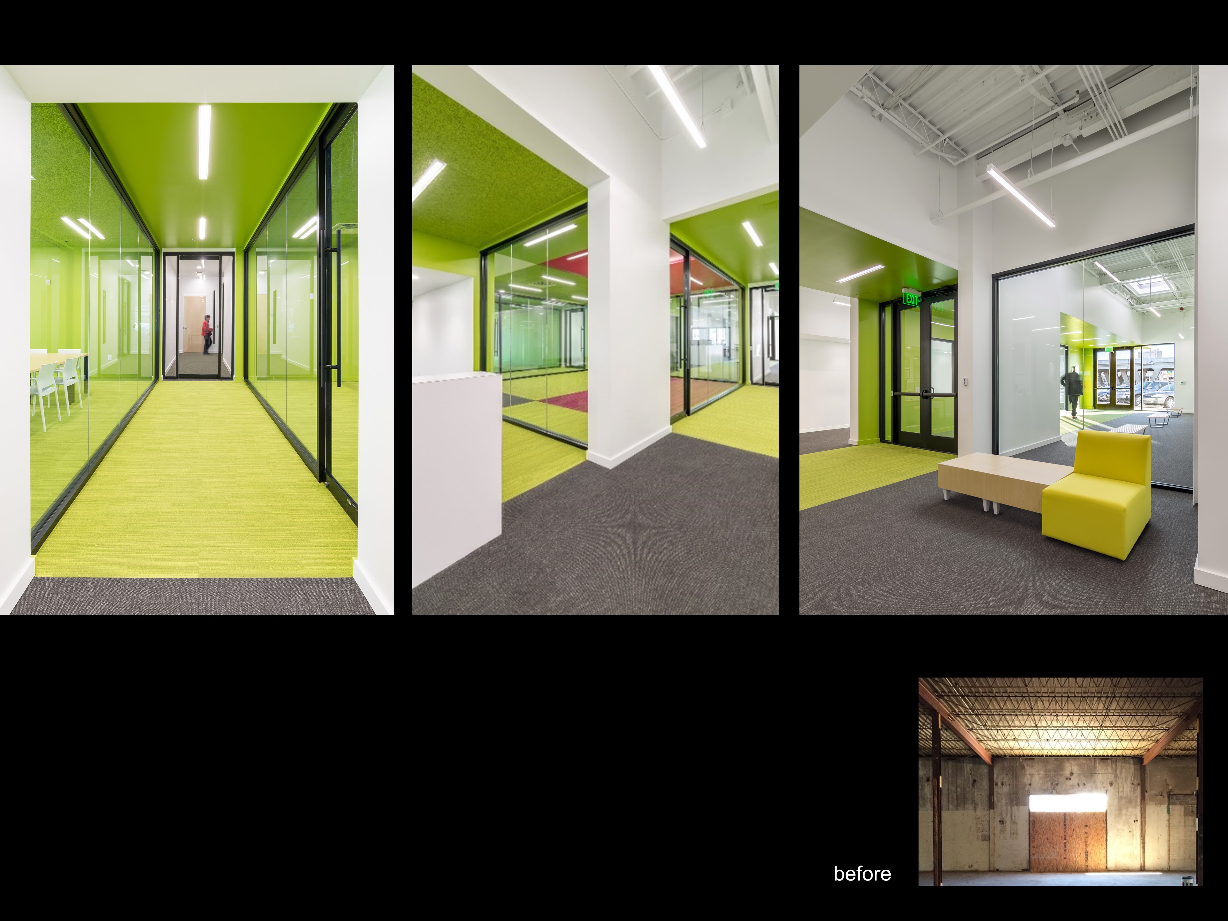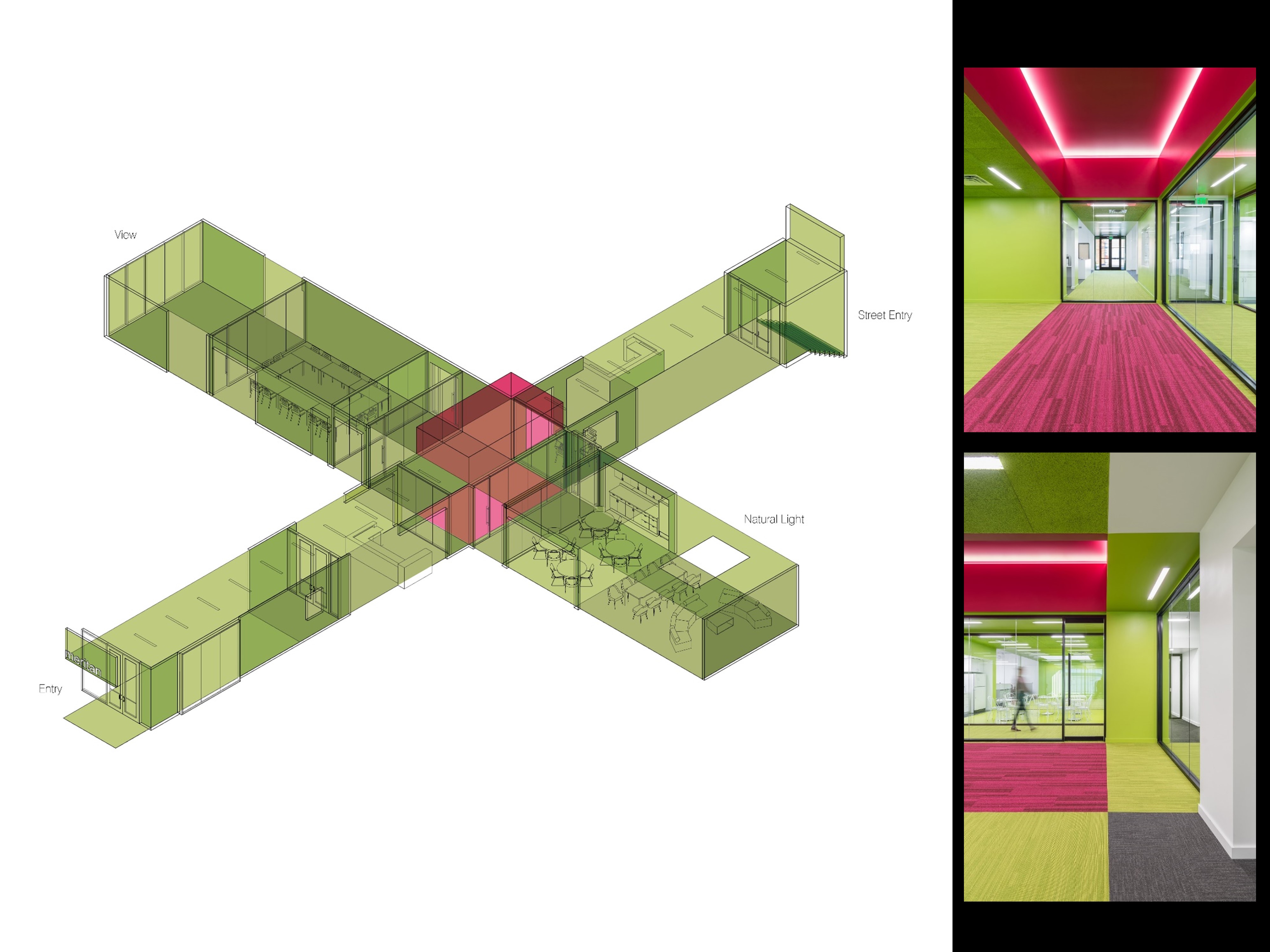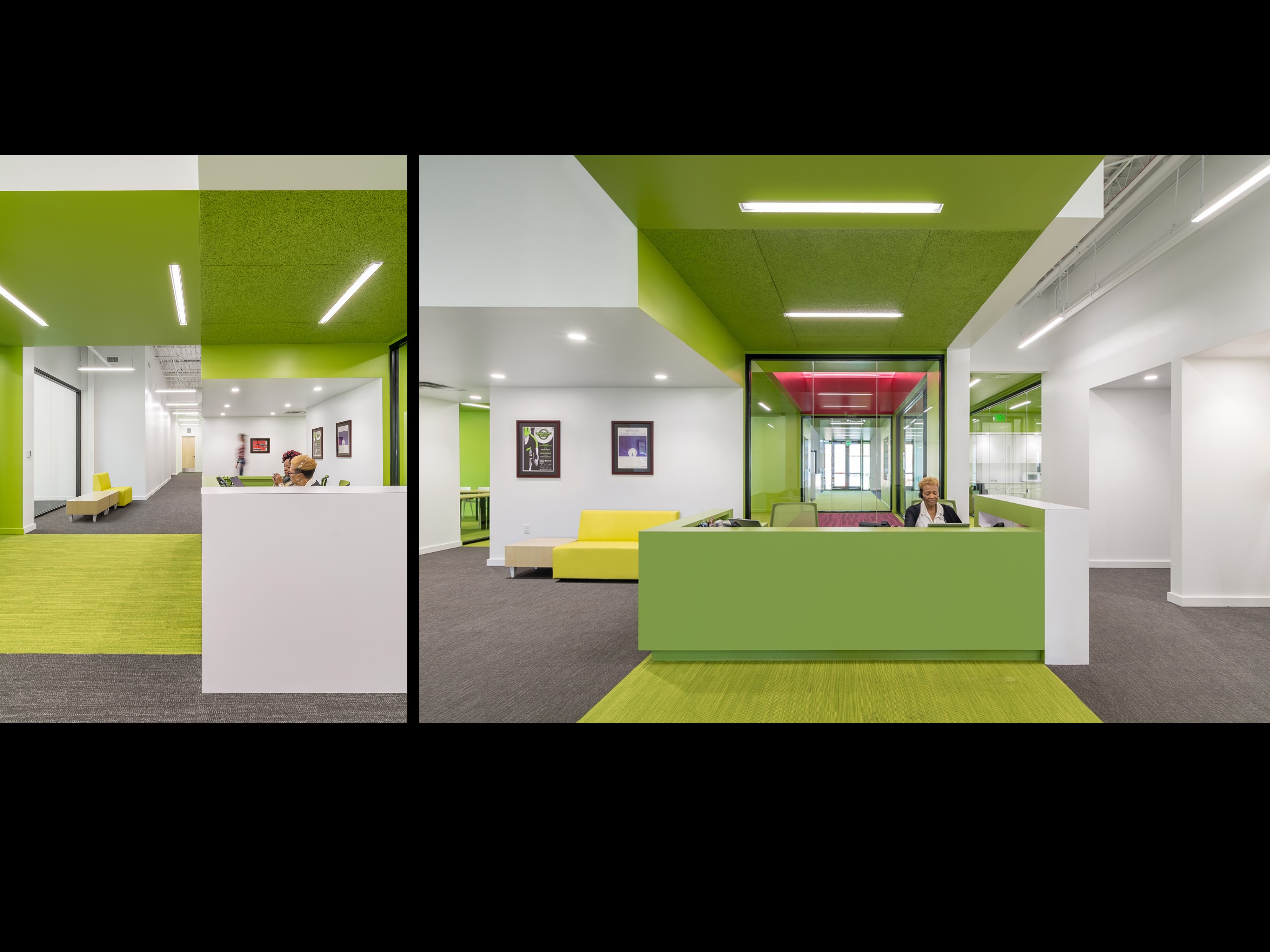 The design strategy for this renovation project relies heavily on two simple strategies. The first is opening the space up to allow for sight lines all the way through the building in two directions—resulting in outside views in three of four directions while standing at the center of a square building. This strategy also allows natural light to enter deeply into the building via large expanses of floor-to-ceiling glass wall divisions, five layers deep. The second tactic is a bold use of color, which reacts to the project’s tight budget. The idea began as an insistent imposition of the color greenalong the flat surfaces of a pair of 120’ green view tunnels. The green tunnels intersect perpendicularly at the center of the building, which is emphasized by a contrasting magenta color on the ceiling and floor surfaces. This space is significant programmatically, as it is a safe play space for children to wait and play while adults discuss their care. The two-dimensional layer of color played out in interesting ways within the imperfections of the rough tenant infill project—translating from paint into carpet and millwork where needed. The intersecting view tunnels create a collage of reflection and transparencies against the rest of the stark white and grey space.