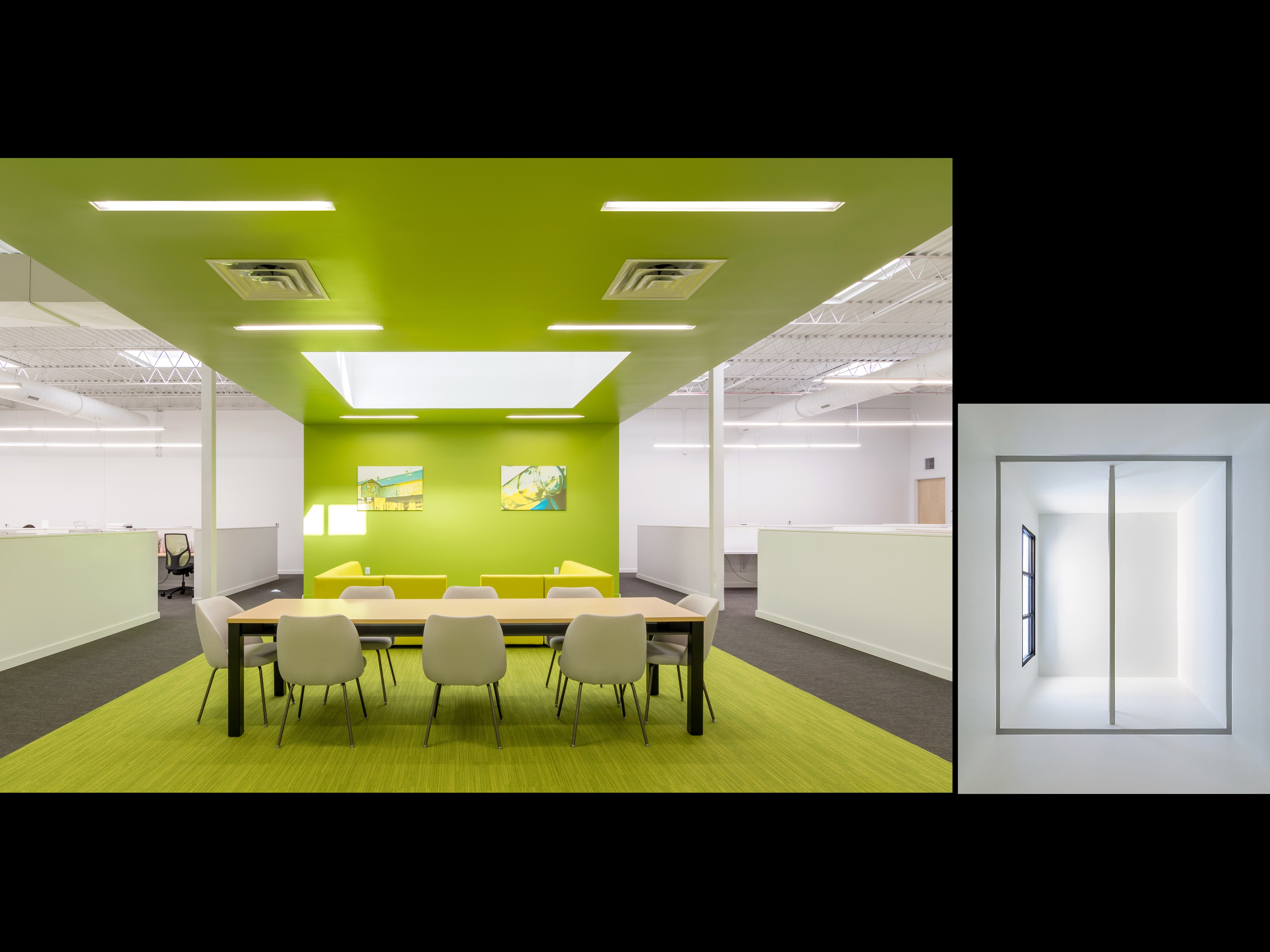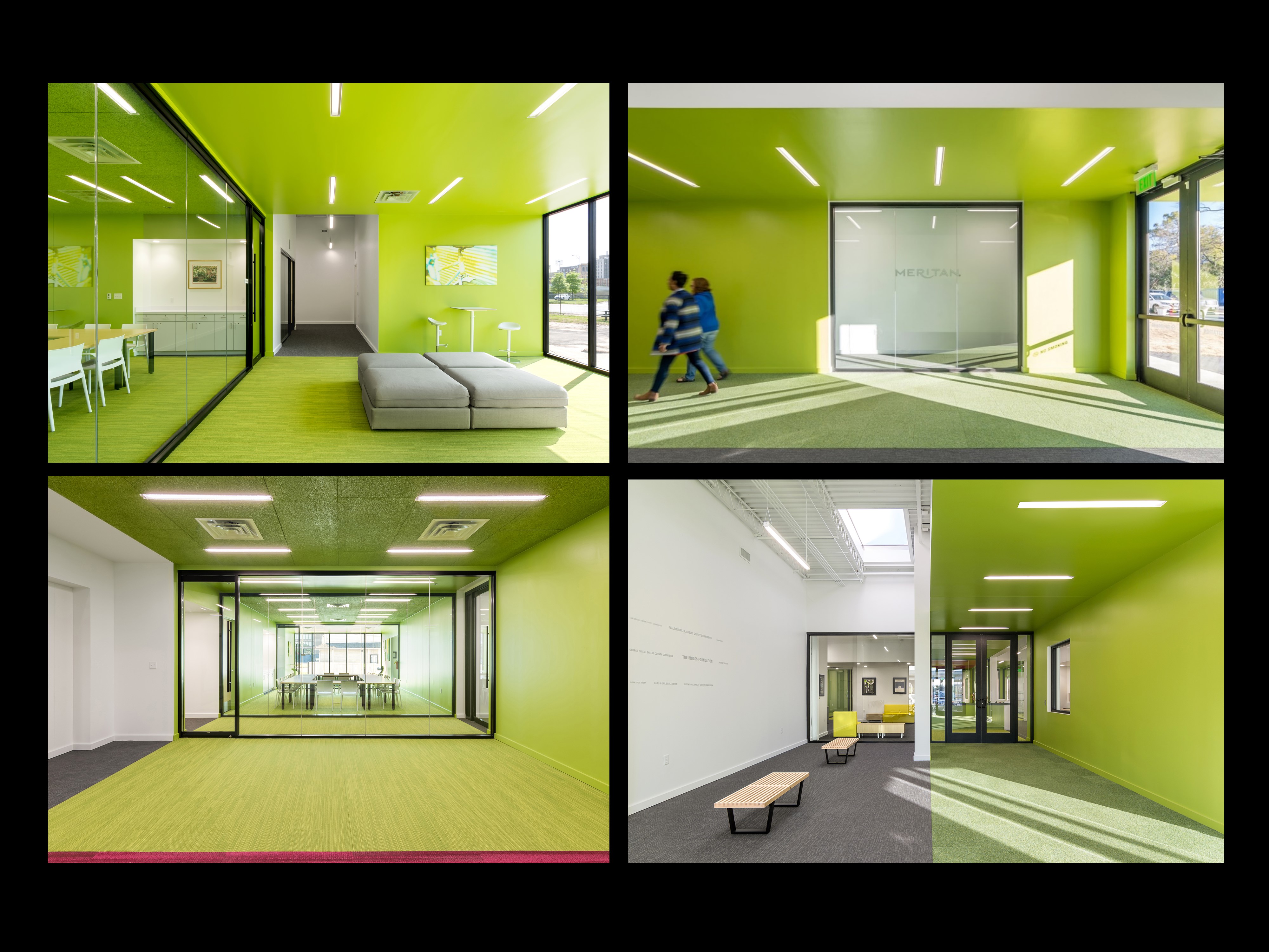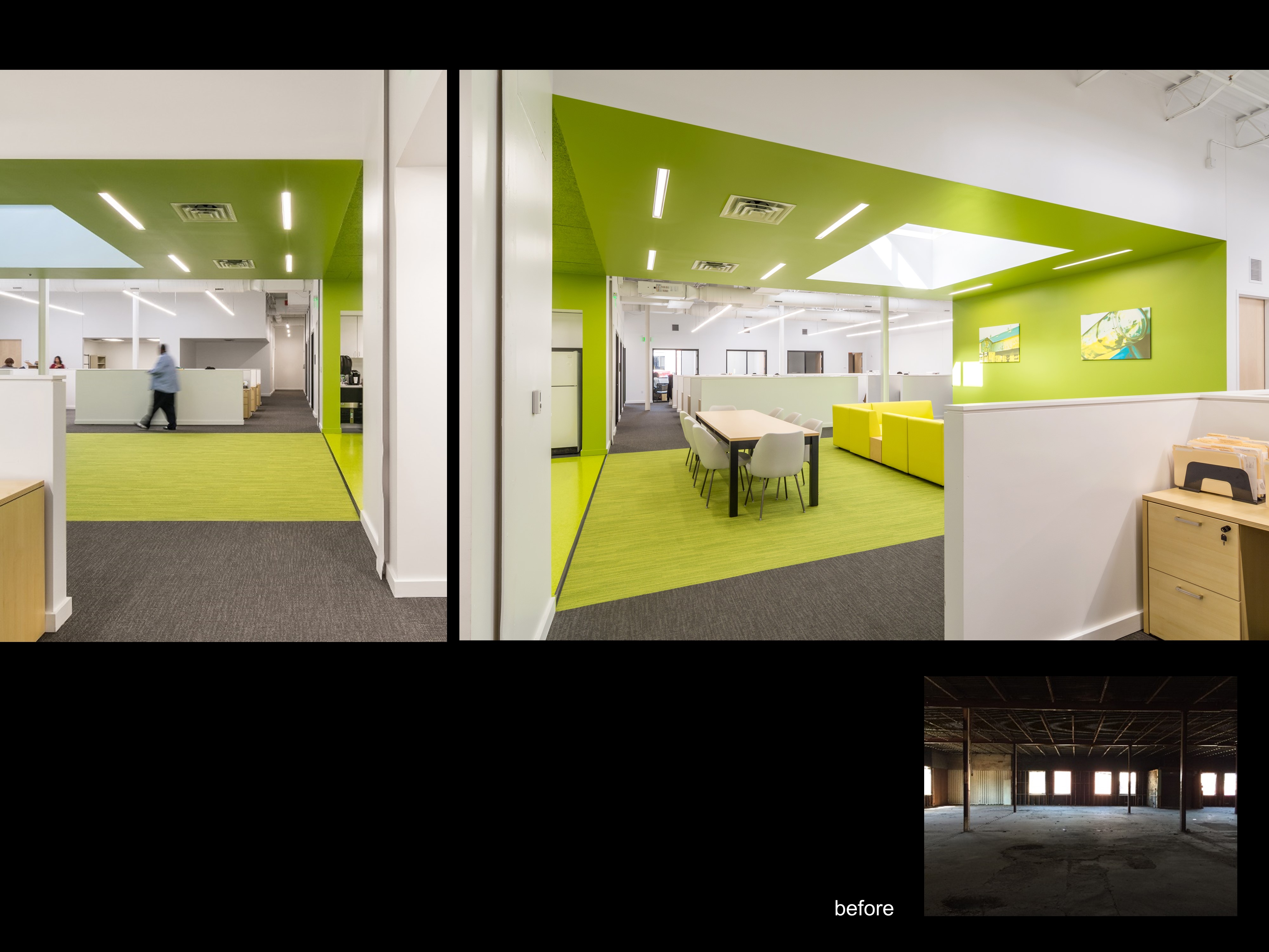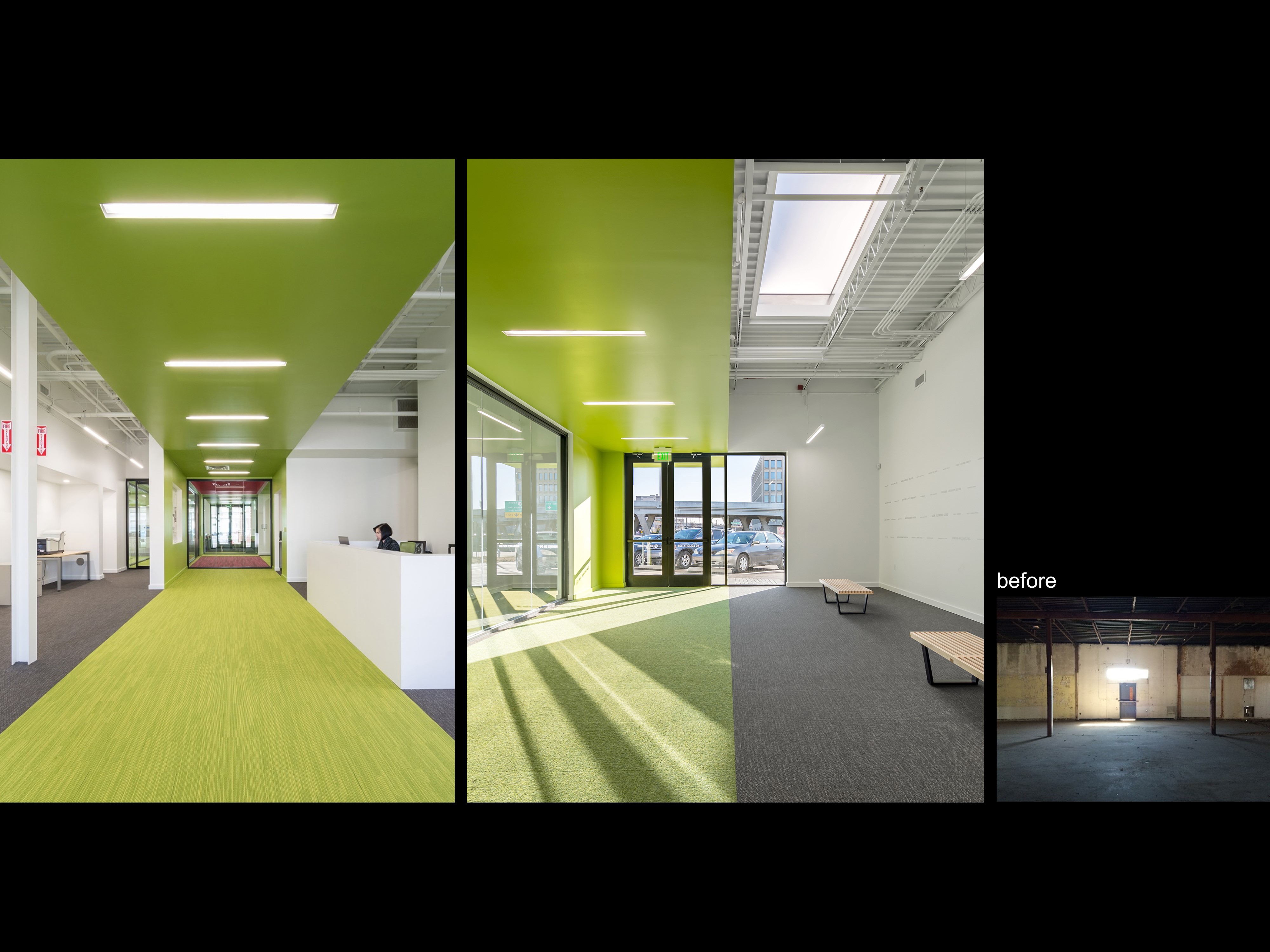 The design strategy for this renovation project relies heavily on two simple strategies. The first is opening the space up to allow for sight lines all the way through the building in two directions—resulting in outside views in three of four directions while standing at the center of a square building. This strategy also allows natural light to enter deeply into the building via large expanses of floor-to-ceiling glass wall divisions, five layers deep. The second tactic is a bold use of color, which reacts to the project’s tight budget. The idea began as an insistent imposition of the color greenalong the flat surfaces of a pair of 120’ green view tunnels. The green tunnels intersect perpendicularly at the center of the building, which is emphasized by a contrasting magenta color on the ceiling and floor surfaces. This space is significant programmatically, as it is a safe play space for children to wait and play while adults discuss their care. The two-dimensional layer of color played out in interesting ways within the imperfections of the rough tenant infill project—translating from paint into carpet and millwork where needed. The intersecting view tunnels create a collage of reflection and transparencies against the rest of the stark white and grey space.