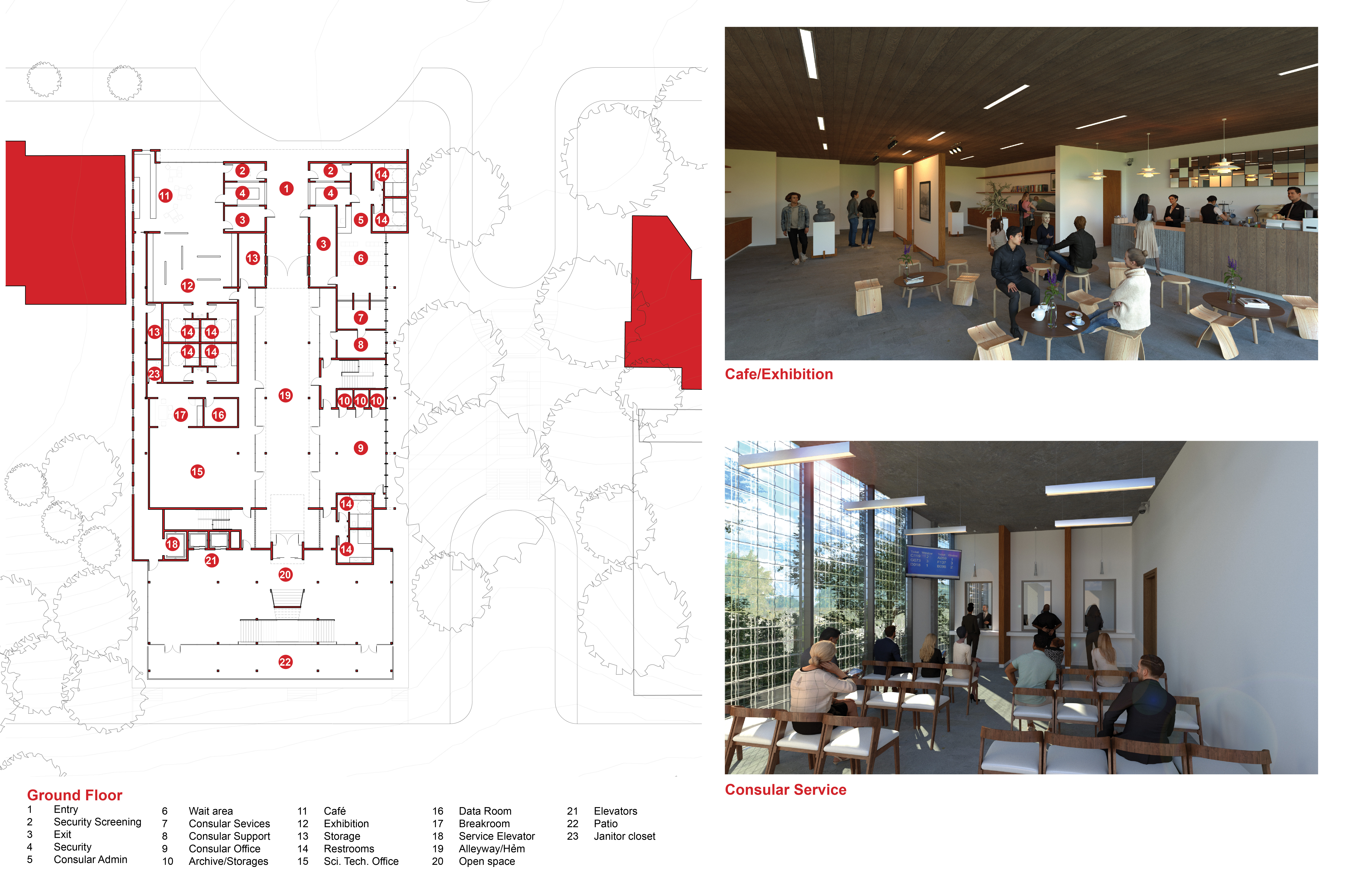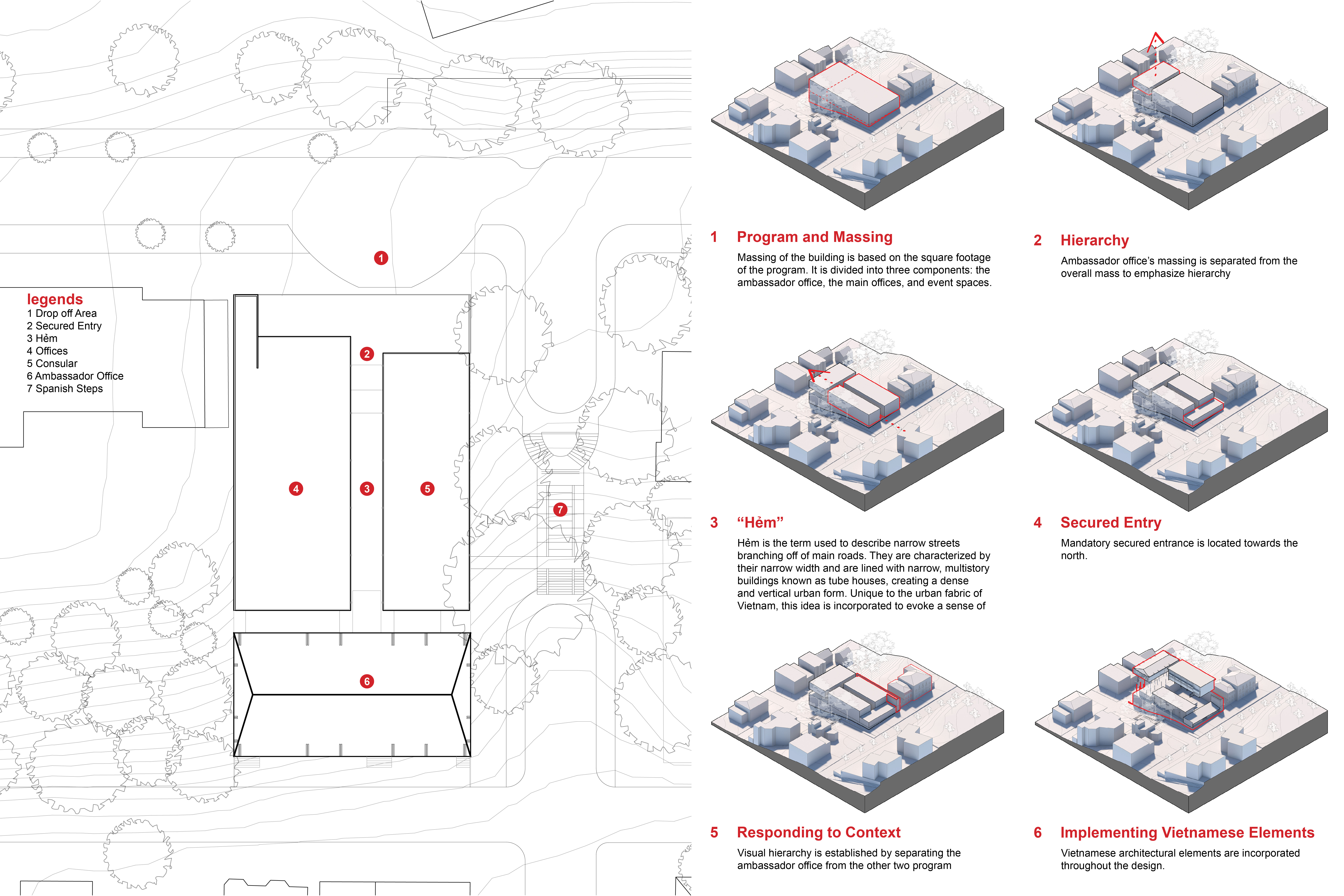 A nation’s architectural identity is bounded by its available materials, building technology, and most importantly, cultural identity. Through over a thousand years of colonization by the Chinese, and several decades of Western occupation, Vietnamese people have borrowed many aspects of these foreign cultures and developed them into their own expression. Today, Vietnamese architecture can be described as the continuous accumulation of architectural knowledge and history. These buildings have been the building block of contemporary vernacular Vietnamese Architecture. So much so that they have become the new identity of Vietnamese architecture. This design-research project proposes a new form for the Vietnamese Embassy in the United States of America that works within a studied framework of contemporary vernacular Vietnamese architecture. The proposed design will be the contemporary embodiment of Vietnamese identity through architecture in a western geopolitical context.