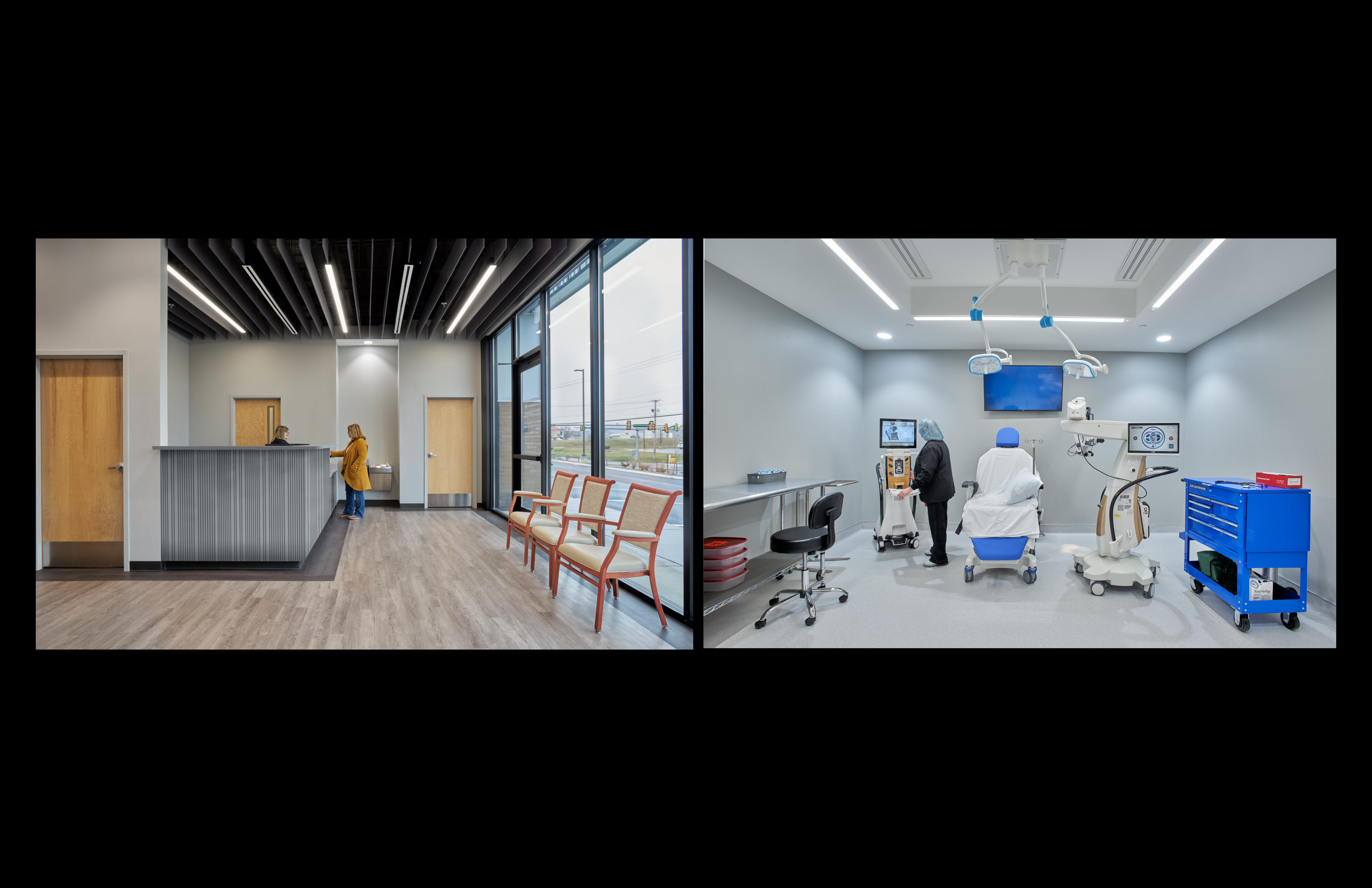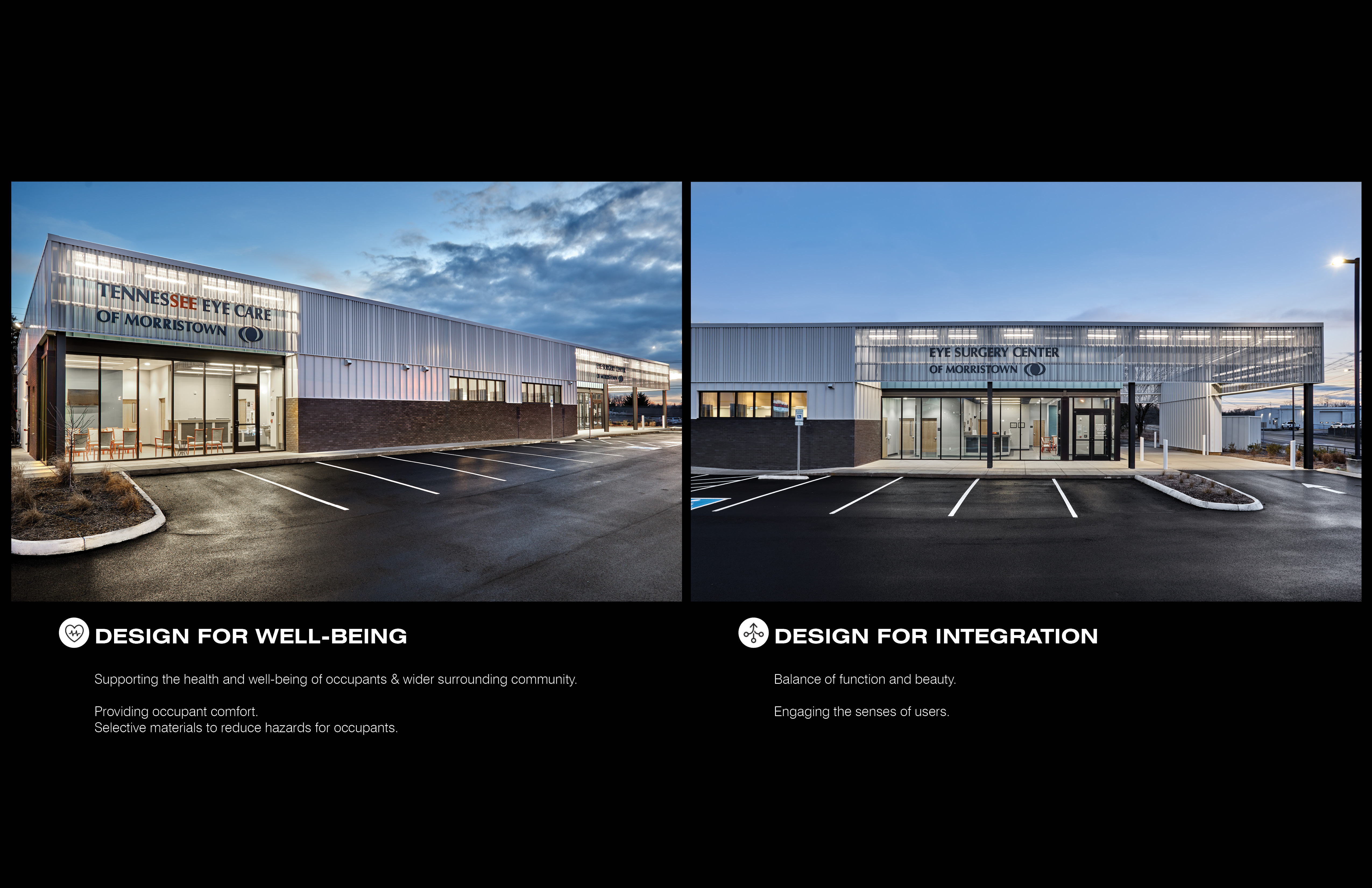 The building design splits a medical facility into two separate tenants that both focus on eye care. By working resourcefully with conventional construction techniques, the simple, rectangular form integrates resourceful, contemporary materials to create a facility that connects the community to the building. The front of the building is largely transparent in order to visually connect the occupants and the site. The backlit perforated metal facade illuminates the entries and the parking lot. This serves as a beacon to the community. A drive-thru drop-off is located at the end of the building adjacent to the surgery center entryway.